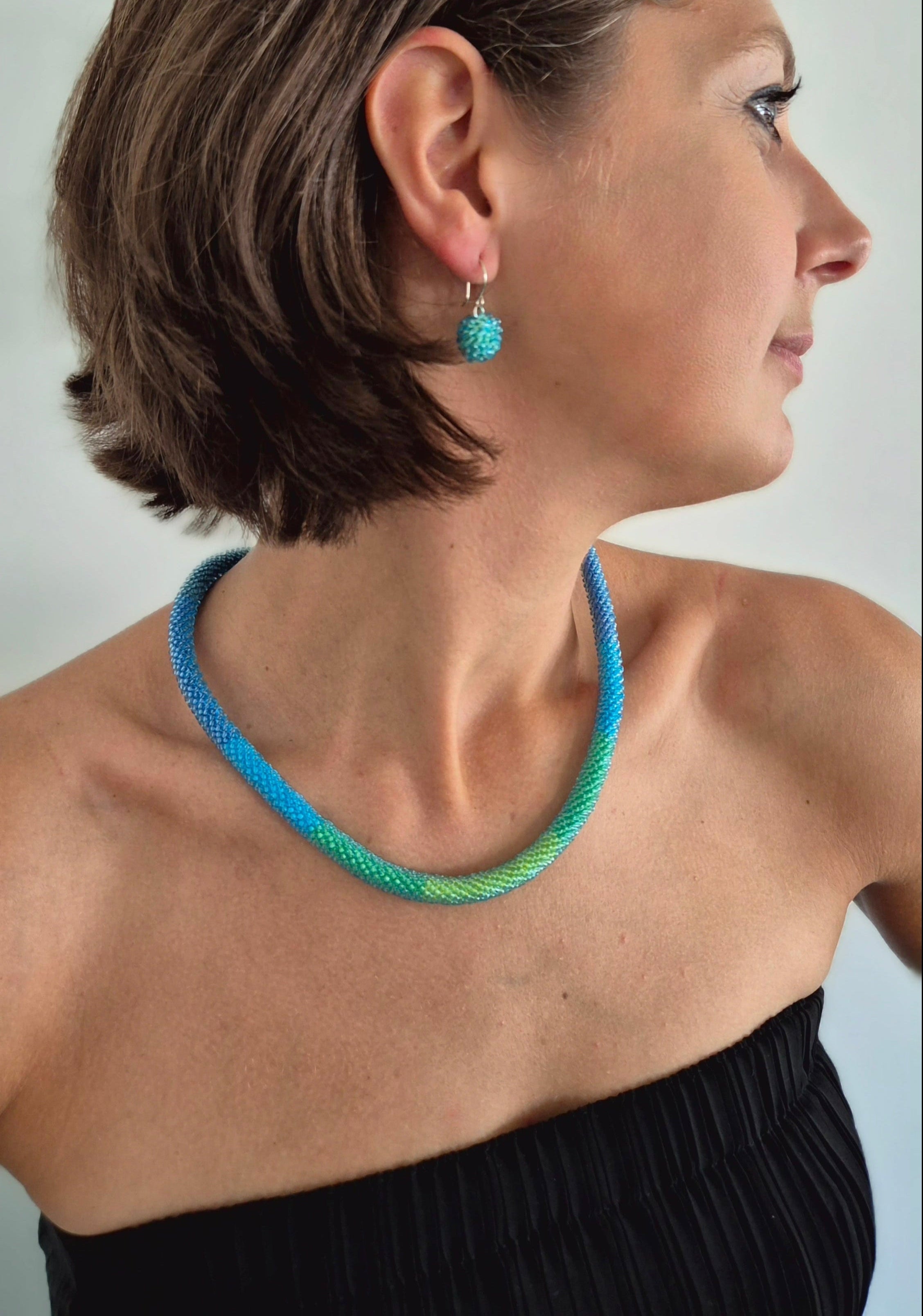Winzige tschechische & japanische Glasperlen auf handgefärbte Filetgarne aus mercerisierter Baumwolle gefädelt & gehäkelt