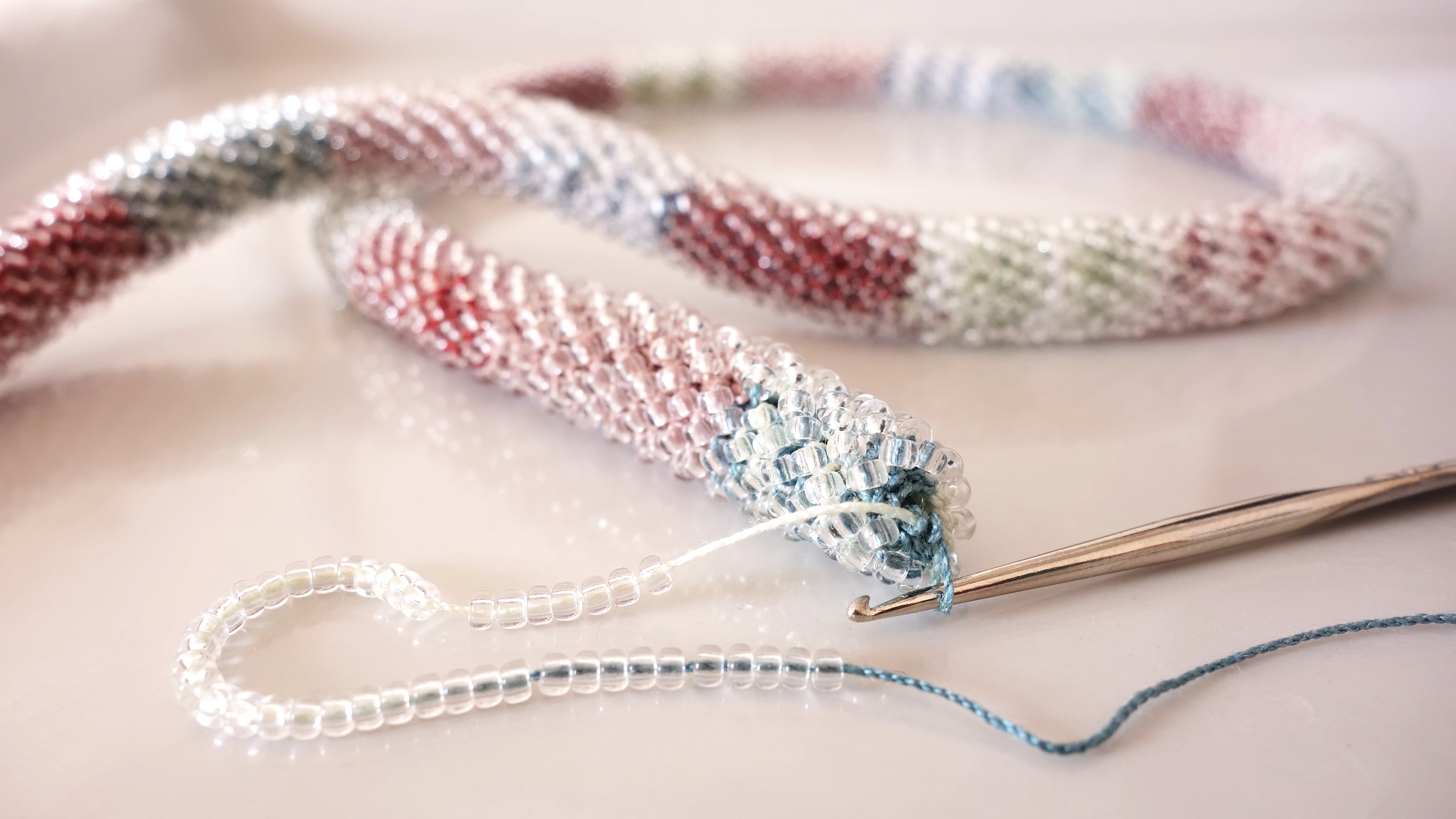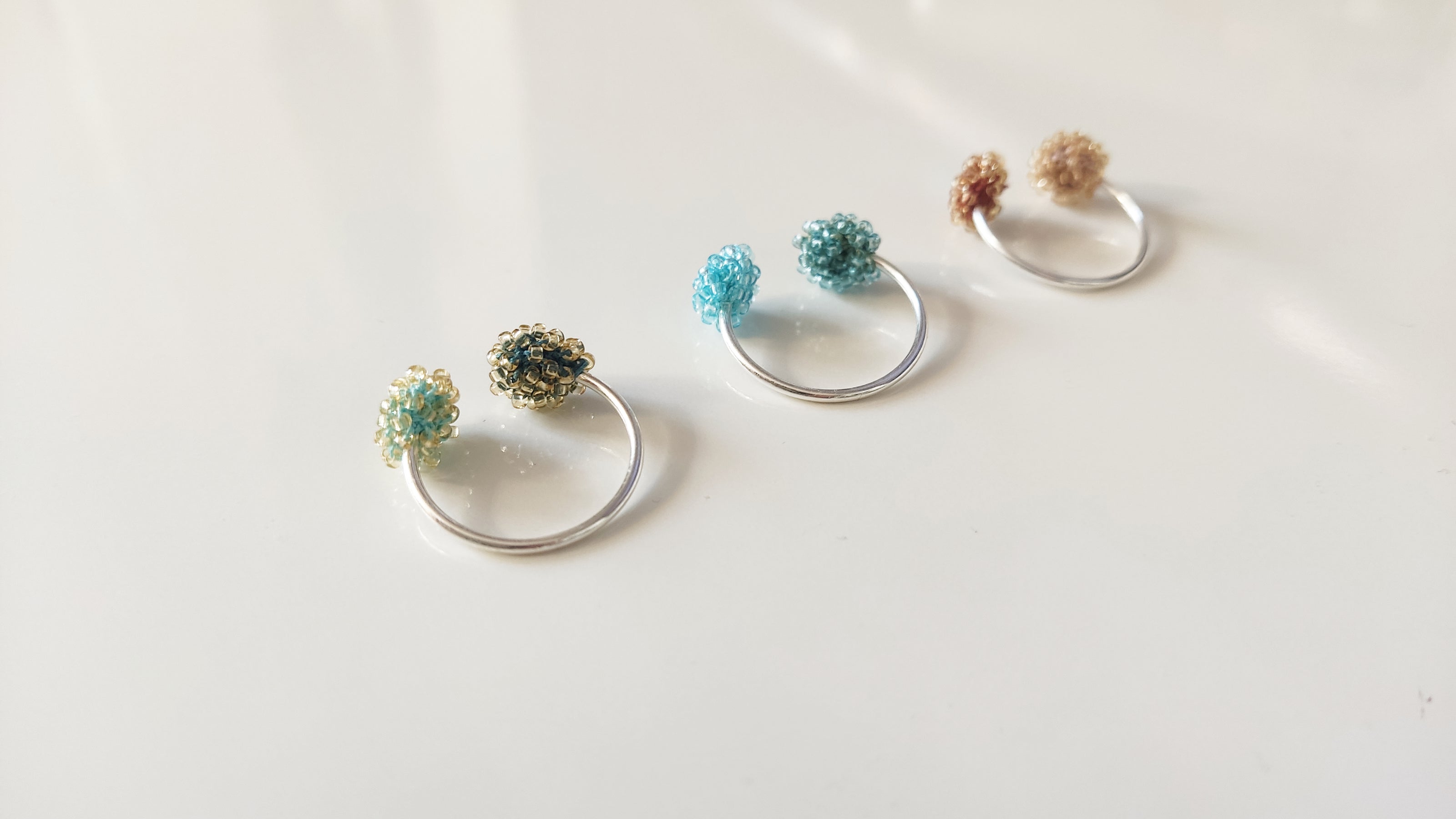 Die verwendeten Perlen bestehen aus Glas. Die meisten davon sind durchgefärbt, wie zum Bespiel die Farbe "Aqua Crystal" - sie besteht aus blau-transparentem Glas. Manche Farben kann man jedoch nicht aus Glas herstellen, wie die Farbe "Gold". Diese Glasperlen werden dann auf verschiedene Weisen beschichtet. Deshalb biete ich zum Beispiel bei gefädelten Ringen nicht die Farbe Gold an, weil sie sich im alltäglichen Ringgebrauch an den Händen (ohne den Schmuck ablegen) zu schnell abnutzen würden.