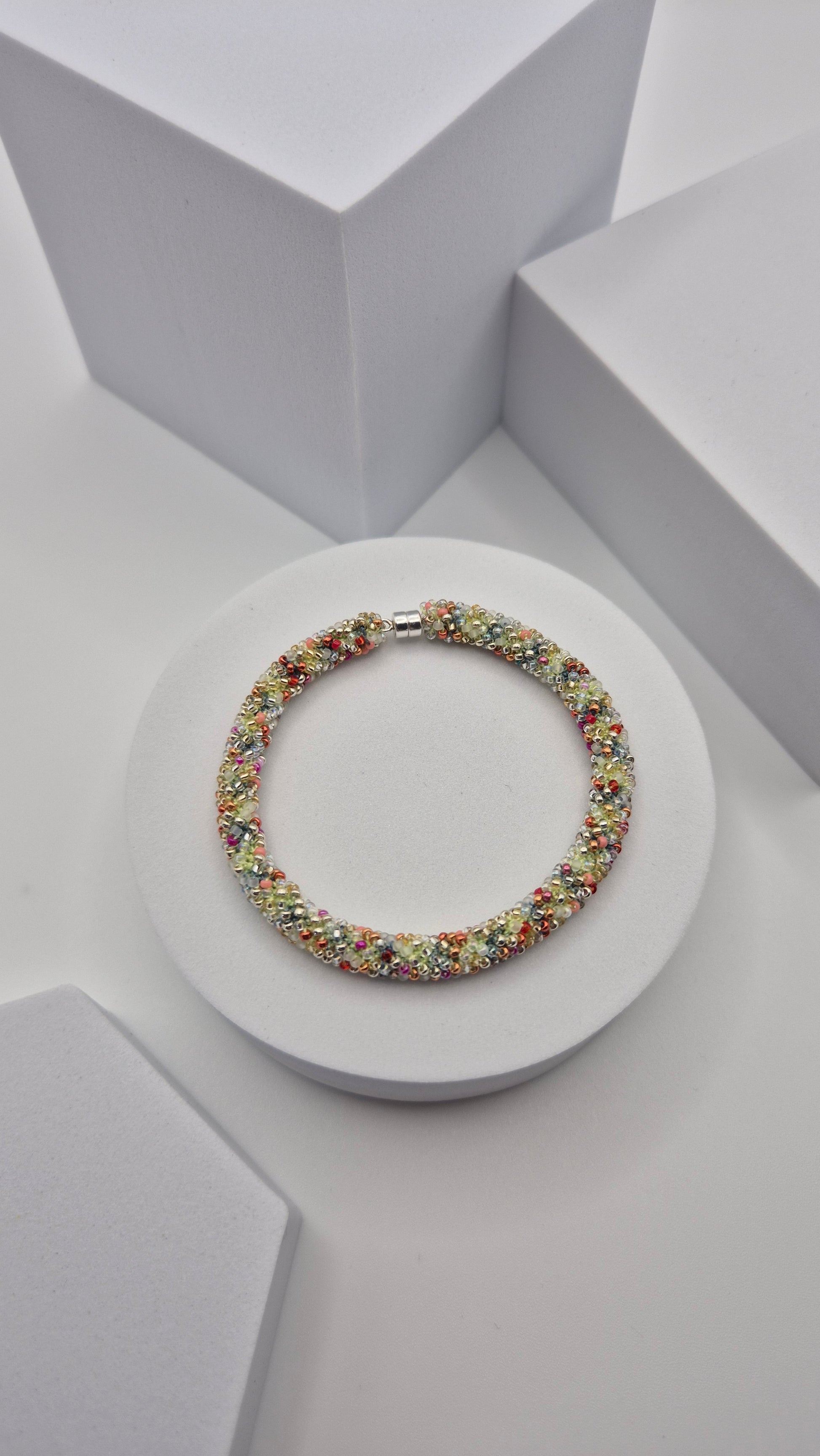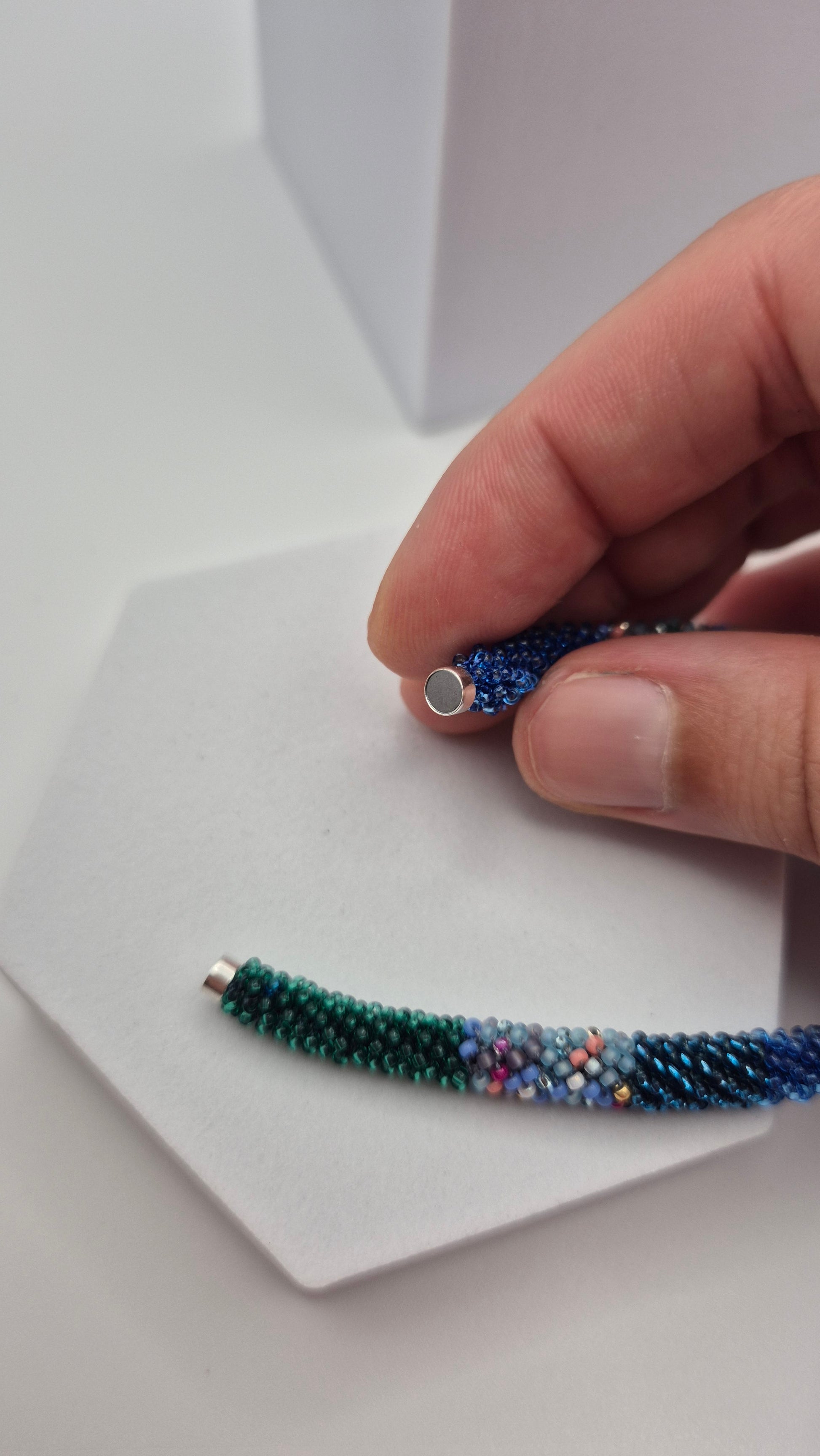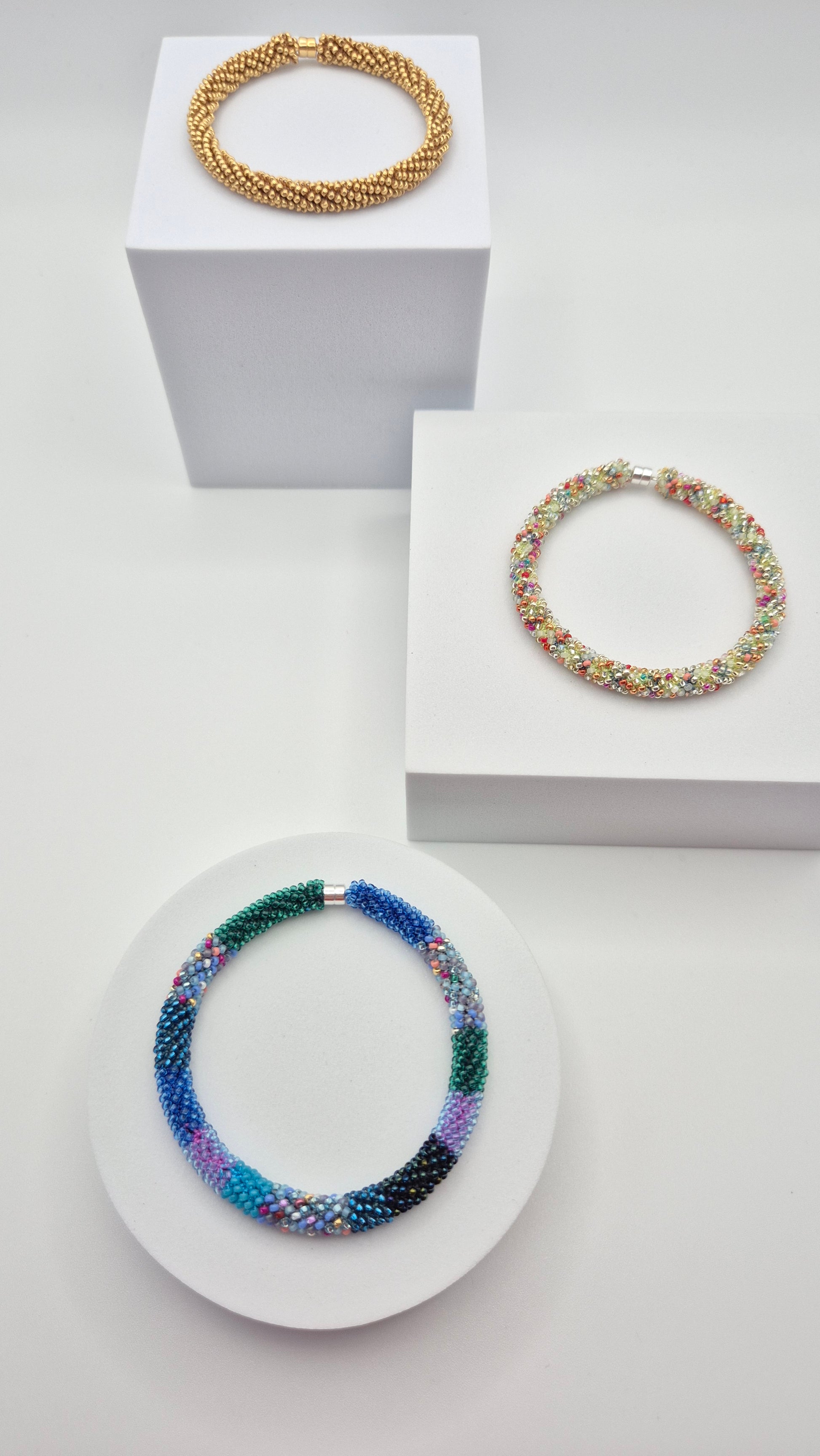 Einzigartiges Armband TUBE. Auf Baumwollgarn aufgezogene 1mm große Rocailles Glasperlen, in aufwändiger Häkeltechnik von Hand hergestellt. Das Armband bestehen aus einer flexiblen, sich anschmiegenden fein gehäkelten "Kordel". Für ein leichteres An- und Ablegen mit Magnetverschluss. Im Inneren des "Schlauches" ist ein 7-strängiges feines Edelstahlseil (reißfest, nicht dehnbar) eingezogen, welches mit dem Magnetverschluss verbunden ist, damit das Armband nicht "weiter" wird und über das Handgelenk rutscht.