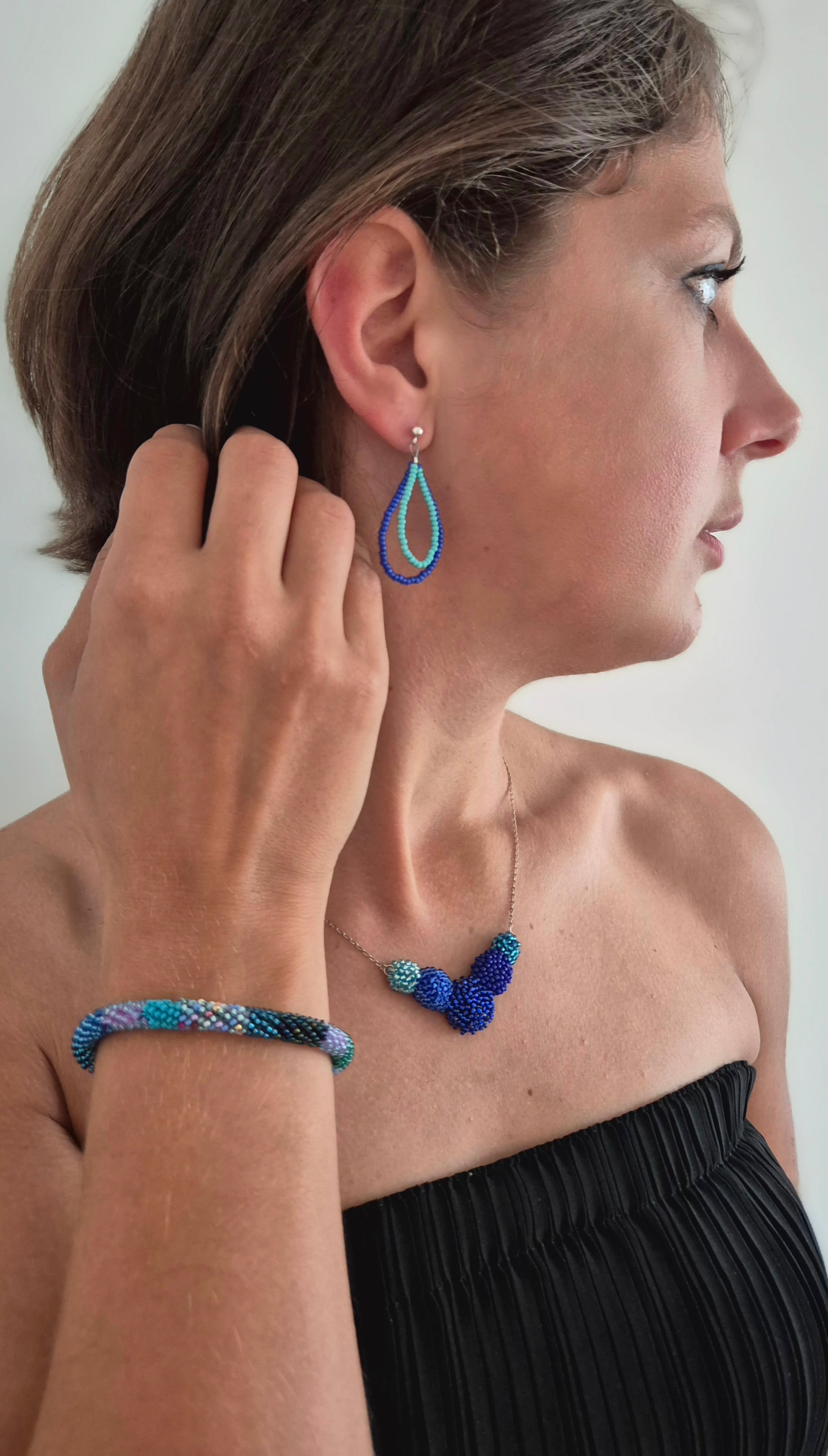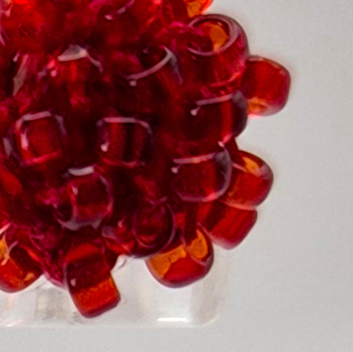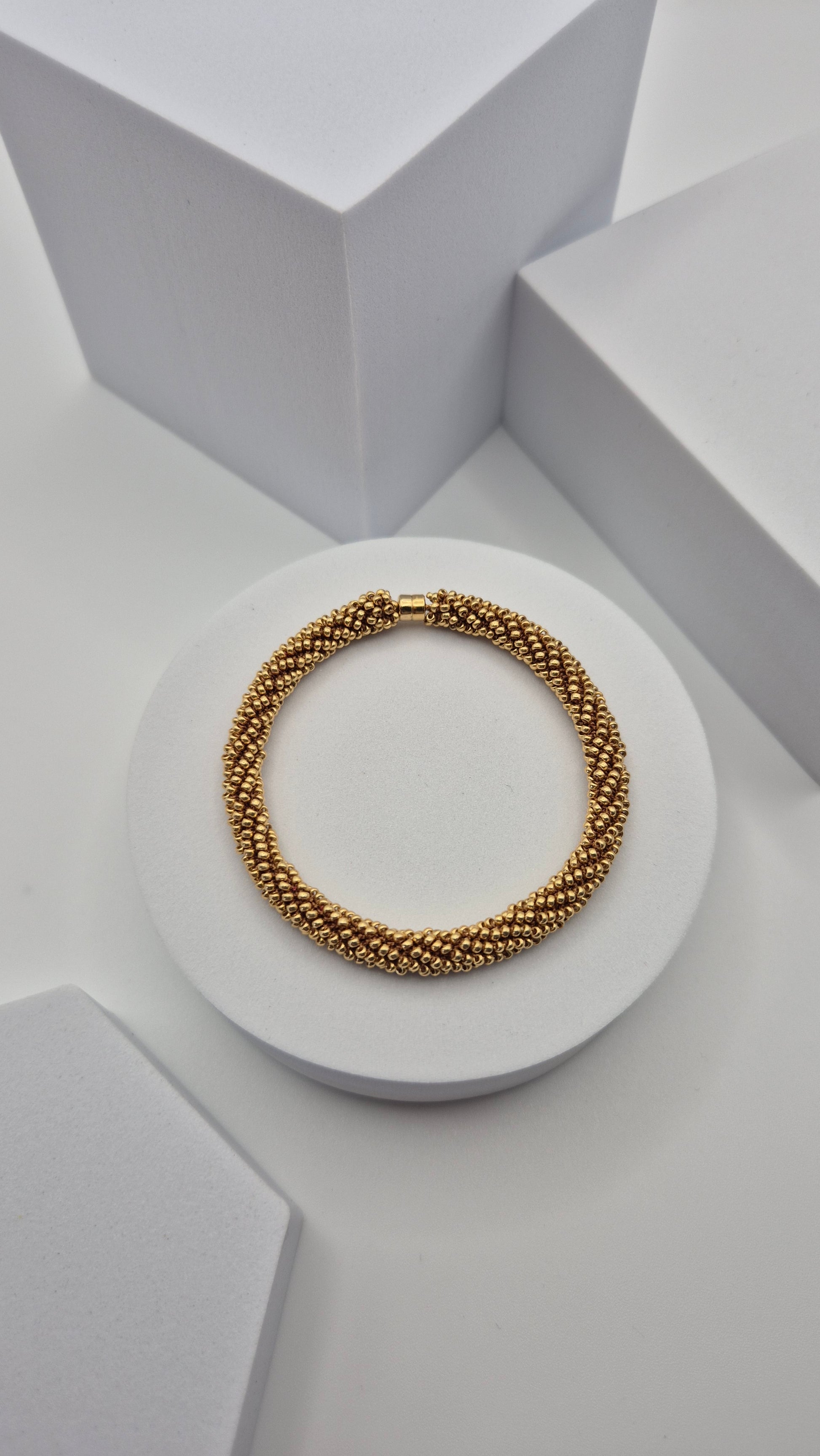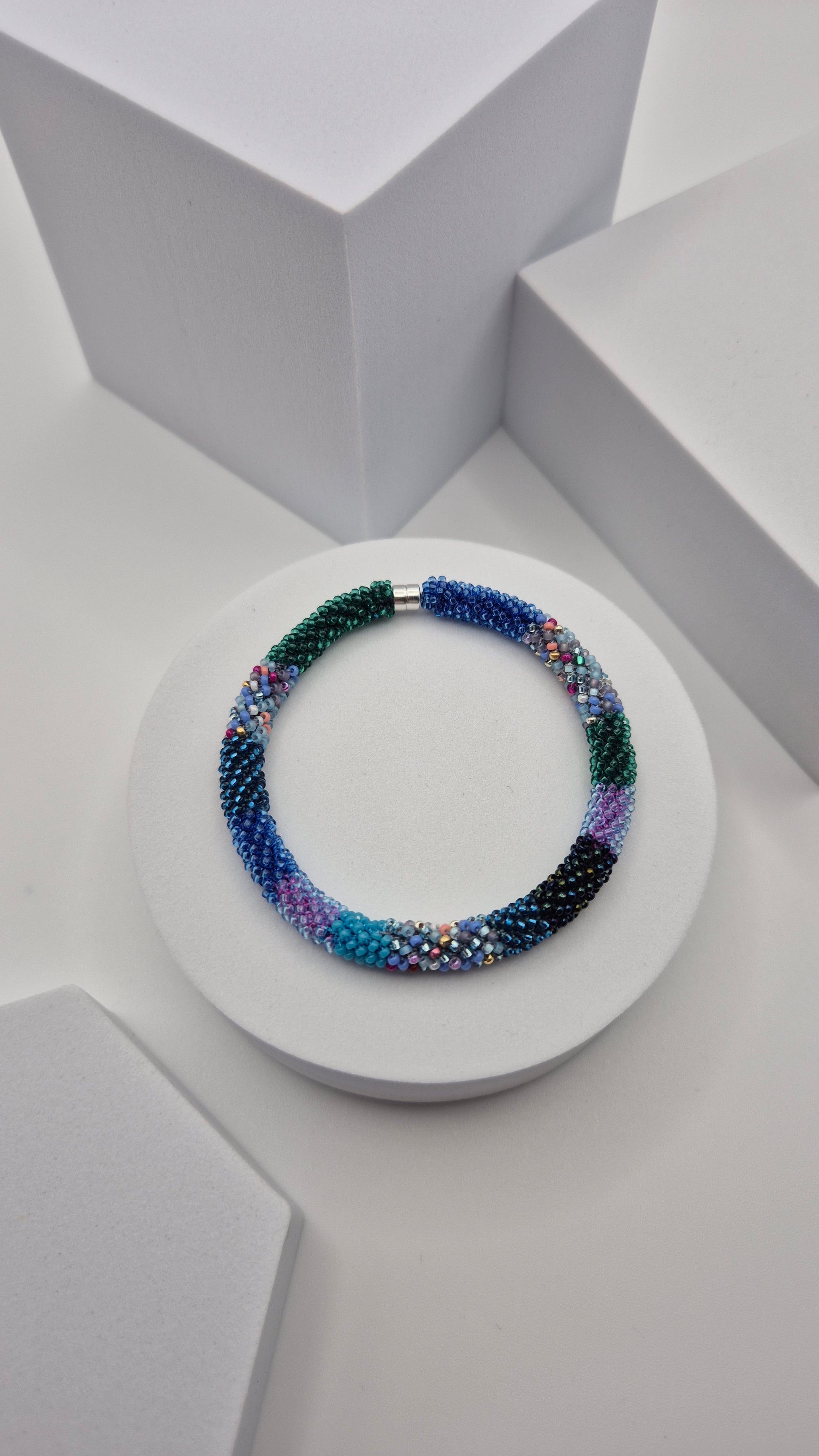 Einzigartiges Armband TUBE. Auf Baumwollgarn aufgezogene 1mm große Rocailles Glasperlen, in aufwändiger Häkeltechnik von Hand hergestellt. Das Armband bestehen aus einer flexiblen, sich anschmiegenden fein gehäkelten "Kordel". Für ein leichteres An- und Ablegen mit Magnetverschluss. Im Inneren des "Schlauches" ist ein 7-strängiges feines Edelstahlseil (reißfest, nicht dehnbar) eingezogen, welches mit dem Magnetverschluss verbunden ist, damit das Armband nicht "weiter" wird und über das Handgelenk rutscht.