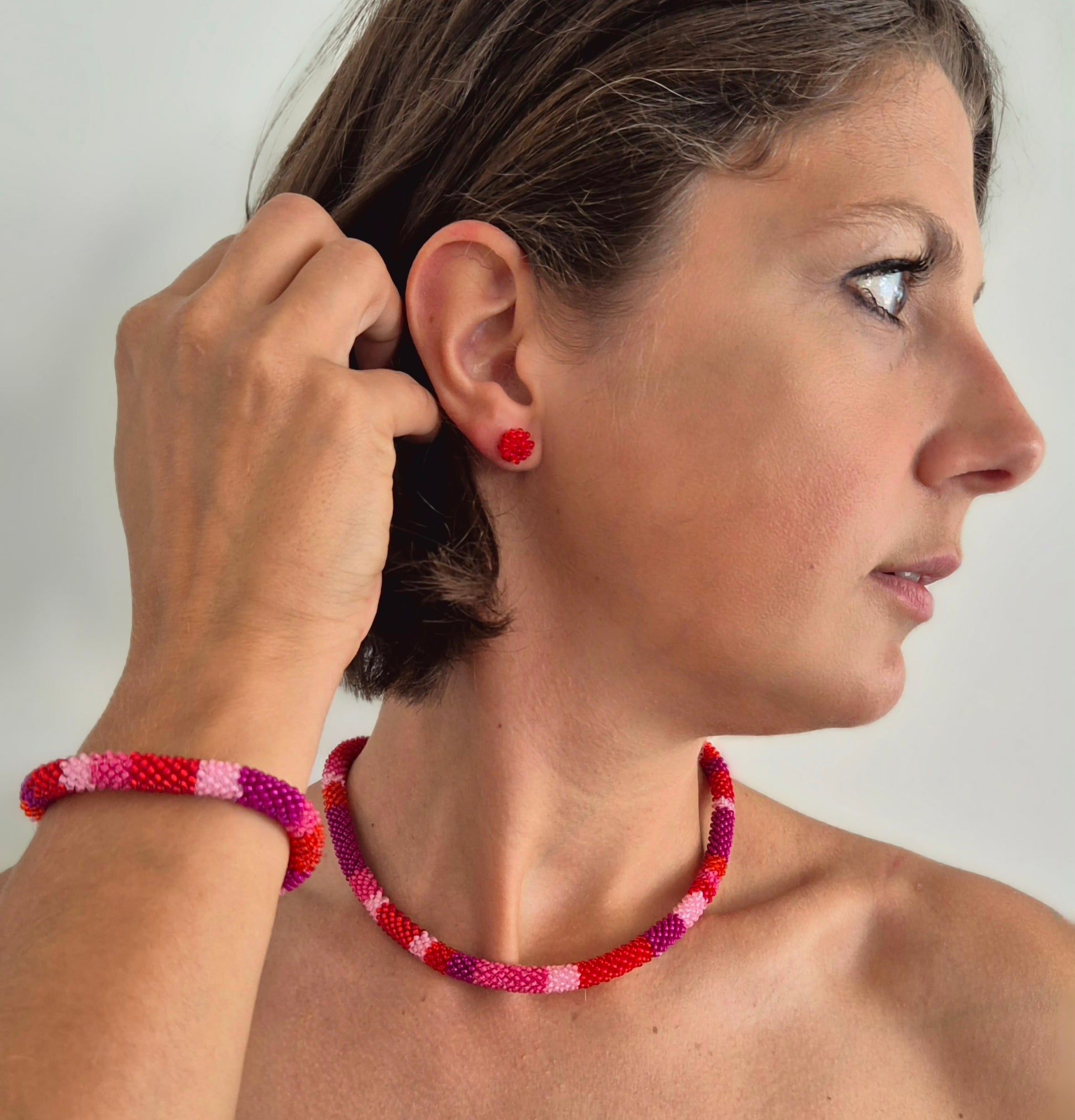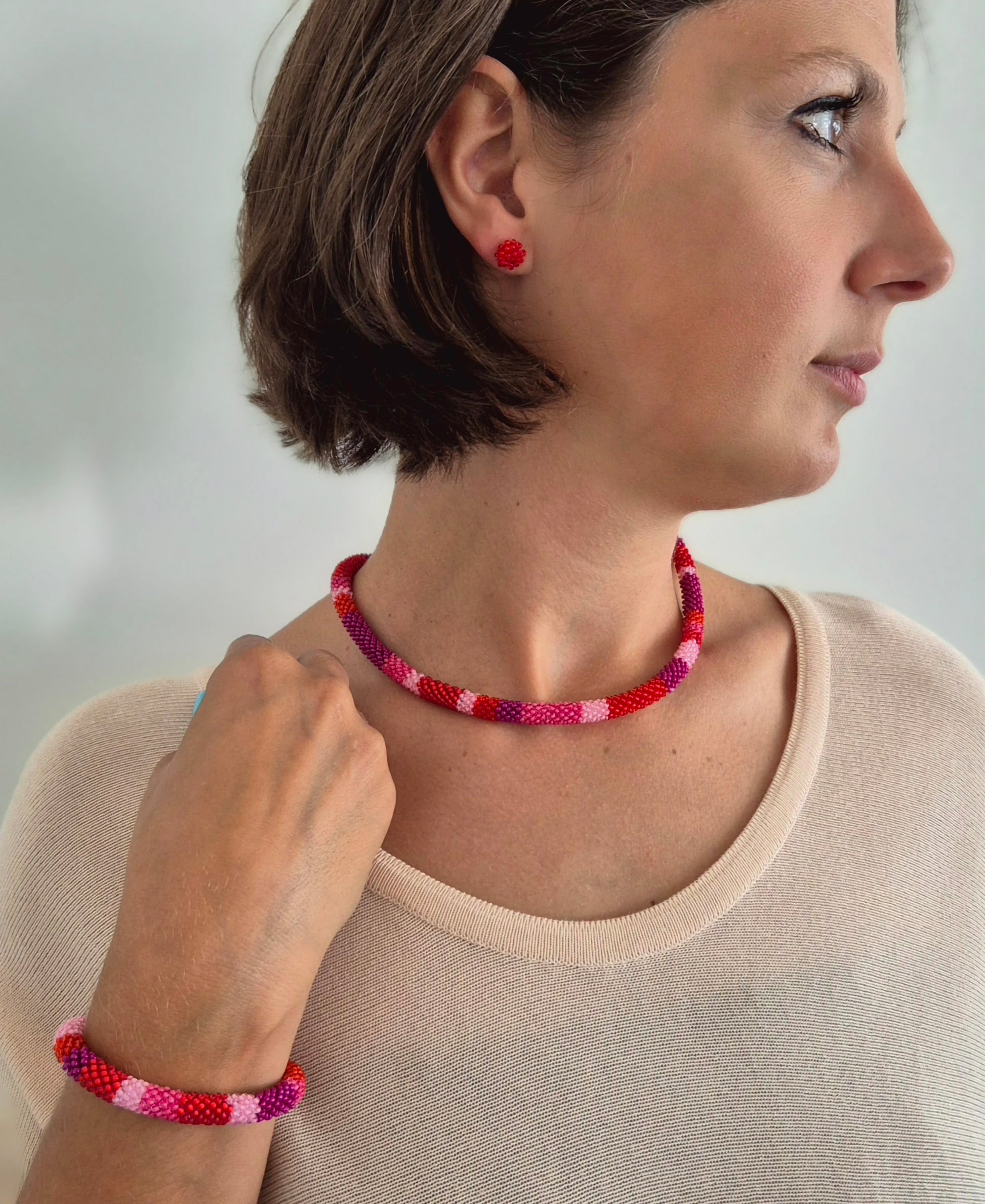 Einzigartiges Armband TUBE. Auf Baumwollgarn aufgezogene 2mm große Rocailles Glasperlen, in aufwändiger Häkeltechnik von Hand hergestellt. Das Armband bestehen aus einer flexiblen, sich anschmiegenden fein gehäkelten "Kordel". Für ein leichteres An- und Ablegen mit Magnetverschluss. Im Inneren des "Schlauches" ist ein 7-strängiges feines Edelstahlseil (reißfest, nicht dehnbar) eingezogen, welches mit dem Magnetverschluss verbunden ist, damit das Armband nicht "weiter" wird und über das Handgelenk rutscht.