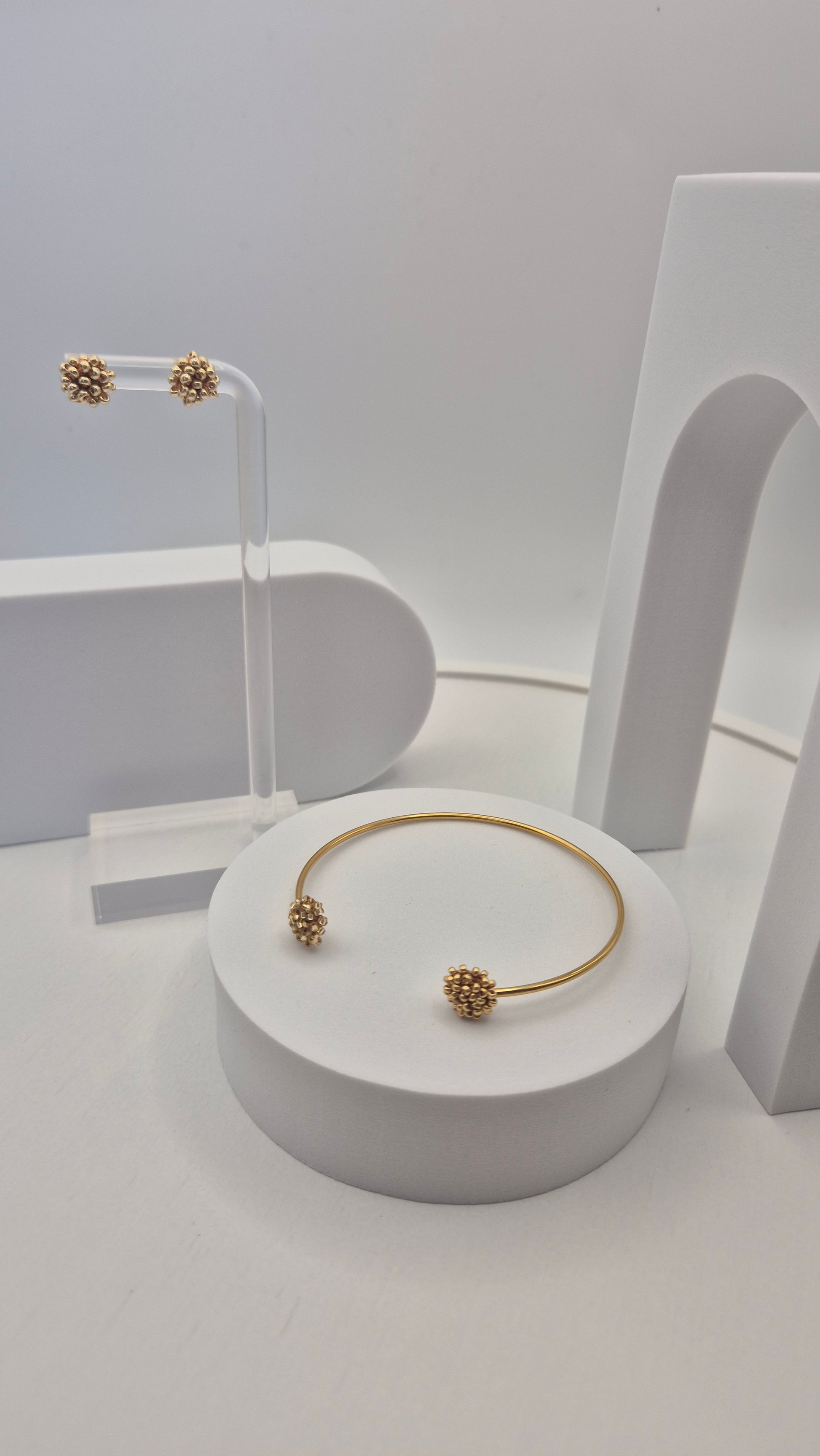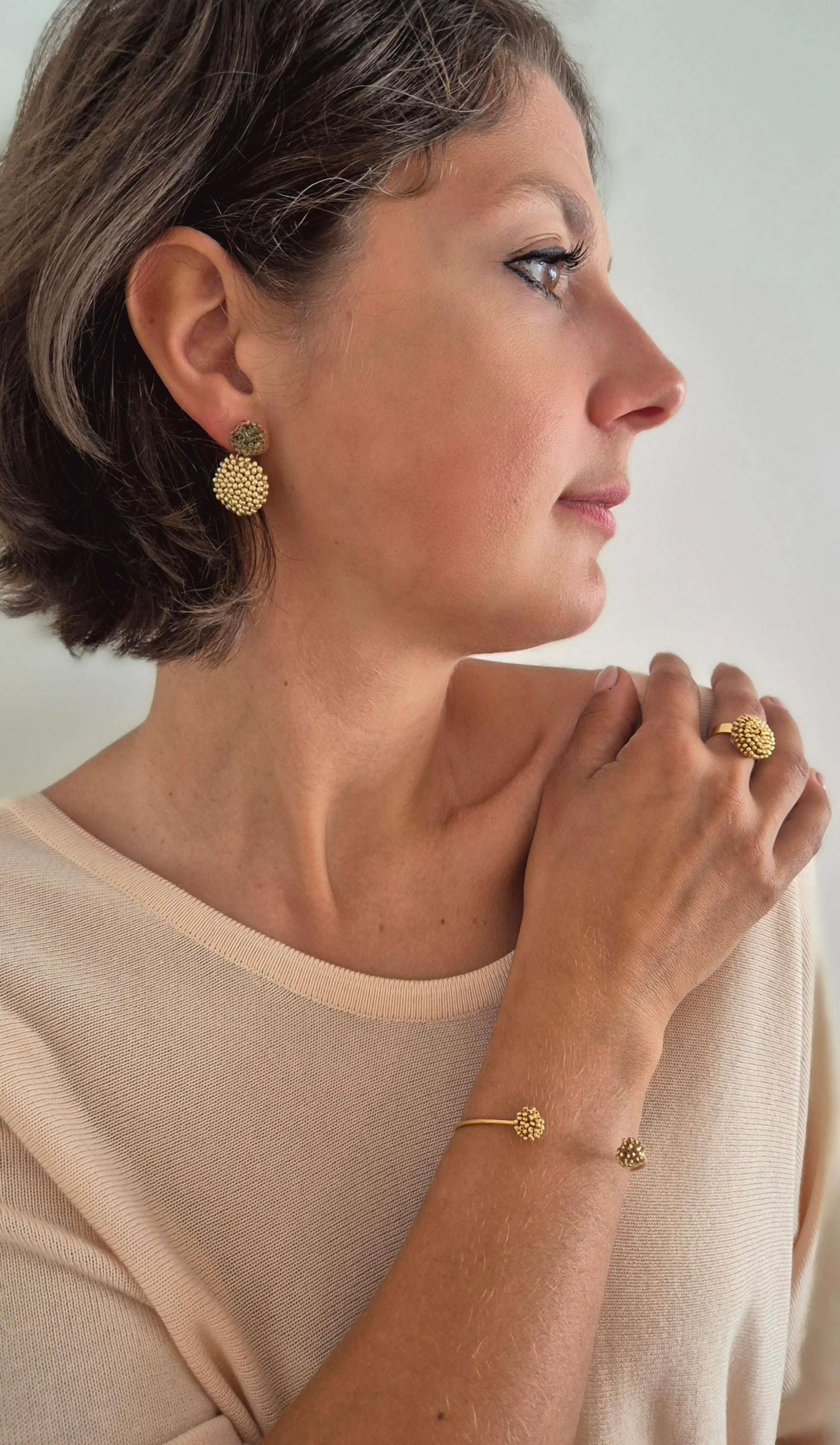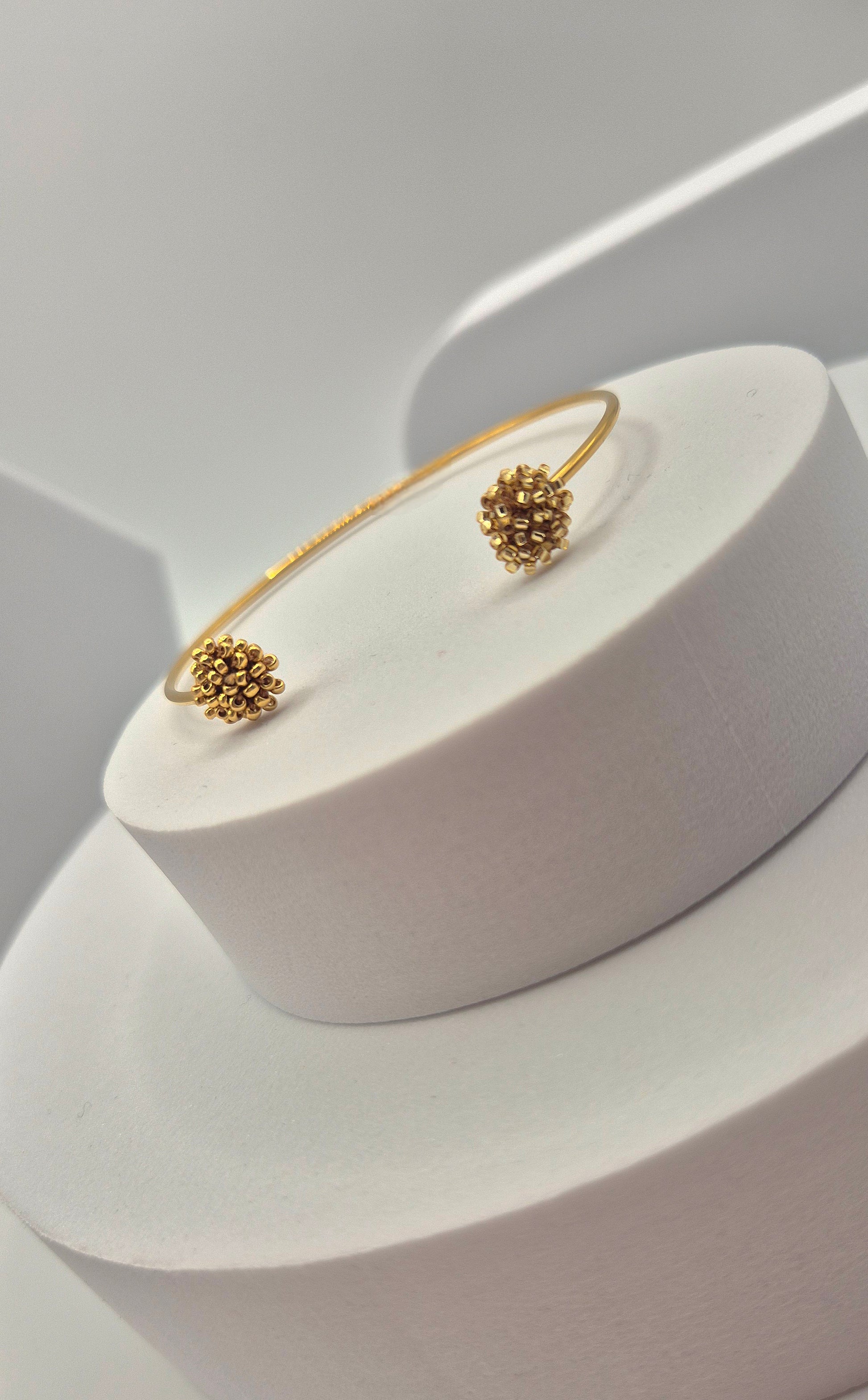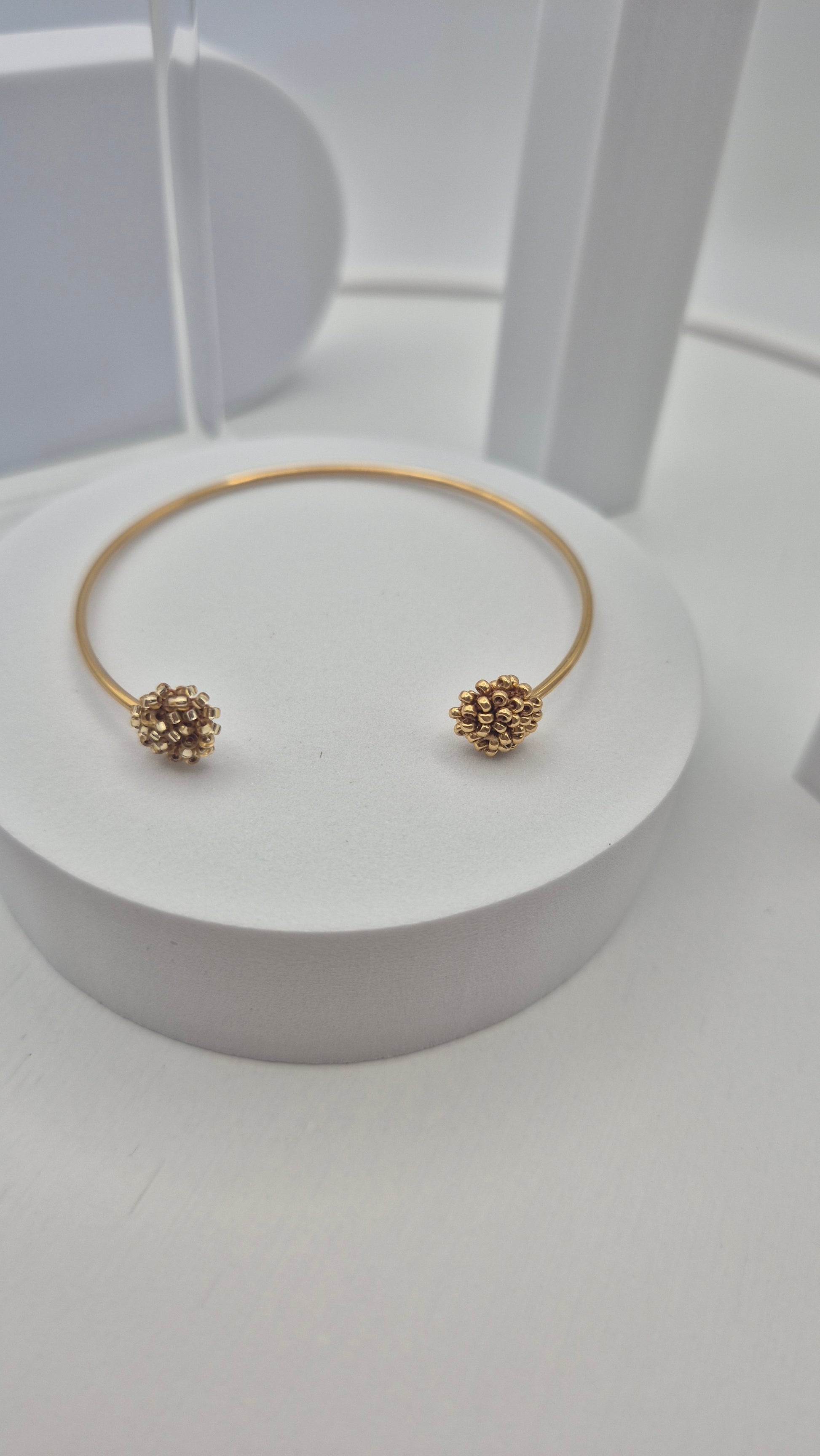 Einzigartiger LINNSI 2 Armreif. Auf Baumwollgarn aufgezogene 1mm kleine Rocailles Glasperlen, in aufwändiger Häkeltechnik von Hand hergestellt. Der Armreif besteht aus 316 L Edelstahl (vergoldet) und besitzt 2 Applikationen ist in Form einer Linse - gehäkelt und vernäht. Der Schmuck kommt komplett ohne Kleber aus.
