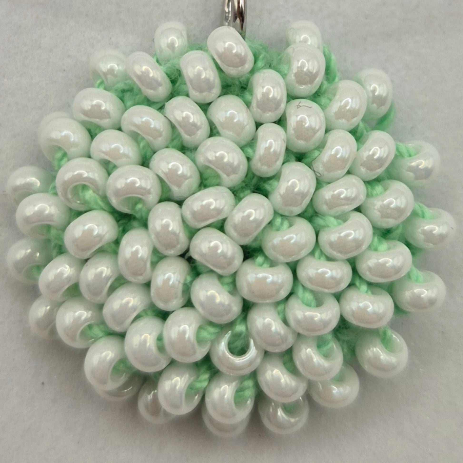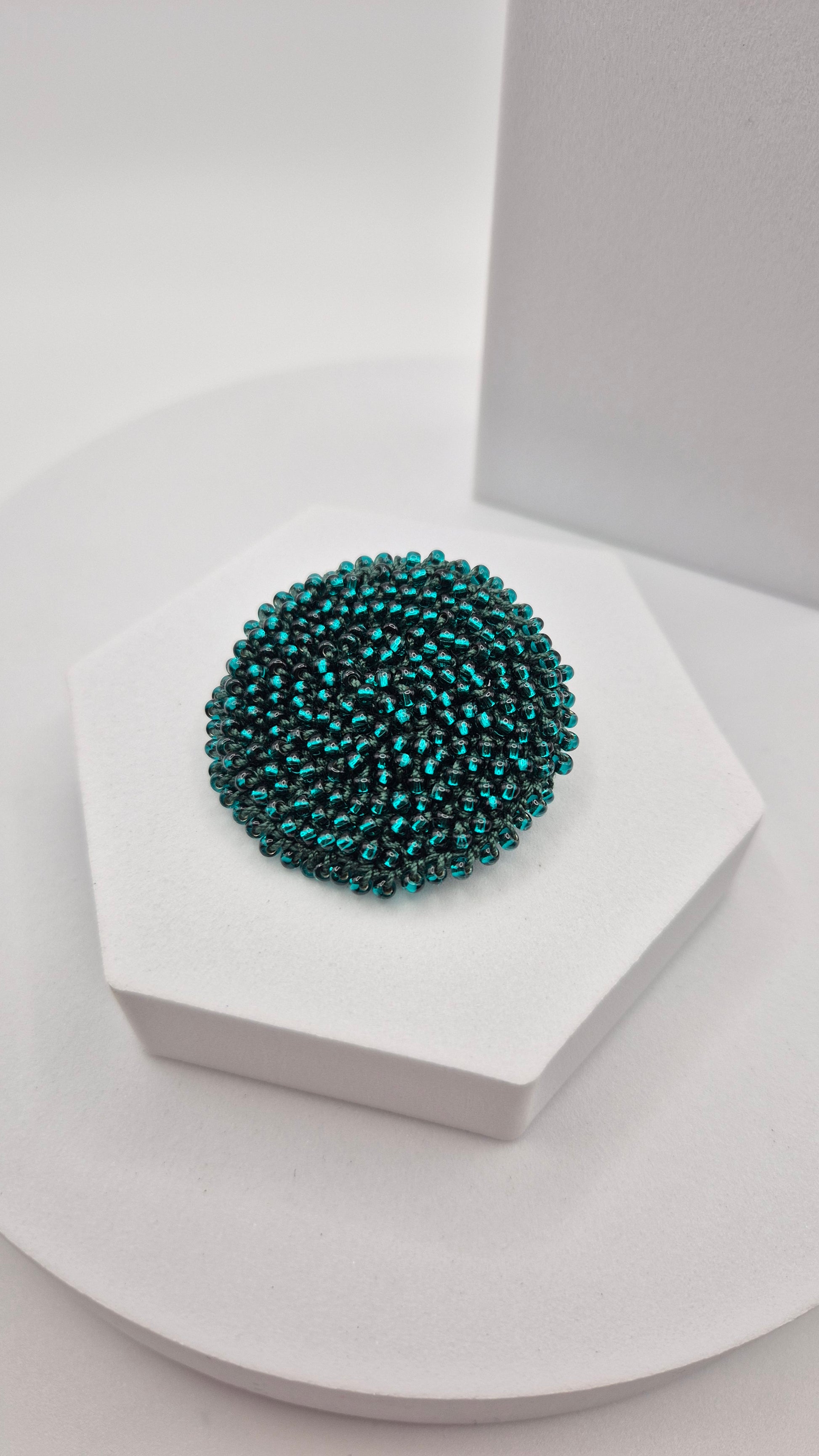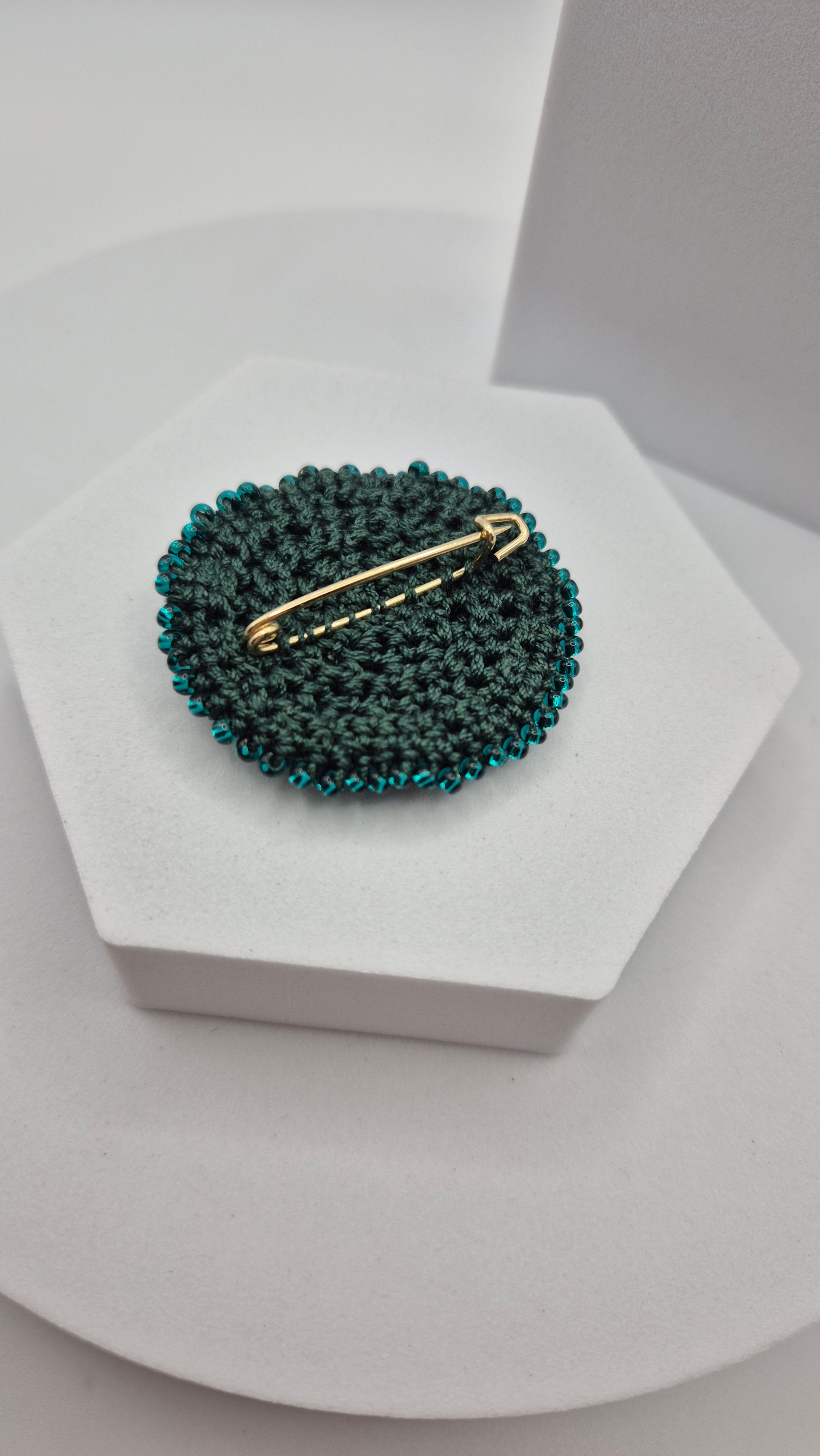 Einzigartige Brosche. LINNSI besteht aus 2,5 mm großen Rocaille Glasperlen (teils mit versilberten Glasperlenlöchern), die auf Baumwollgarn aufgezogen und in aufwändiger Häkeltechnik verarbeitet werden. Die Brosche kommt ohne Kleber aus.