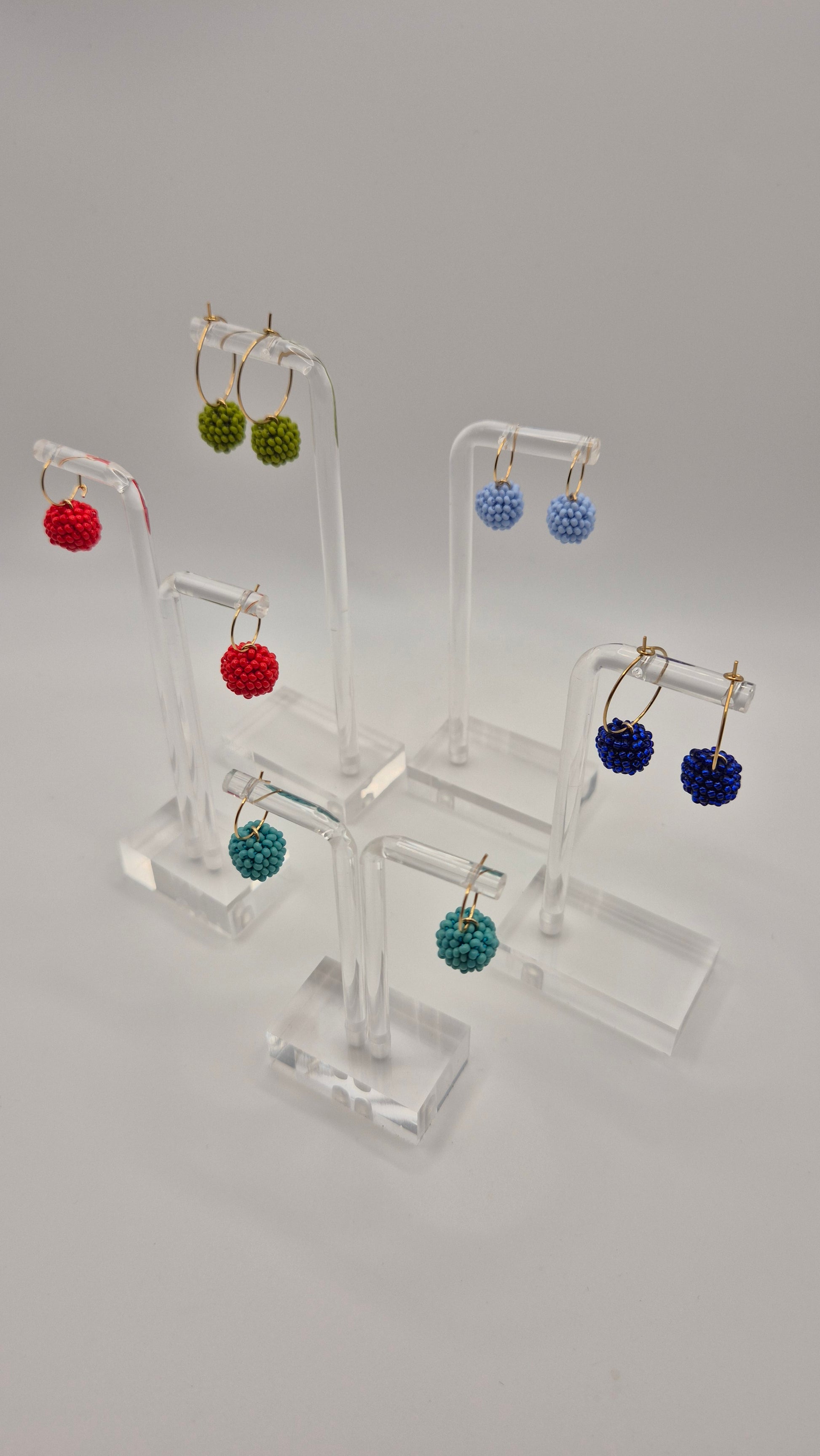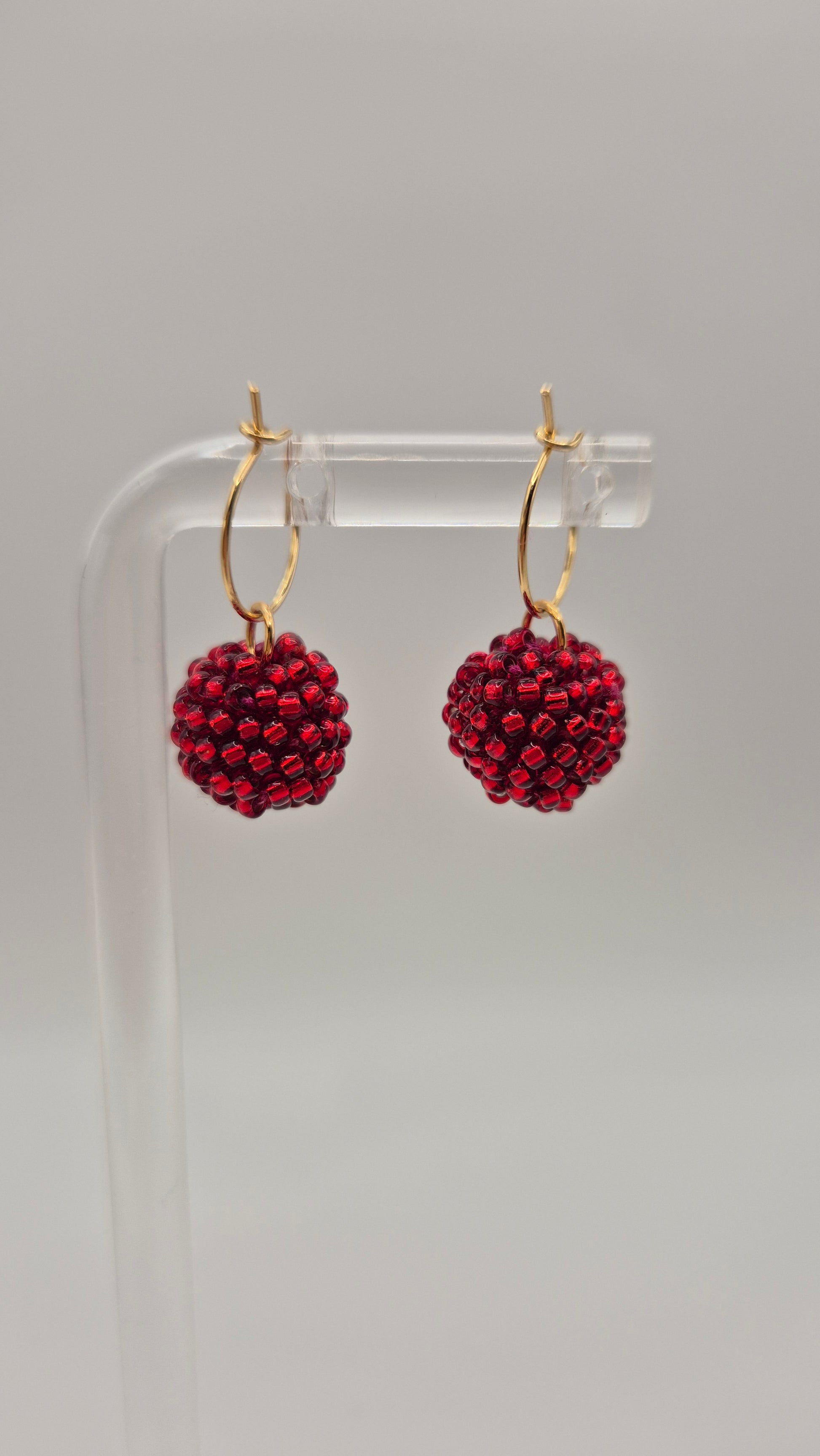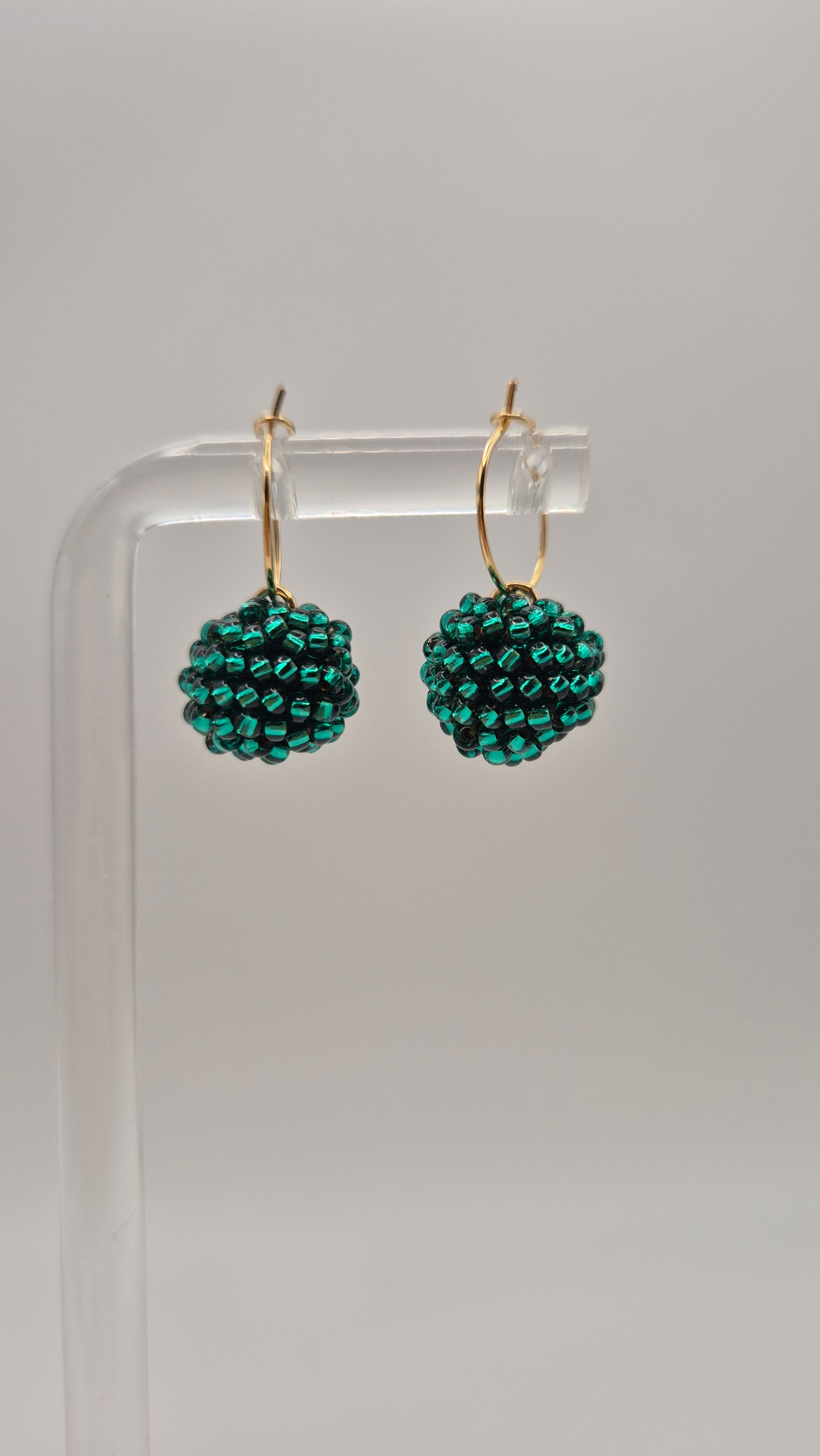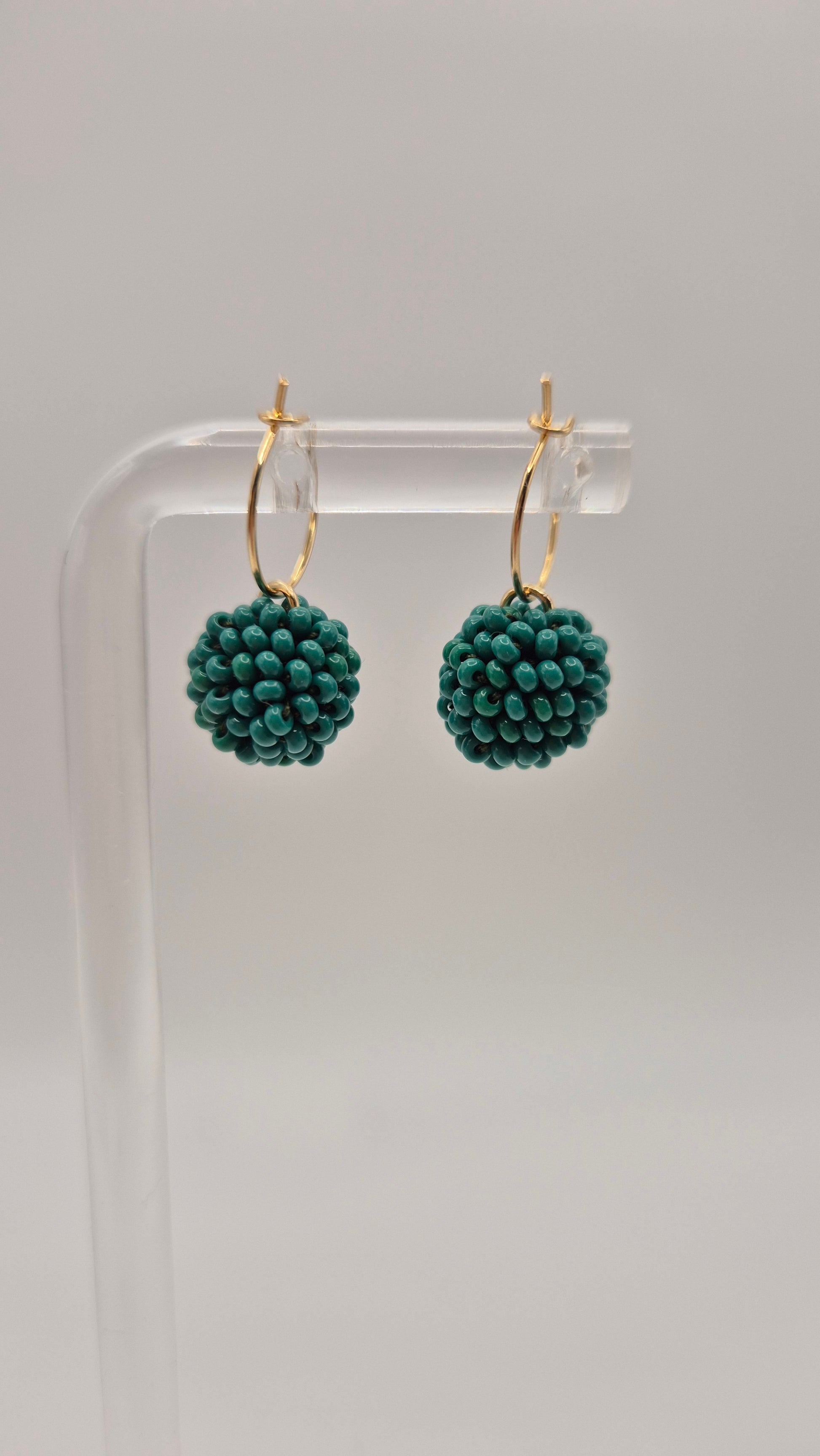 Einzigartige KUULA midi Creolen. Auf Baumwollgarn aufgezogene 2mm große Rocailles Glasperlen, in aufwändiger Häkeltechnik von Hand hergestellt. Die Ohrringe haben jeweils einen Anhänger in Form einer Kugel gehäkelt und vernäht. Die Öse ist eingehäkelt und vernäht. Der Schmuck kommt komplett ohne Kleber aus.