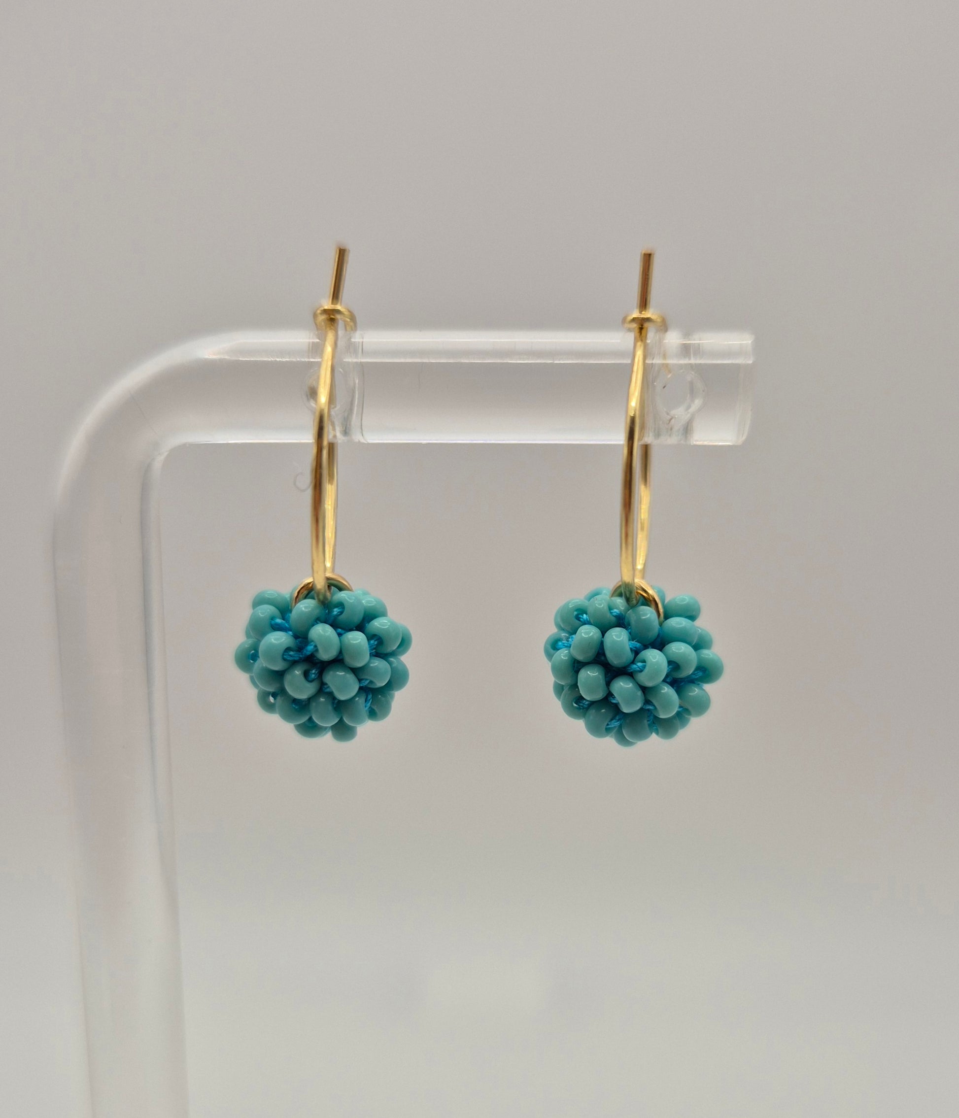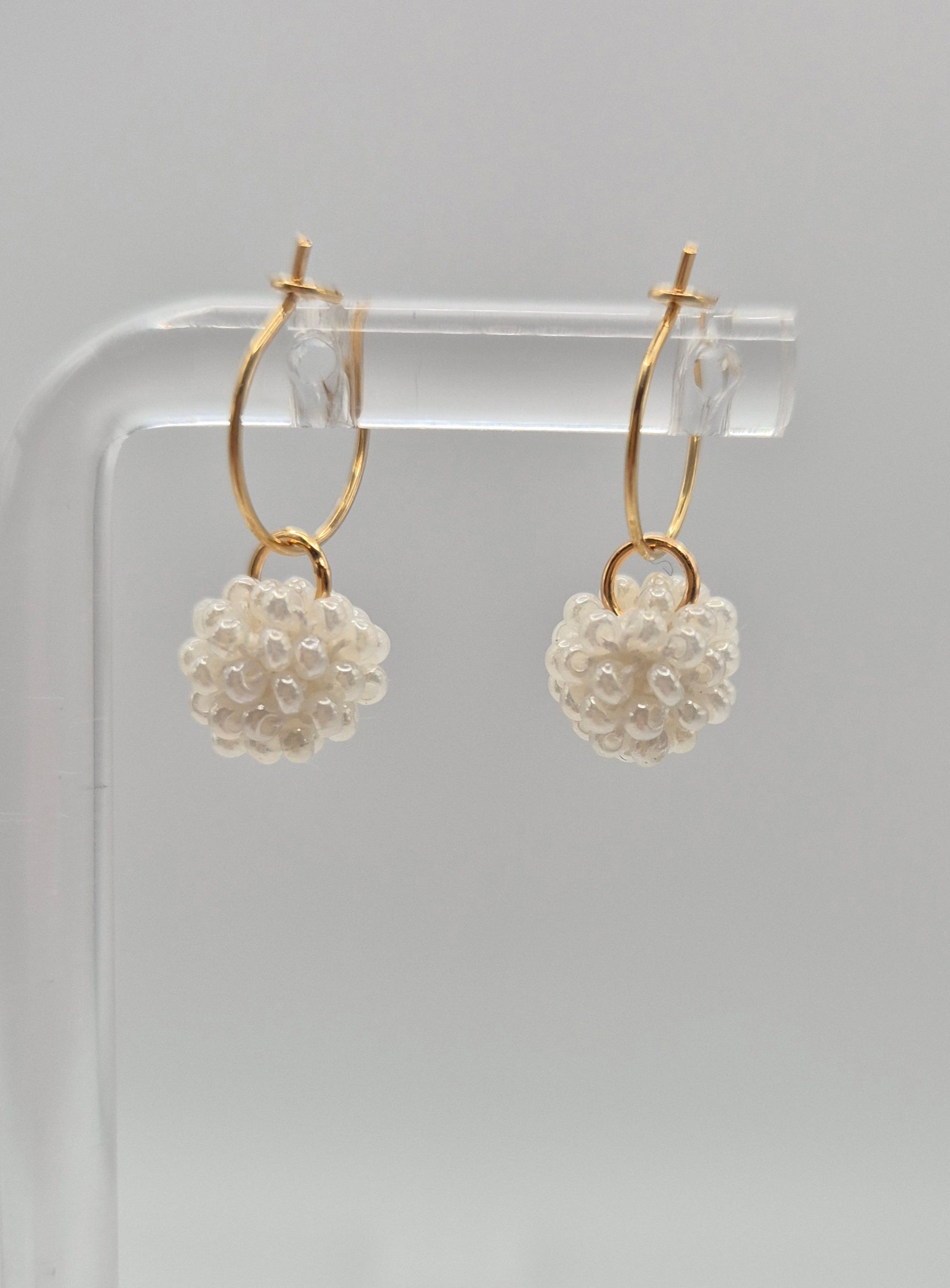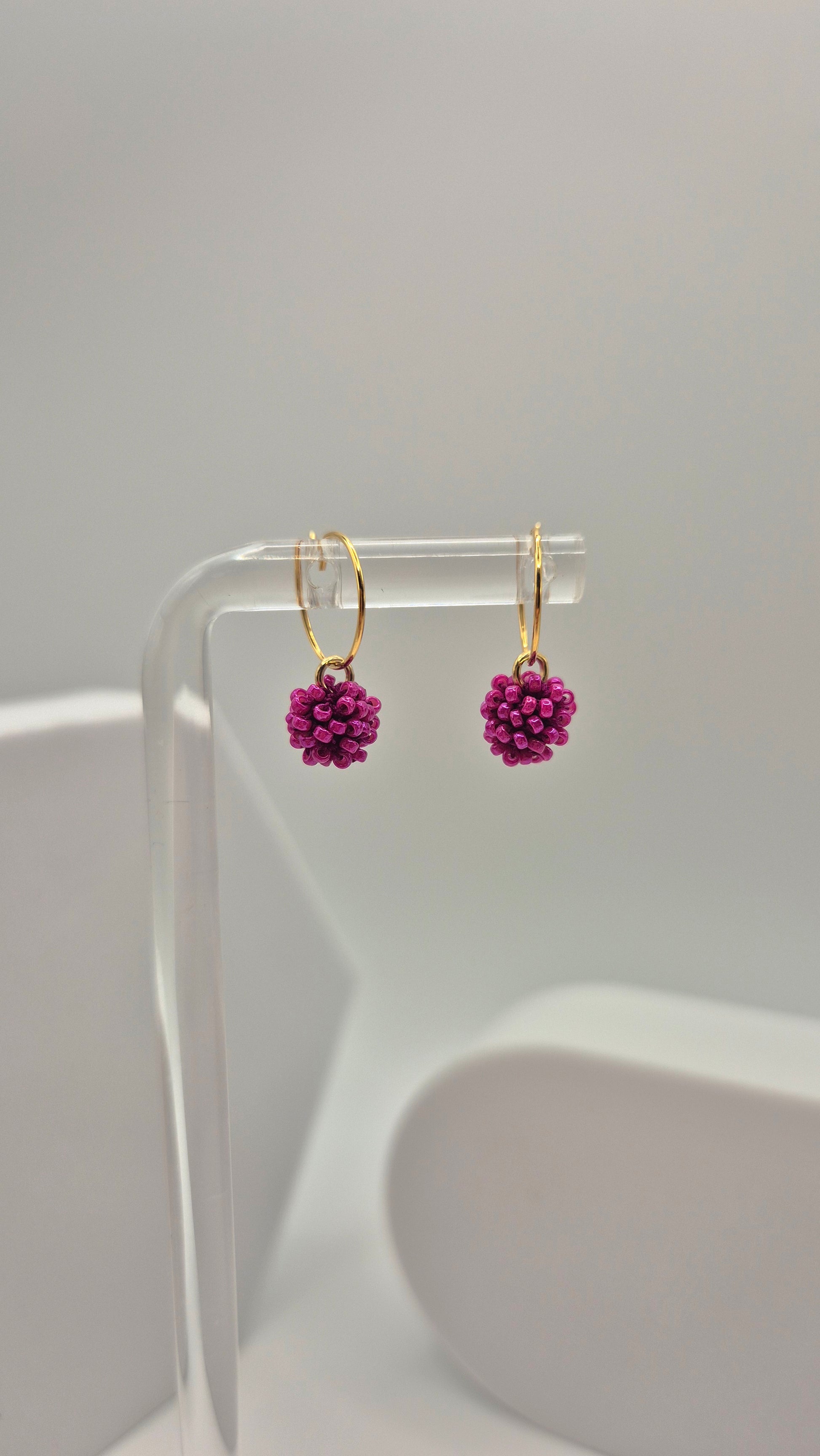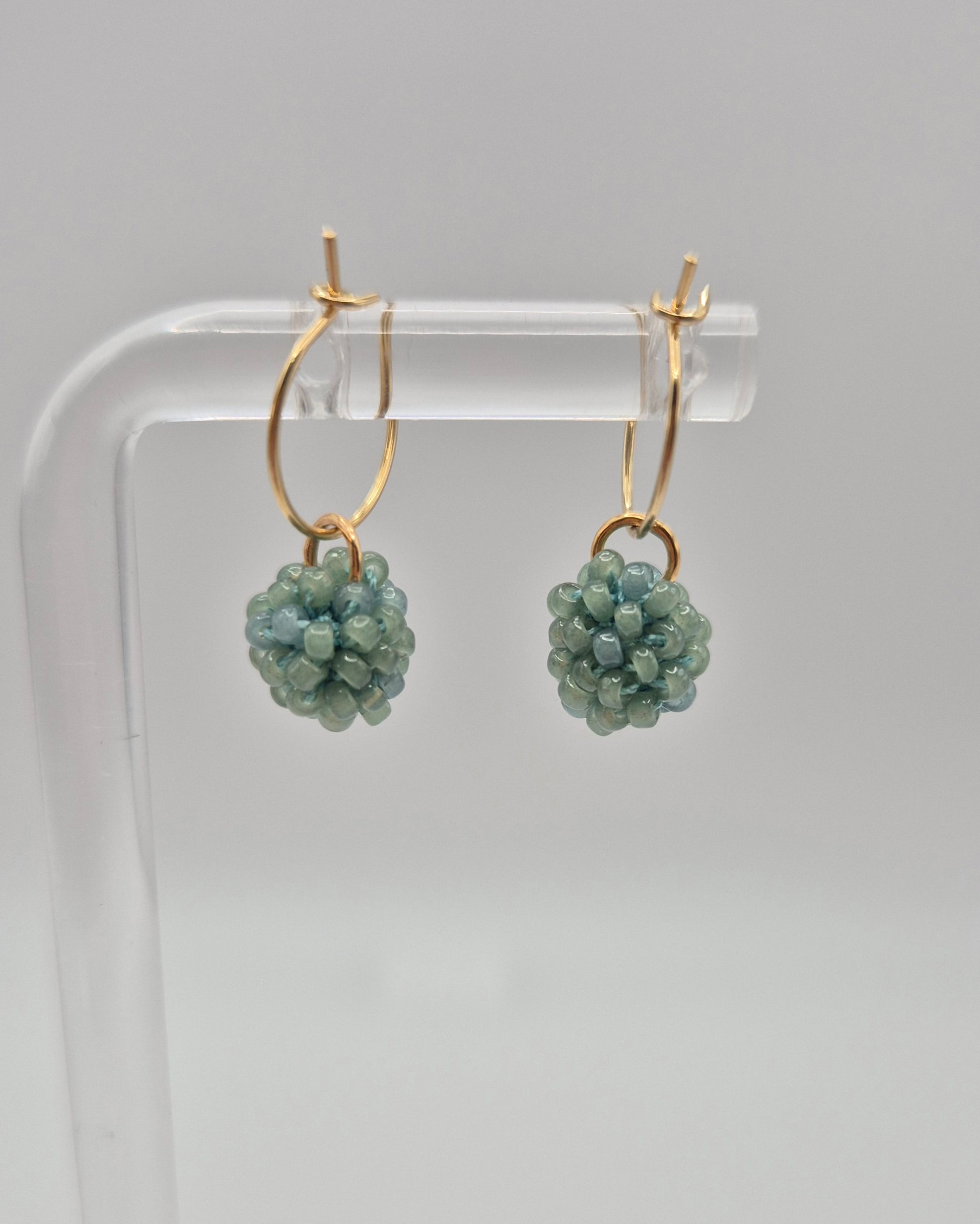 Einzigartige KUULA mini Creolen. Auf Baumwollgarn aufgezogene 2mm große Rocailles Glasperlen, in aufwändiger Häkeltechnik von Hand hergestellt. Die Ohrringe haben jeweils einen Anhänger in Form einer Kugel gehäkelt und vernäht. Die Öse ist eingehäkelt und vernäht. Der Schmuck kommt komplett ohne Kleber aus.