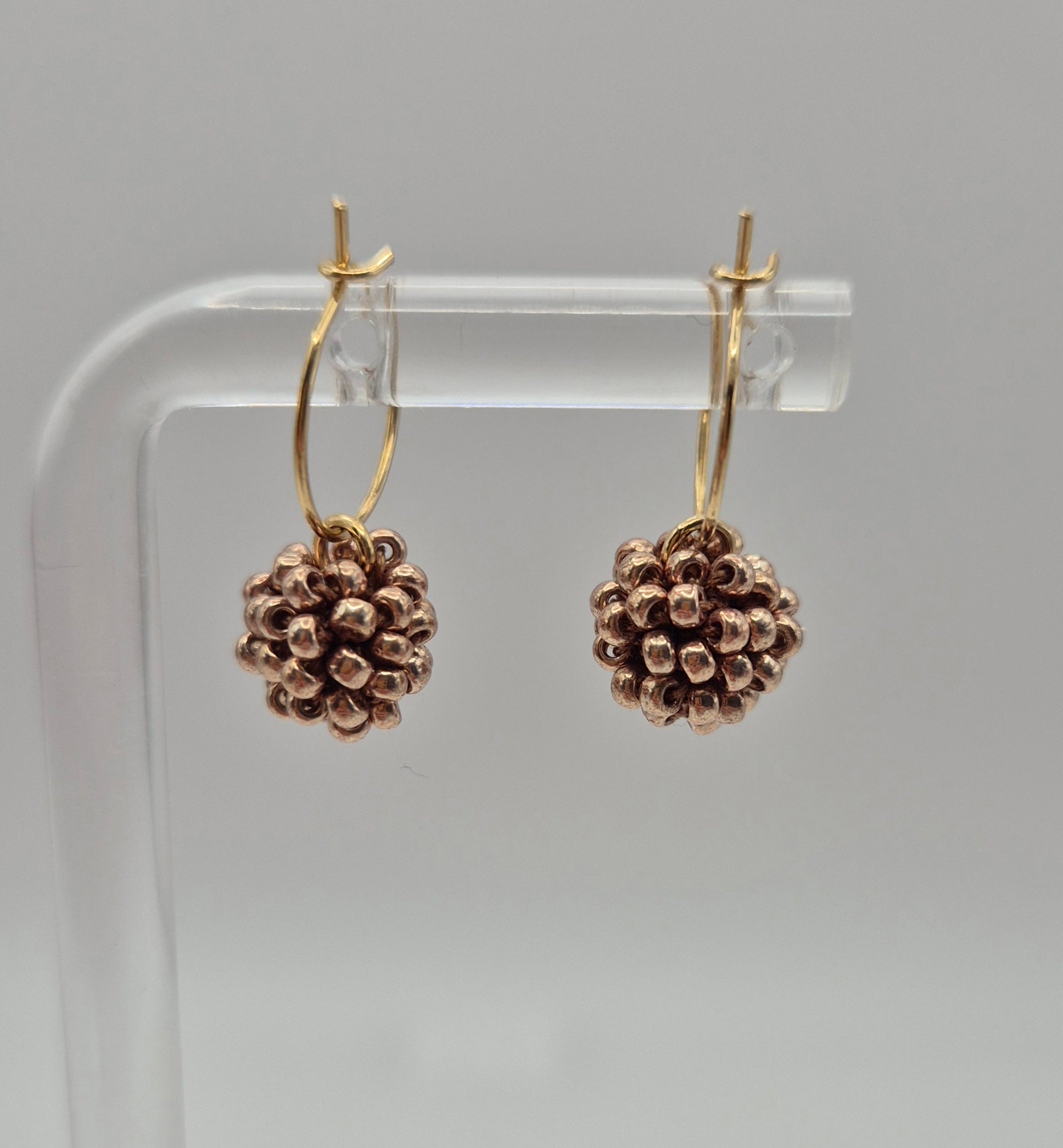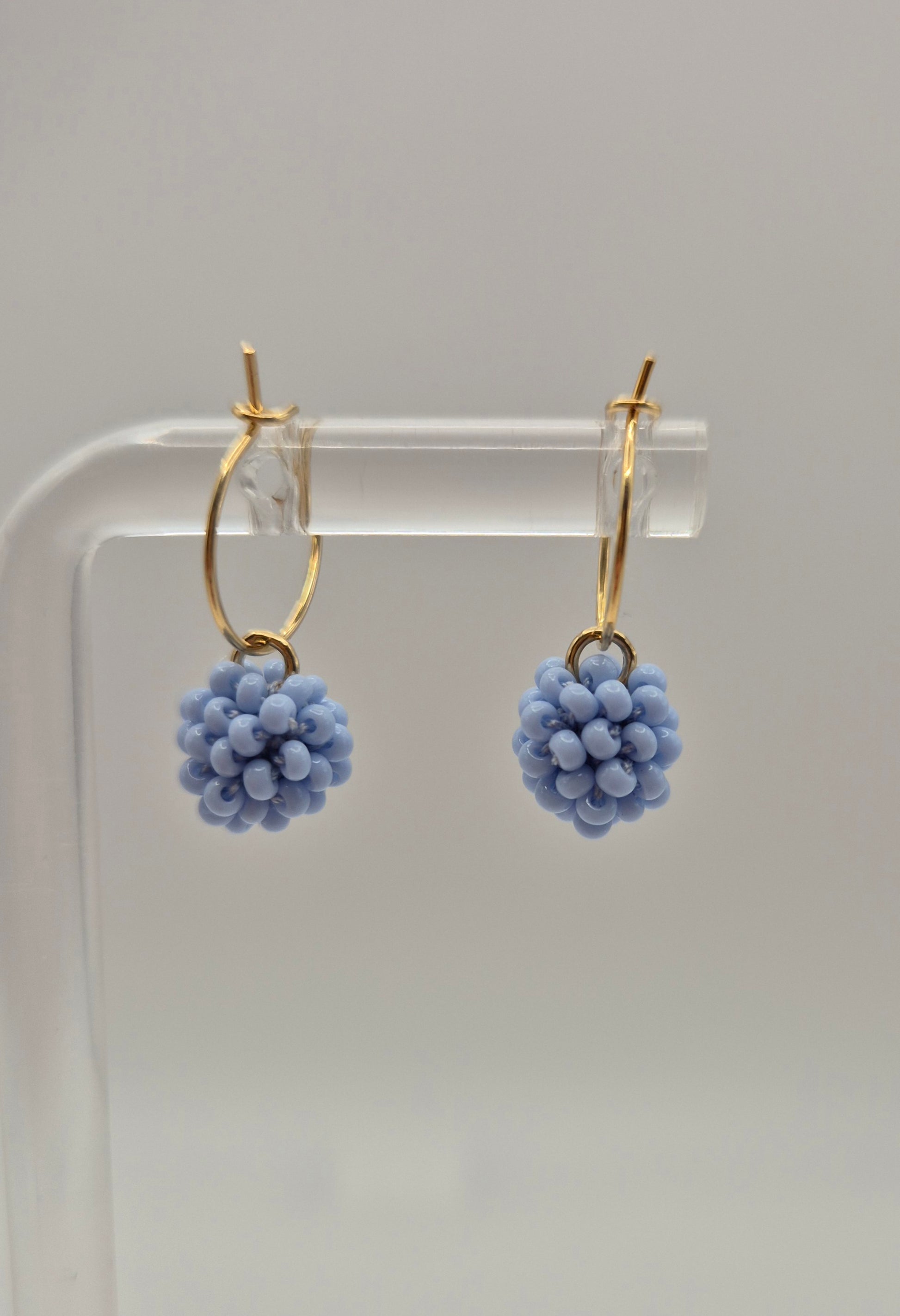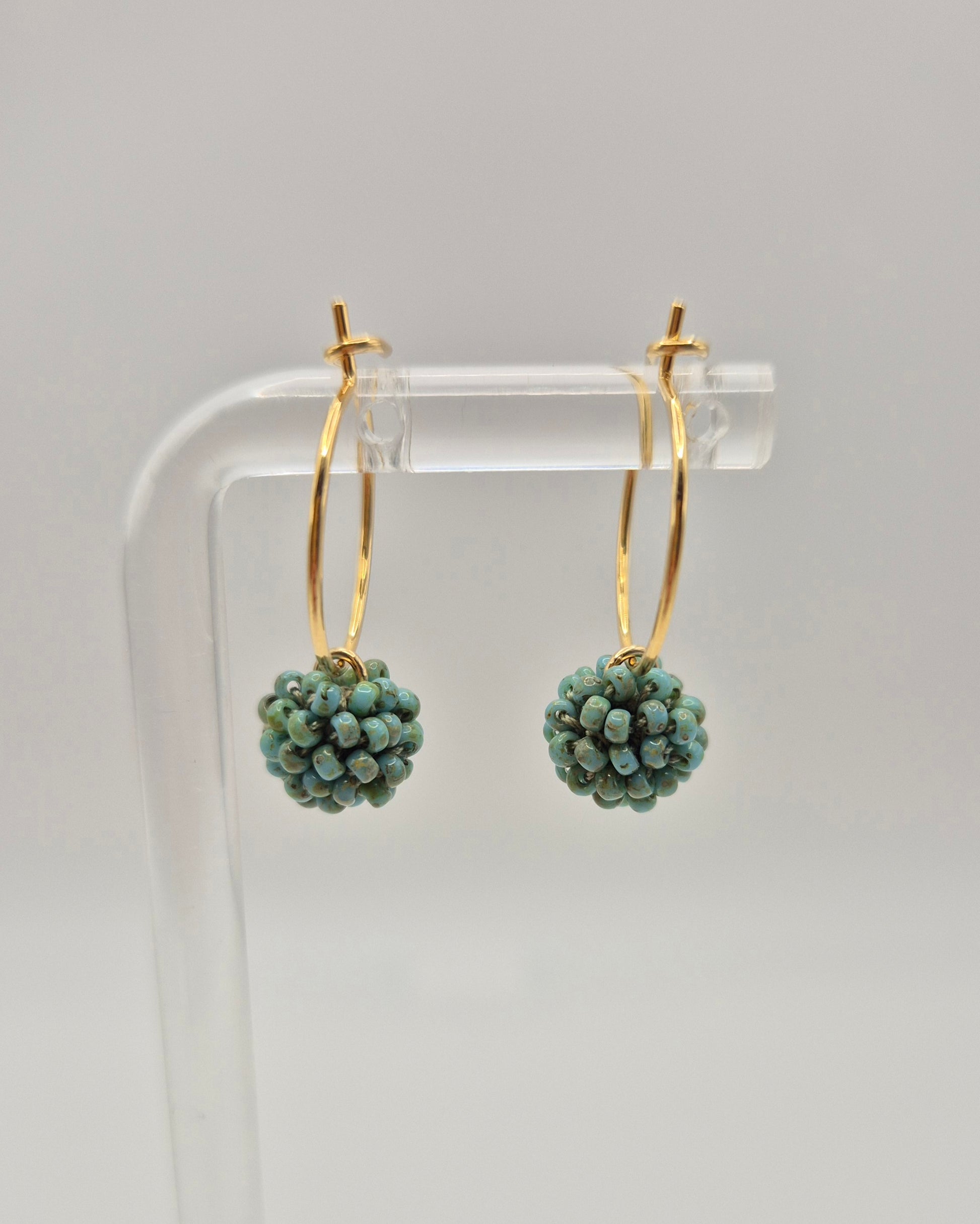Einzigartige KUULA mini Creolen. Auf Baumwollgarn aufgezogene 2mm große Rocailles Glasperlen, in aufwändiger Häkeltechnik von Hand hergestellt. Die Ohrringe haben jeweils einen Anhänger in Form einer Kugel gehäkelt und vernäht. Die Öse ist eingehäkelt und vernäht. Der Schmuck kommt komplett ohne Kleber aus.