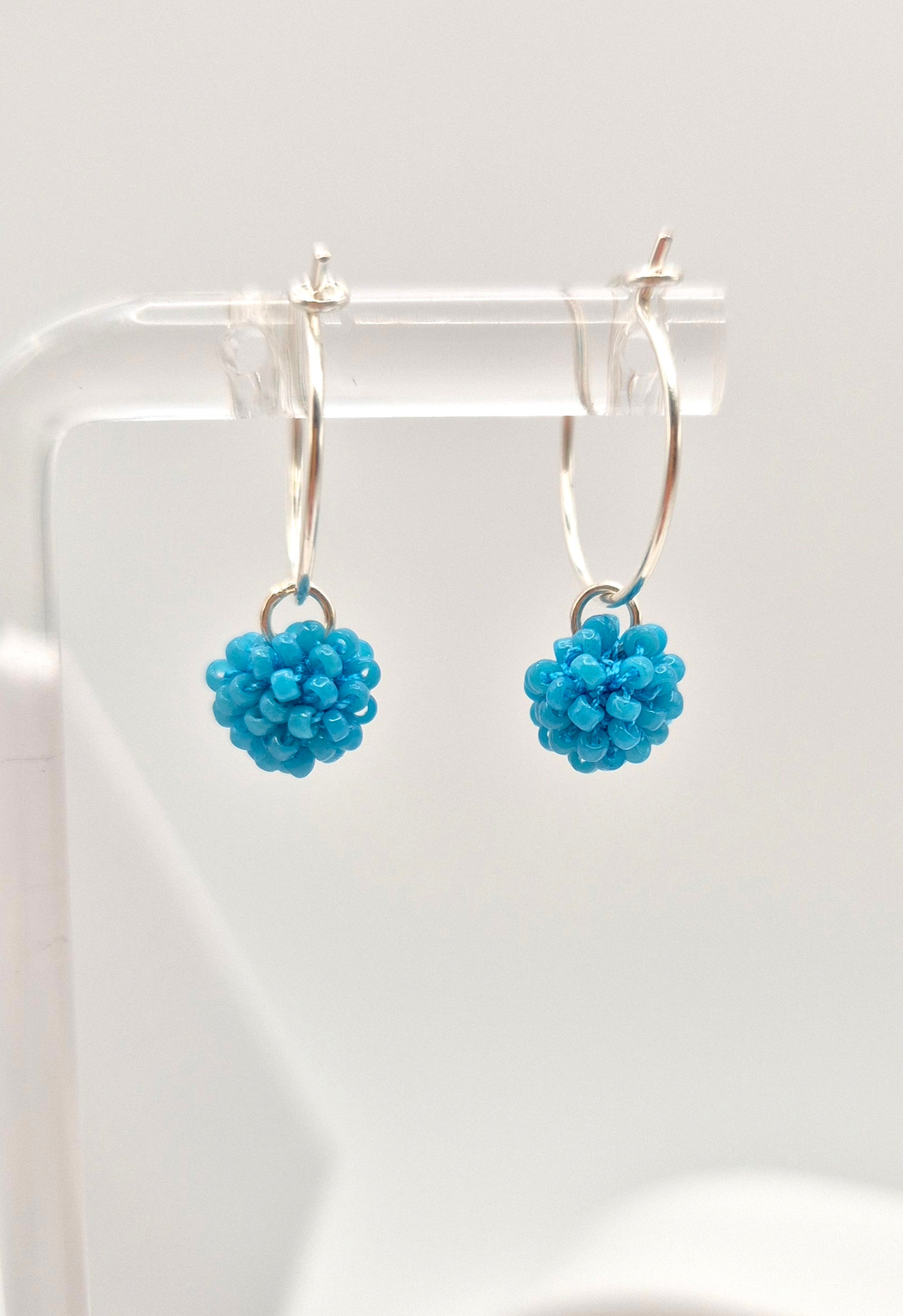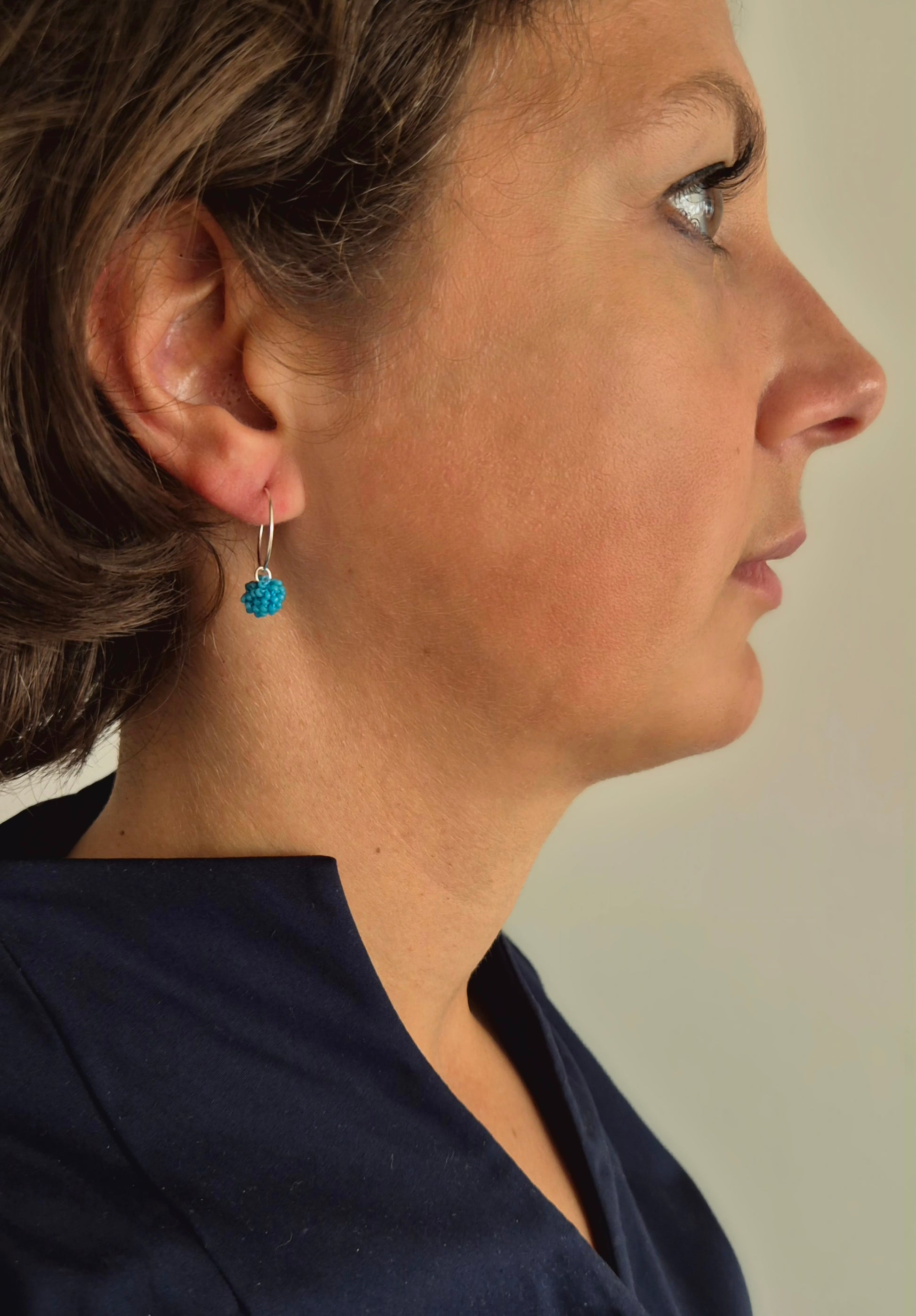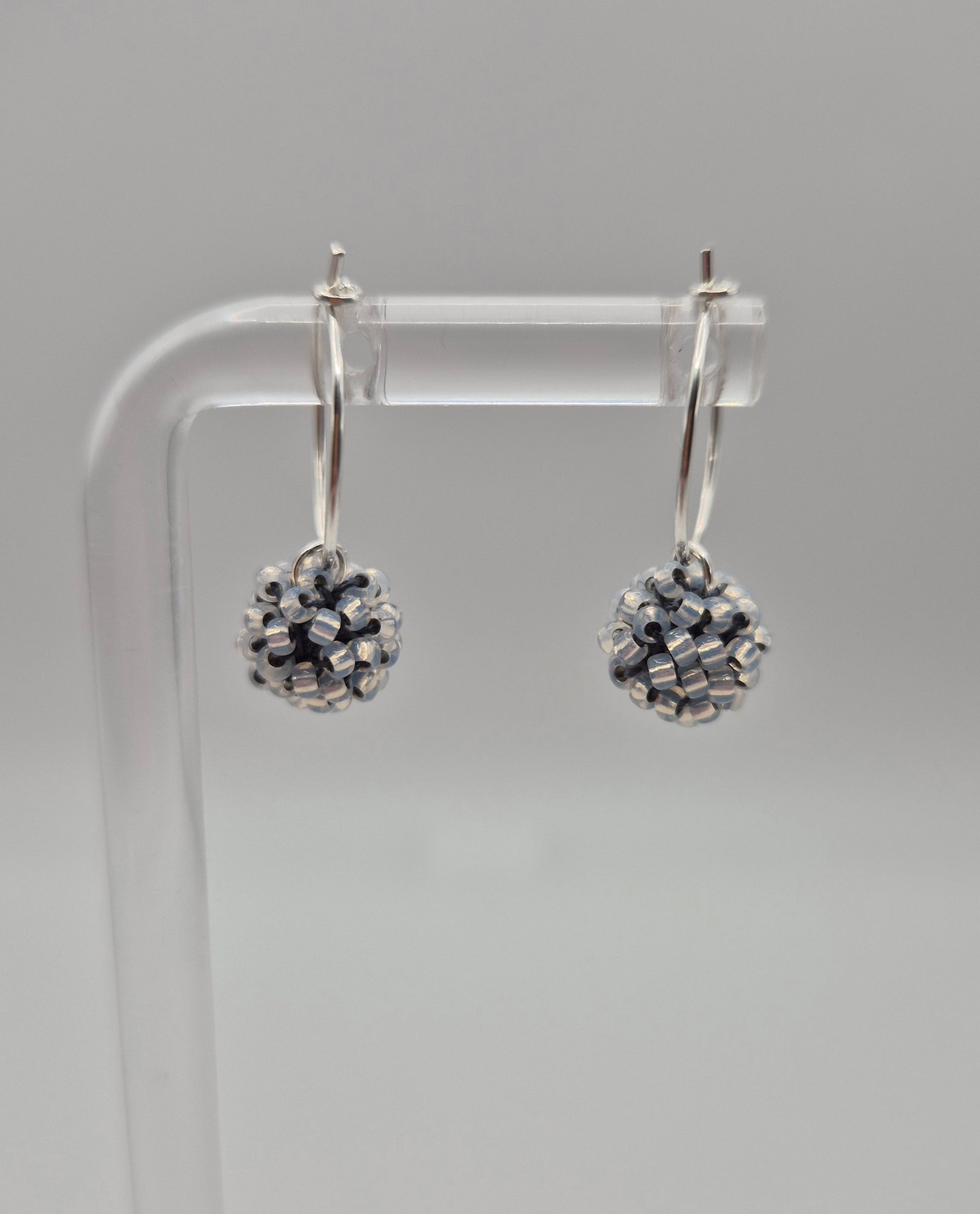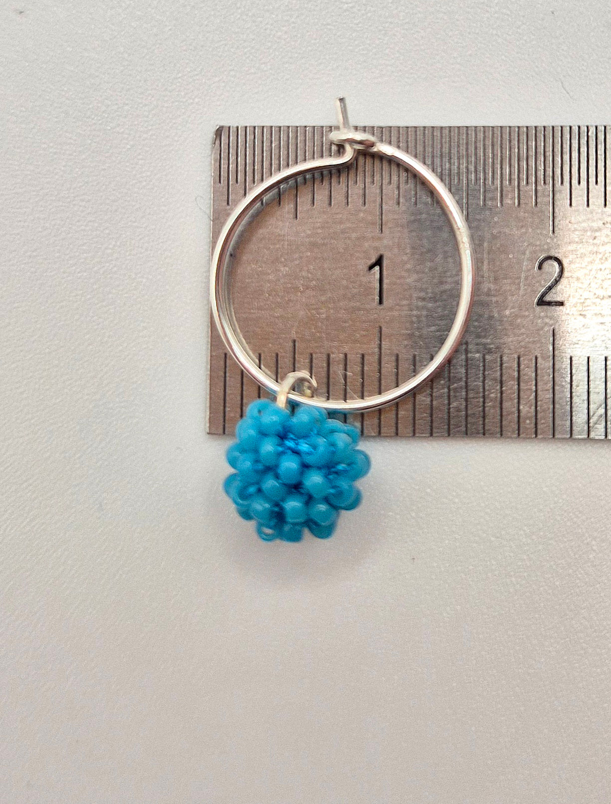 Einzigartige KUULA mini Creolen. Auf Baumwollgarn aufgezogene 2mm große Rocailles Glasperlen, in aufwändiger Häkeltechnik von Hand hergestellt. Die Ohrringe haben jeweils einen Anhänger in Form einer Kugel gehäkelt und vernäht. Die Öse ist eingehäkelt und vernäht. Der Schmuck kommt komplett ohne Kleber aus.