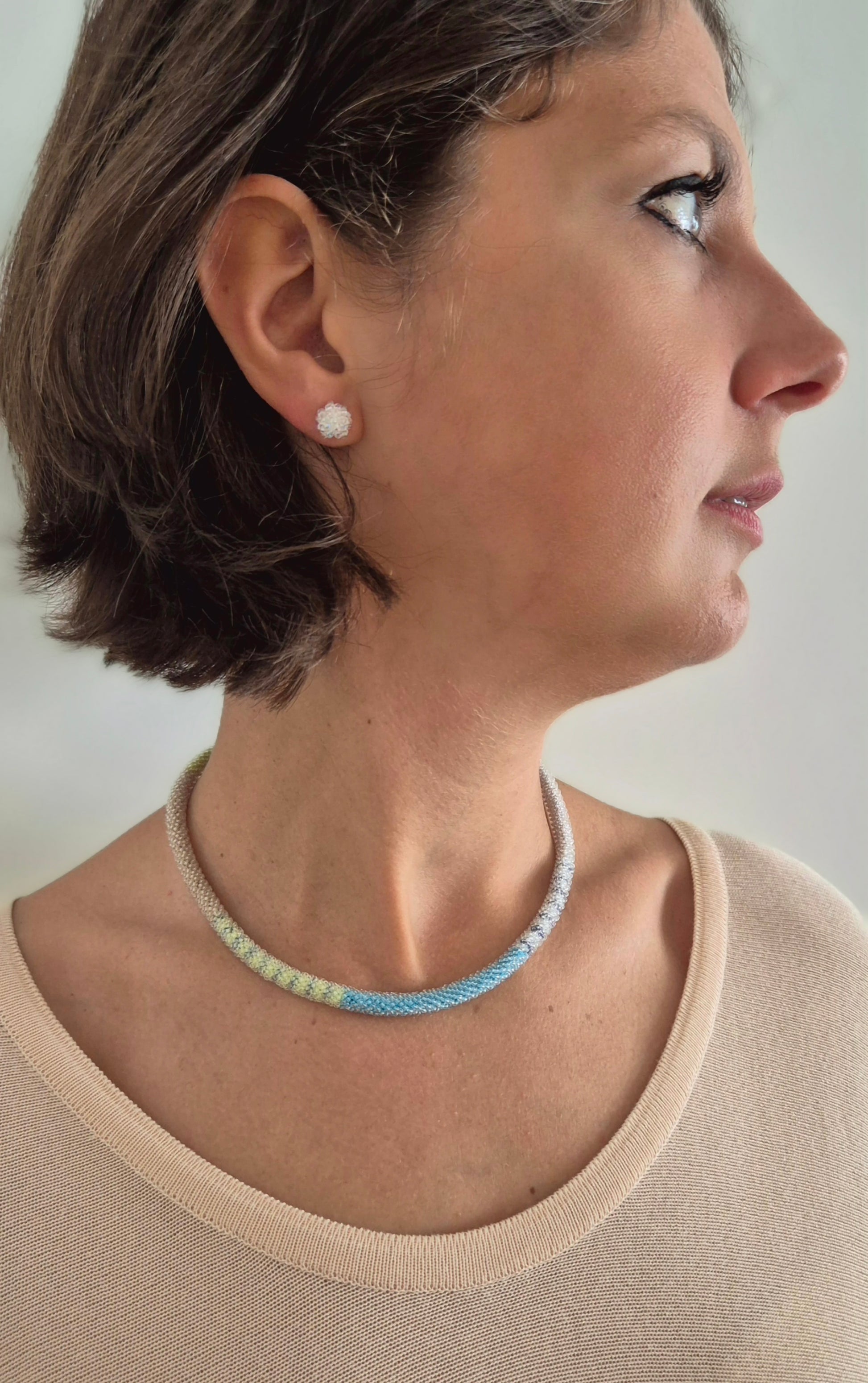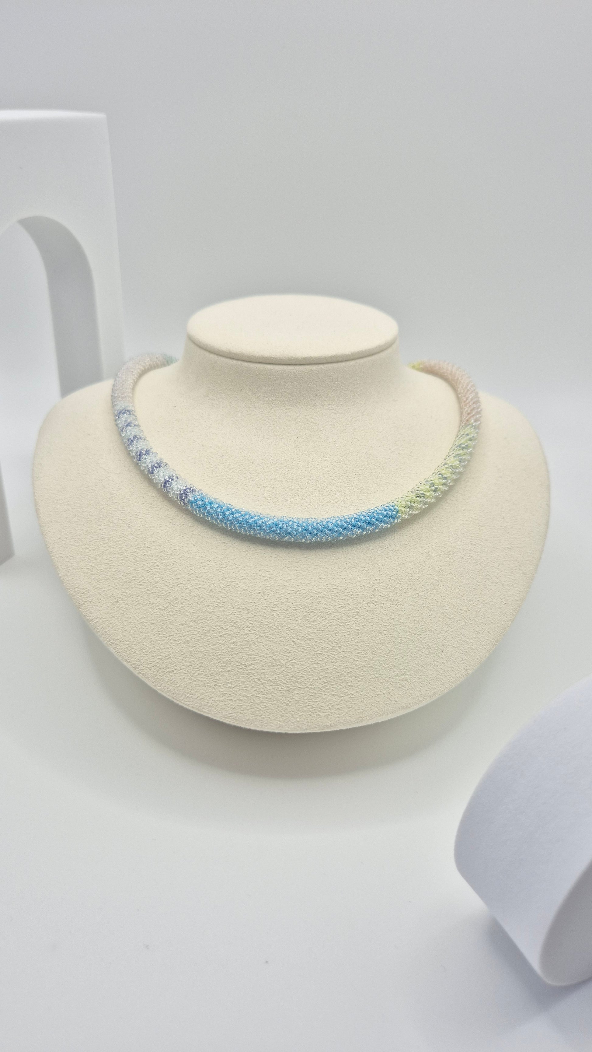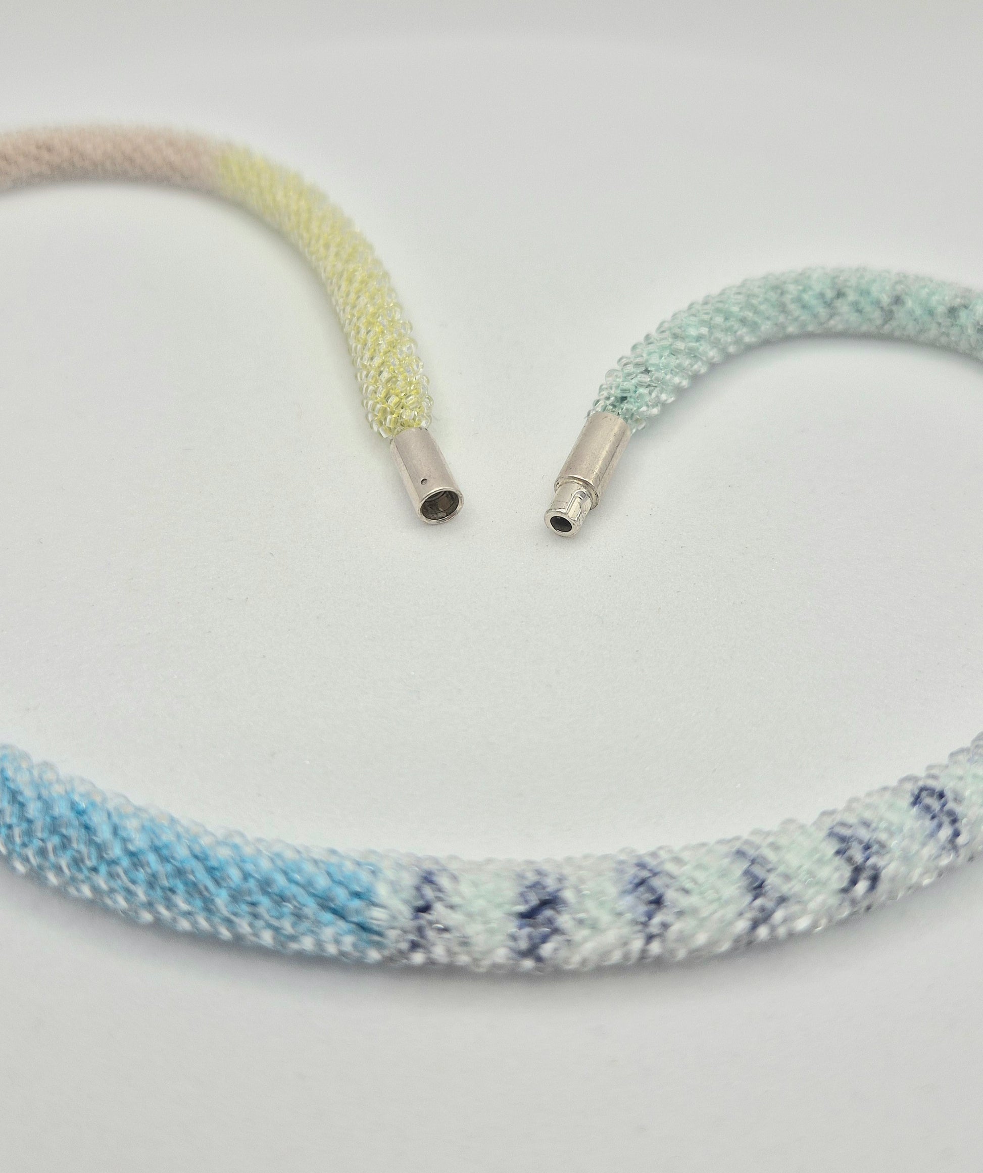 Einzigartige TUBE Halskette. Auf Baumwollgarn aufgezogene 1mm kleine transparente Rocailles Glasperlen, in aufwändiger Häkeltechnik von Hand hergestellt. Die Kette besteht aus einer flexiblen, sich anschmiegenden fein gehäkelten "Kordel". Für ein leichteres An- und Ablegen mit einem 925er Silber - Bajonettverschluss.