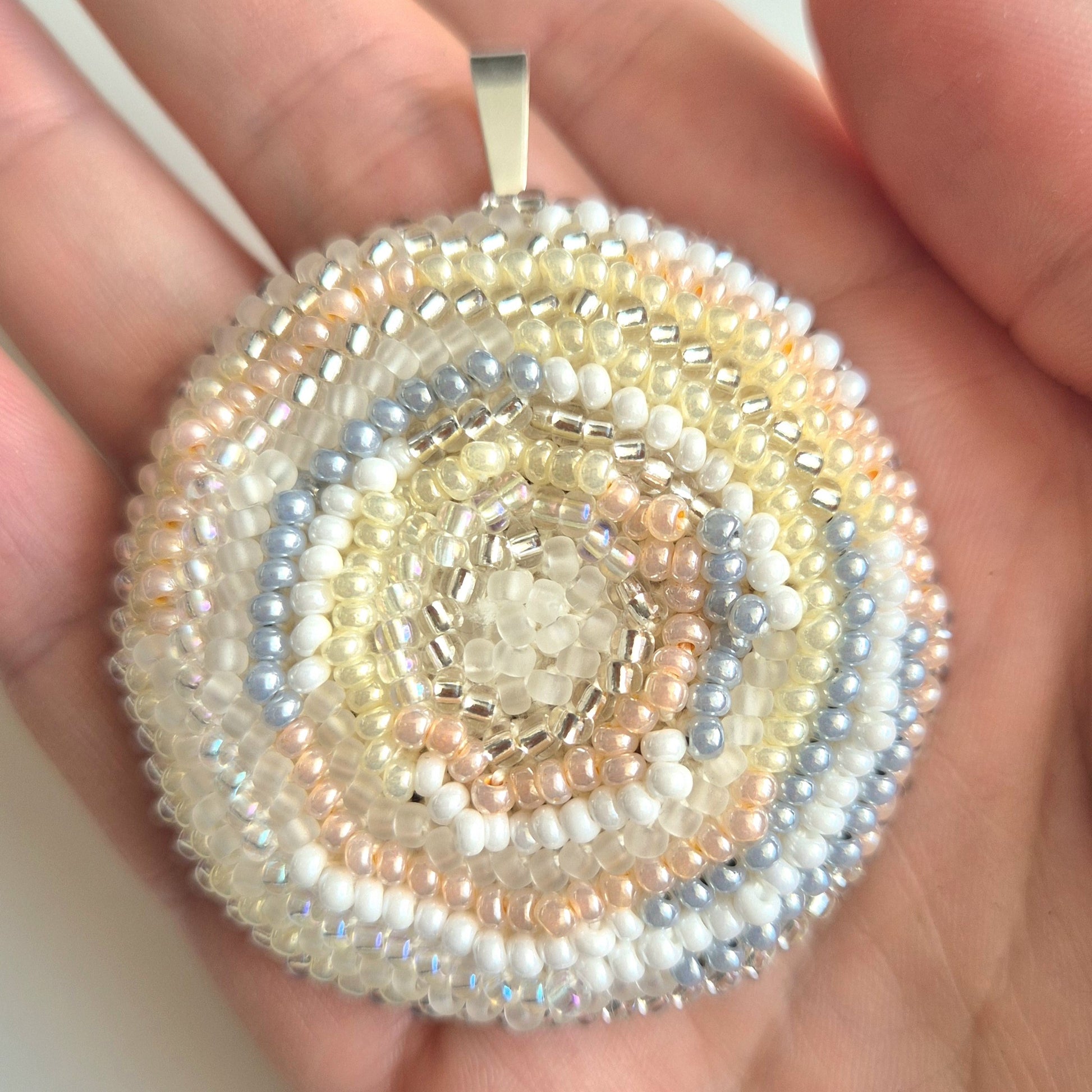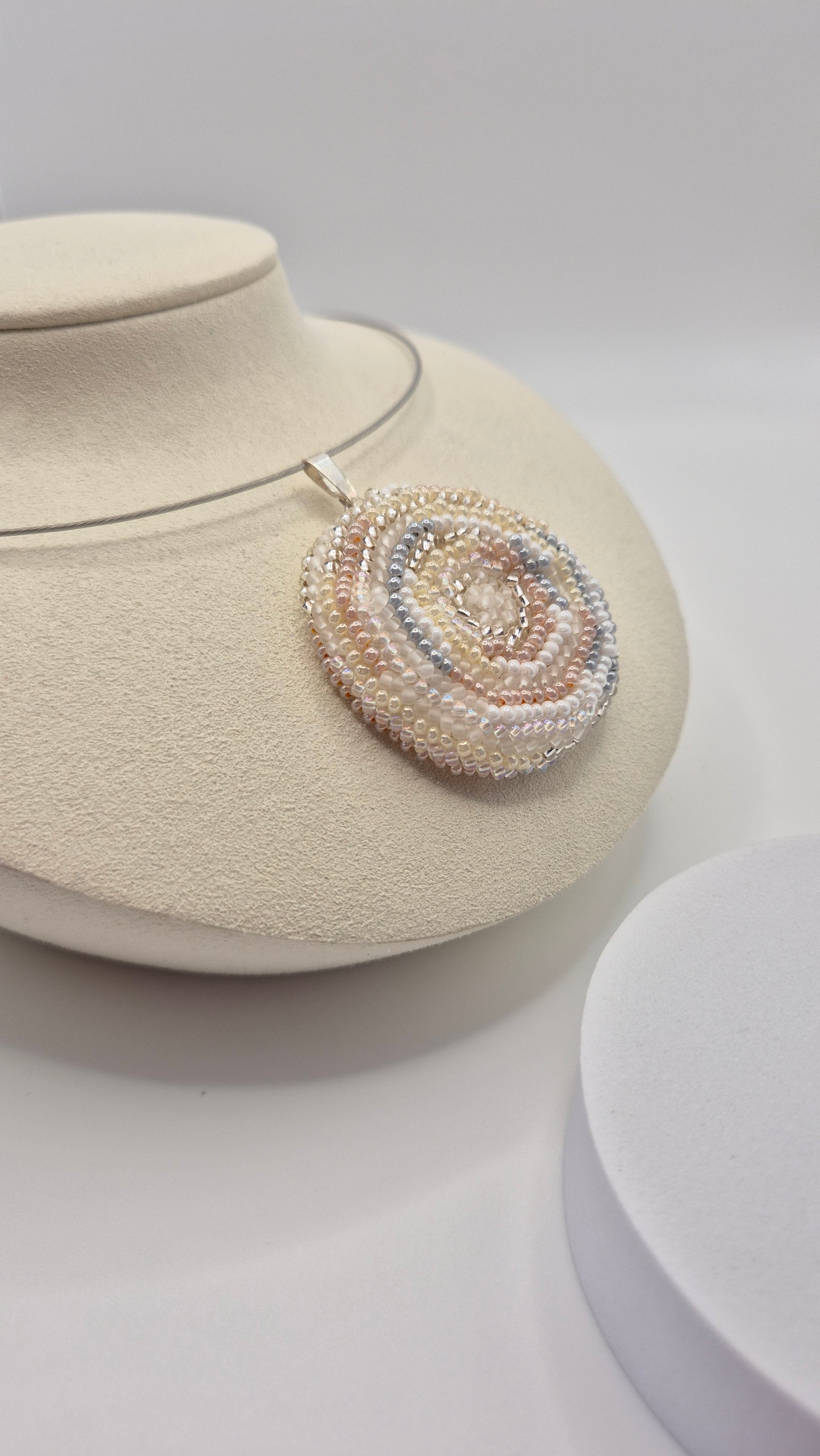 Einzigartige Halskette. Der abnehmbare Kettenanhänger besteht aus aufgezogene weiß- (transparente) 2,5 mm große Glasperlen ( teils mit versilberten Glasperlenlöchern), die auf Baumwollgarn aufgezogen und in aufwändiger Häkeltechnik verarbeitet wurden. Der flexible Halsreif besteht aus einem Edelstahlseil mit Schraubverschluss. Die Anhängerschlaufe besteht aus 925er Silber.