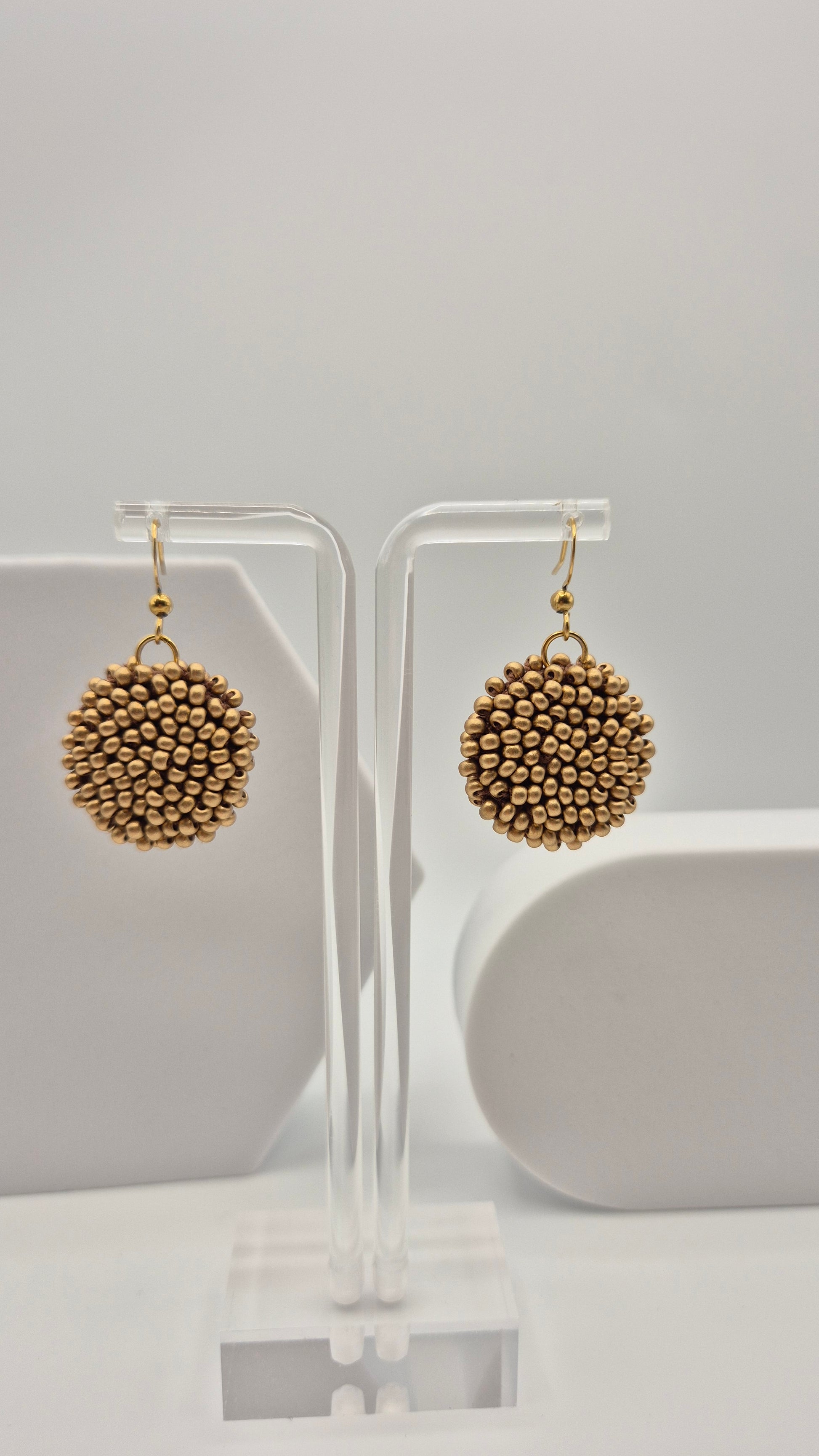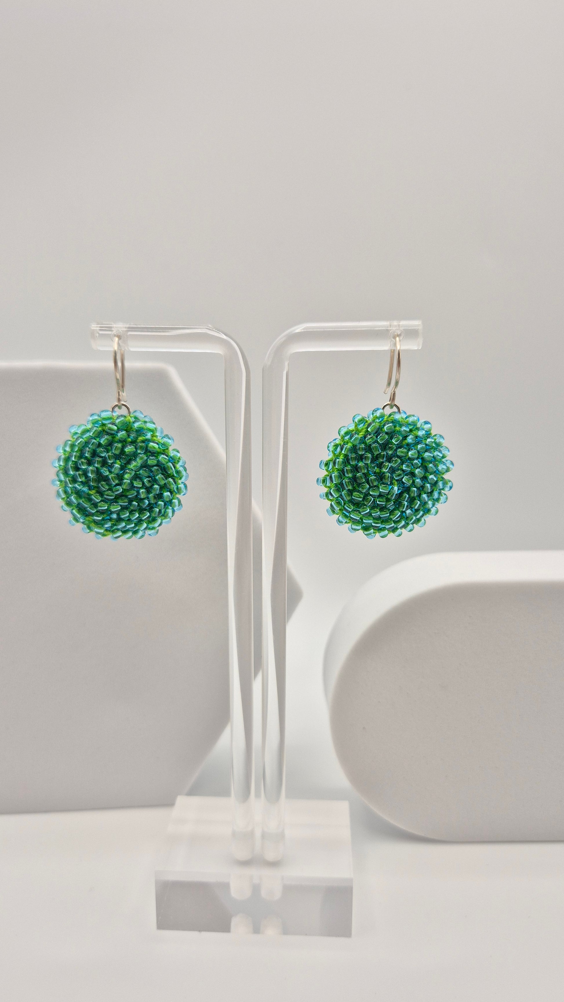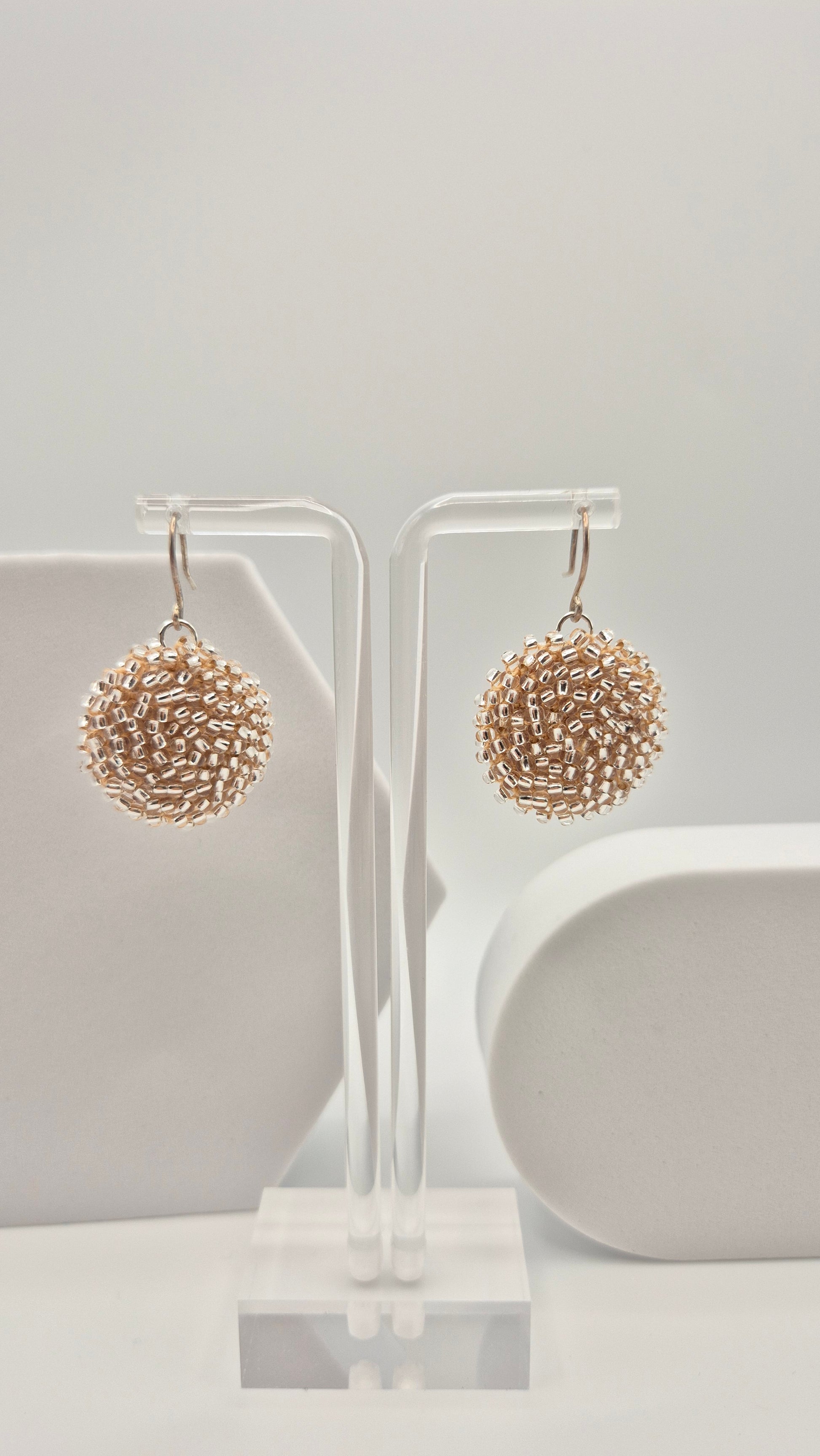 Einzigartige LINNSI Hänger . Auf Baumwollgarn aufgezogene 2,5 - 3 mm große Rocailles Glasperlen, in aufwändiger Häkeltechnik von Hand hergestellt. Die Ohrringe haben jeweils einen Anhänger in Form einer Linse gehäkelt und vernäht. Die Öse ist eingehäkelt und vernäht. Der Schmuck kommt komplett ohne Kleber aus.
