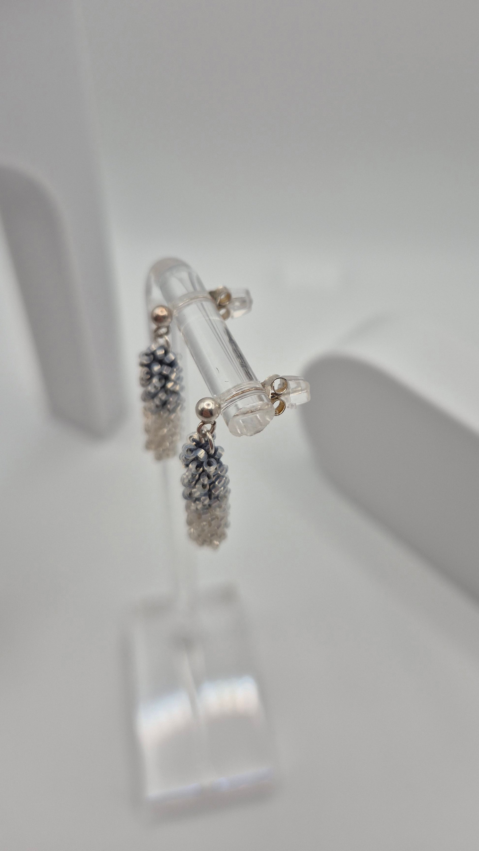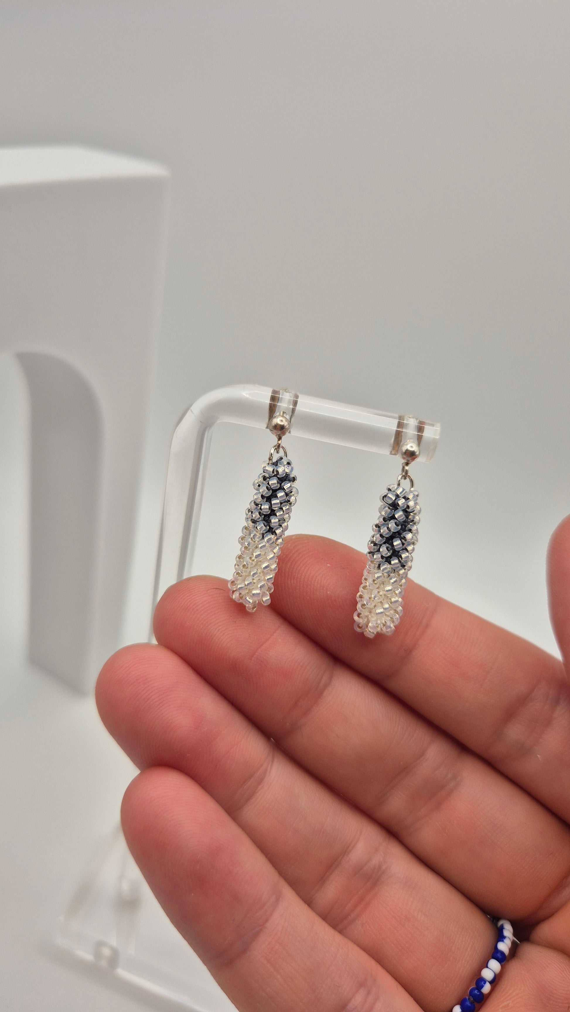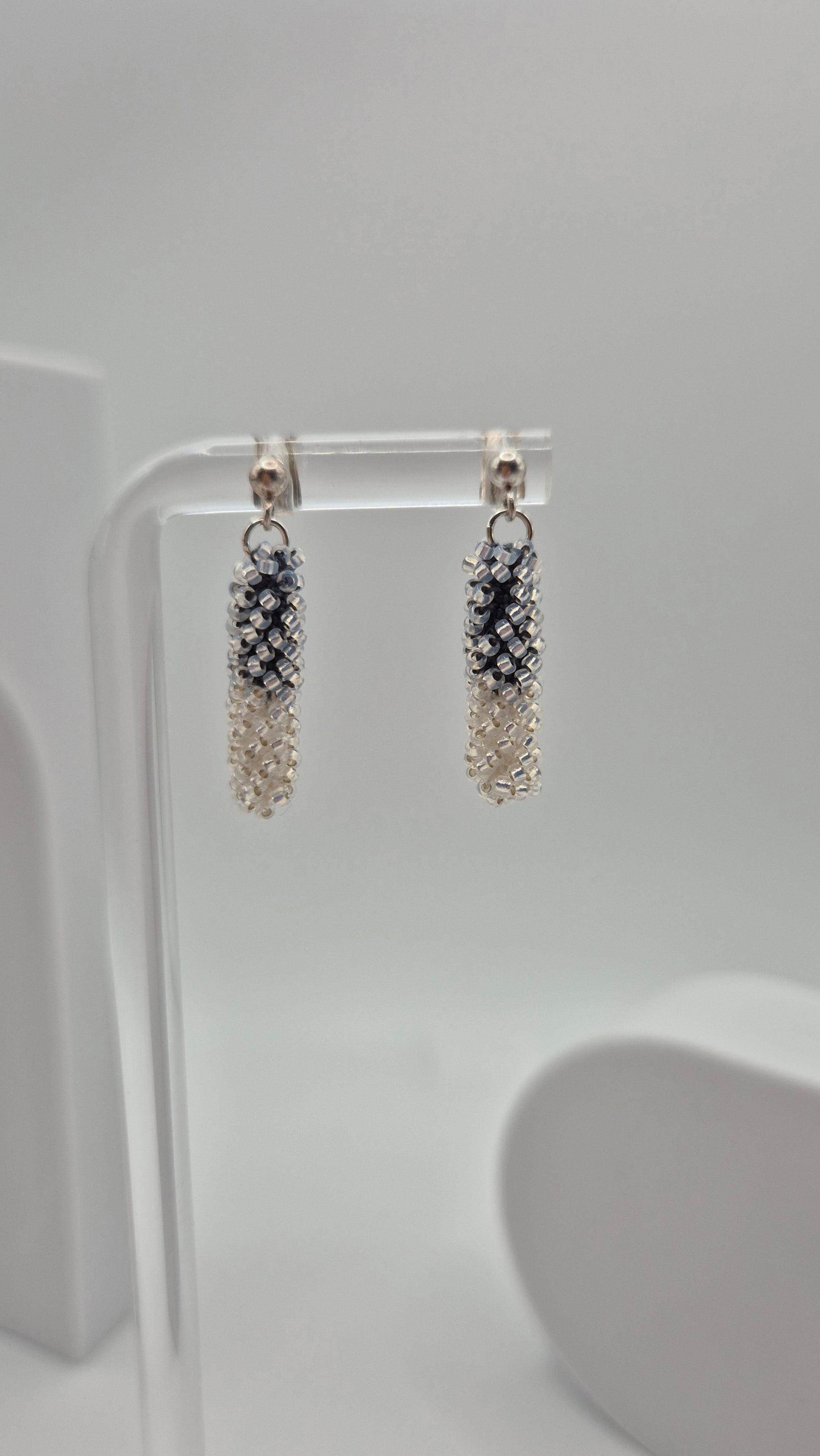 Einzigartige Ohrstecker Hänger STICK midi. Auf Baumwollgarn aufgezogene 1mm große Rocailles Glasperlen, in aufwändiger Häkeltechnik von Hand hergestellt.