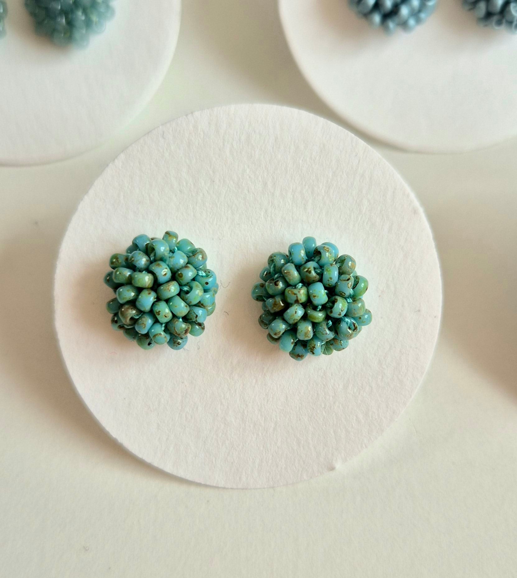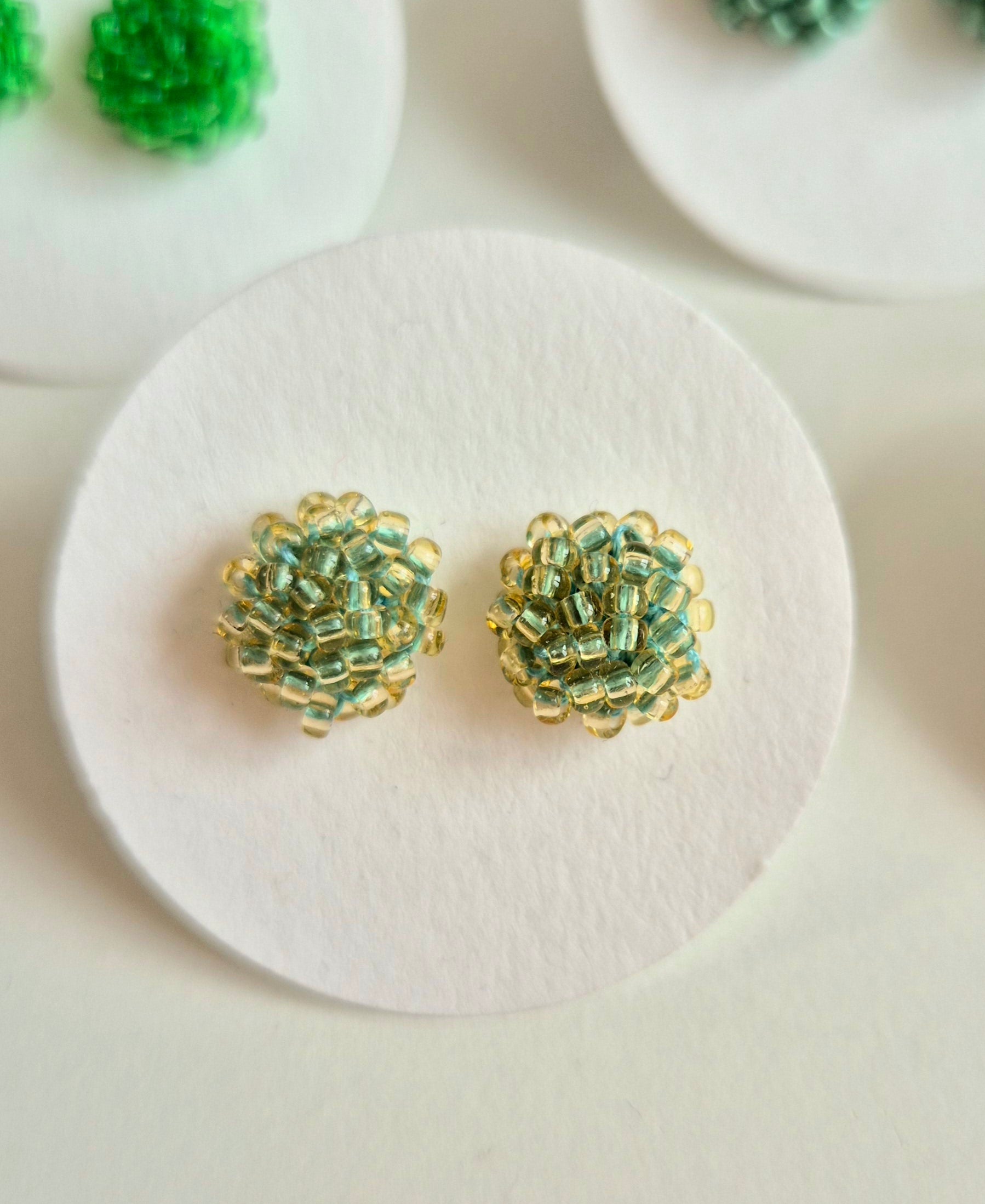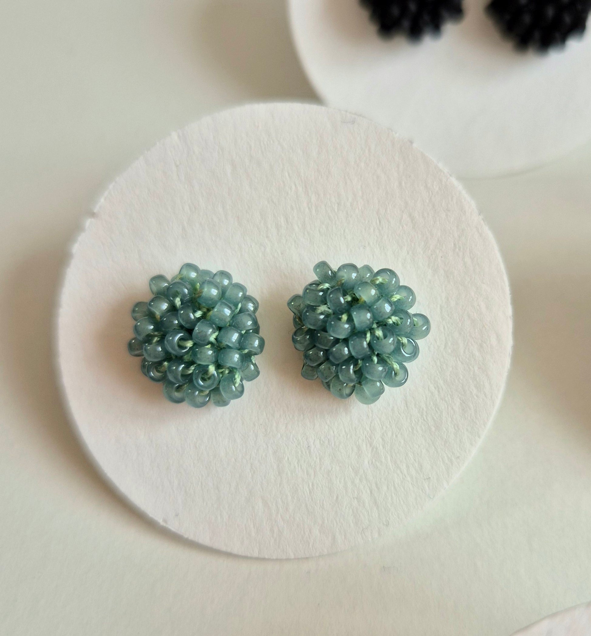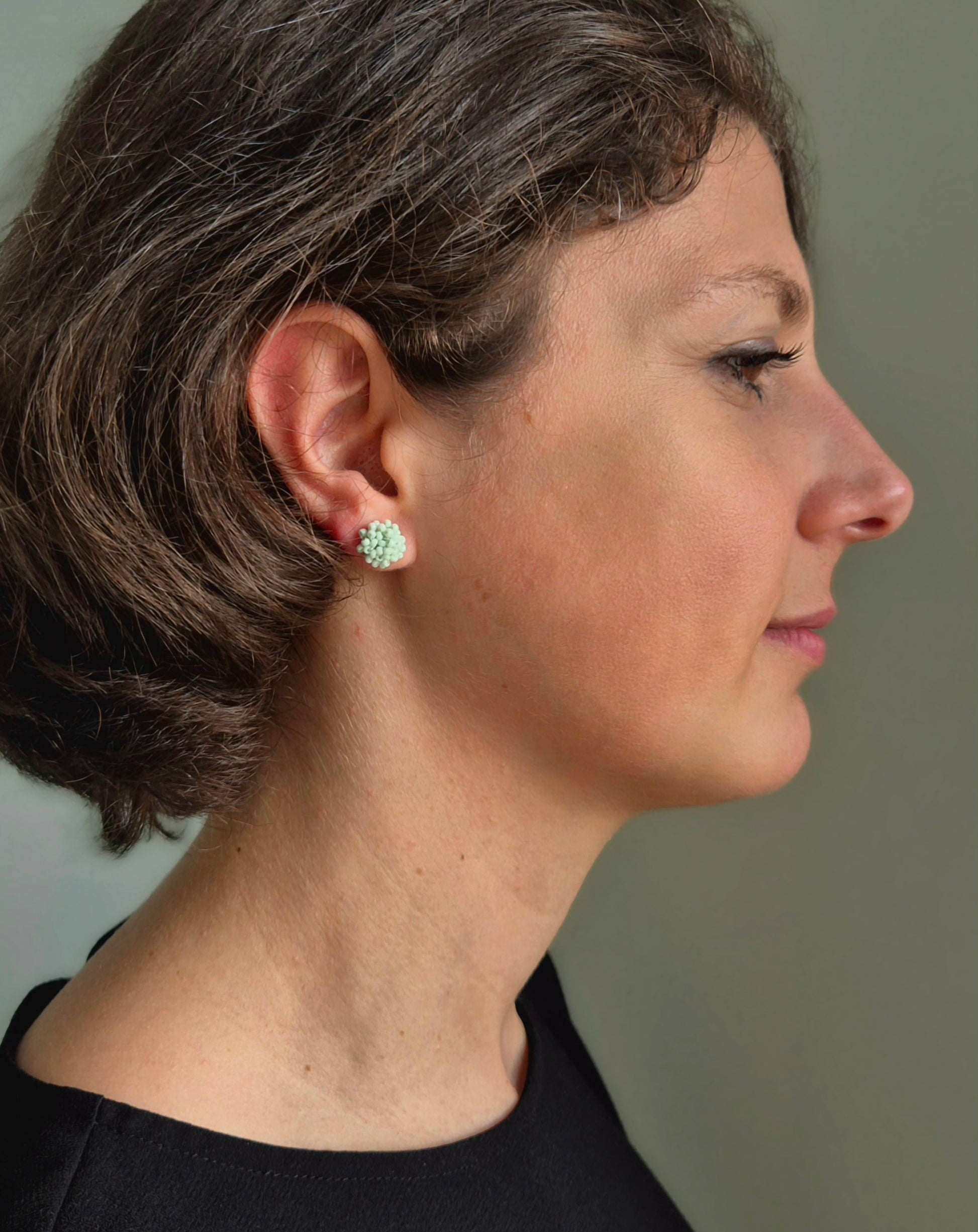 Einzigartige Ohrstecker LINNSI. Auf Baumwollgarn aufgezogene 2mm große Rocailles Glasperlen, in aufwändiger Häkeltechnik von Hand hergestellt. Die Stecker sind in Form einer Linse gehäkelt und vernäht. Der Schmuck kommt komplett ohne Kleber aus.