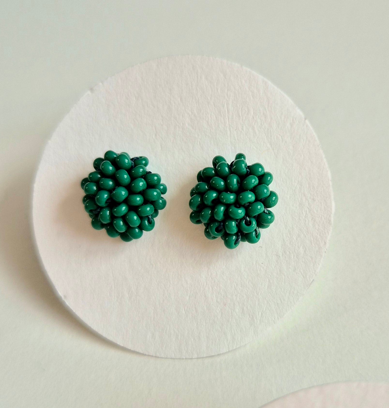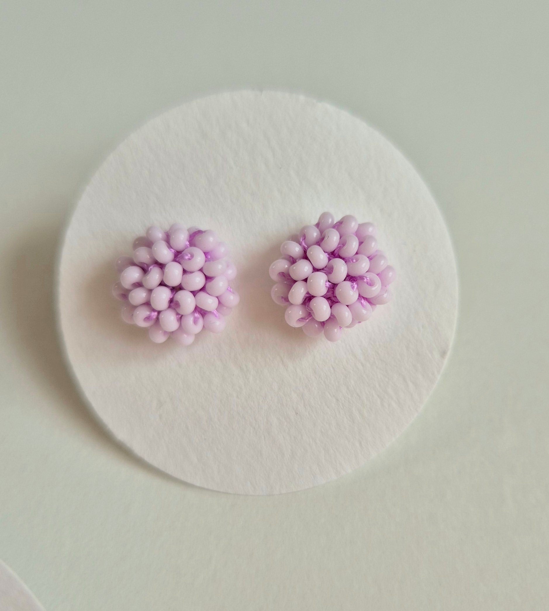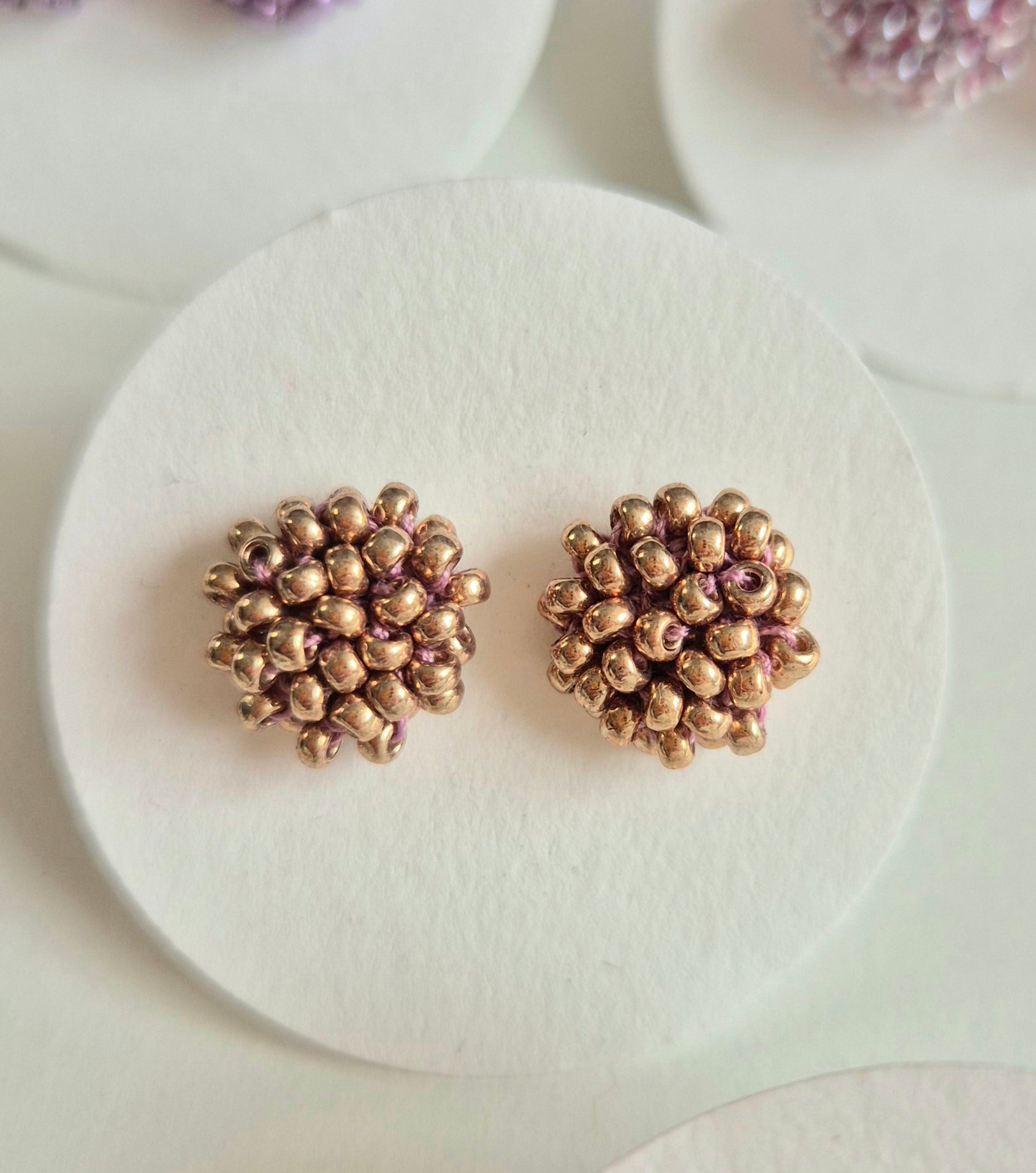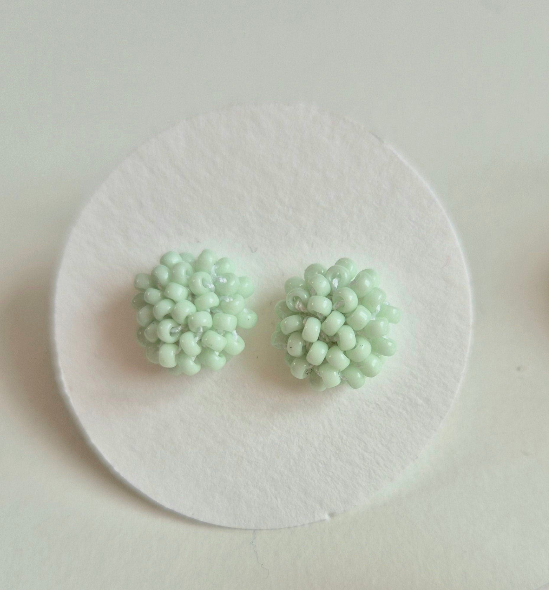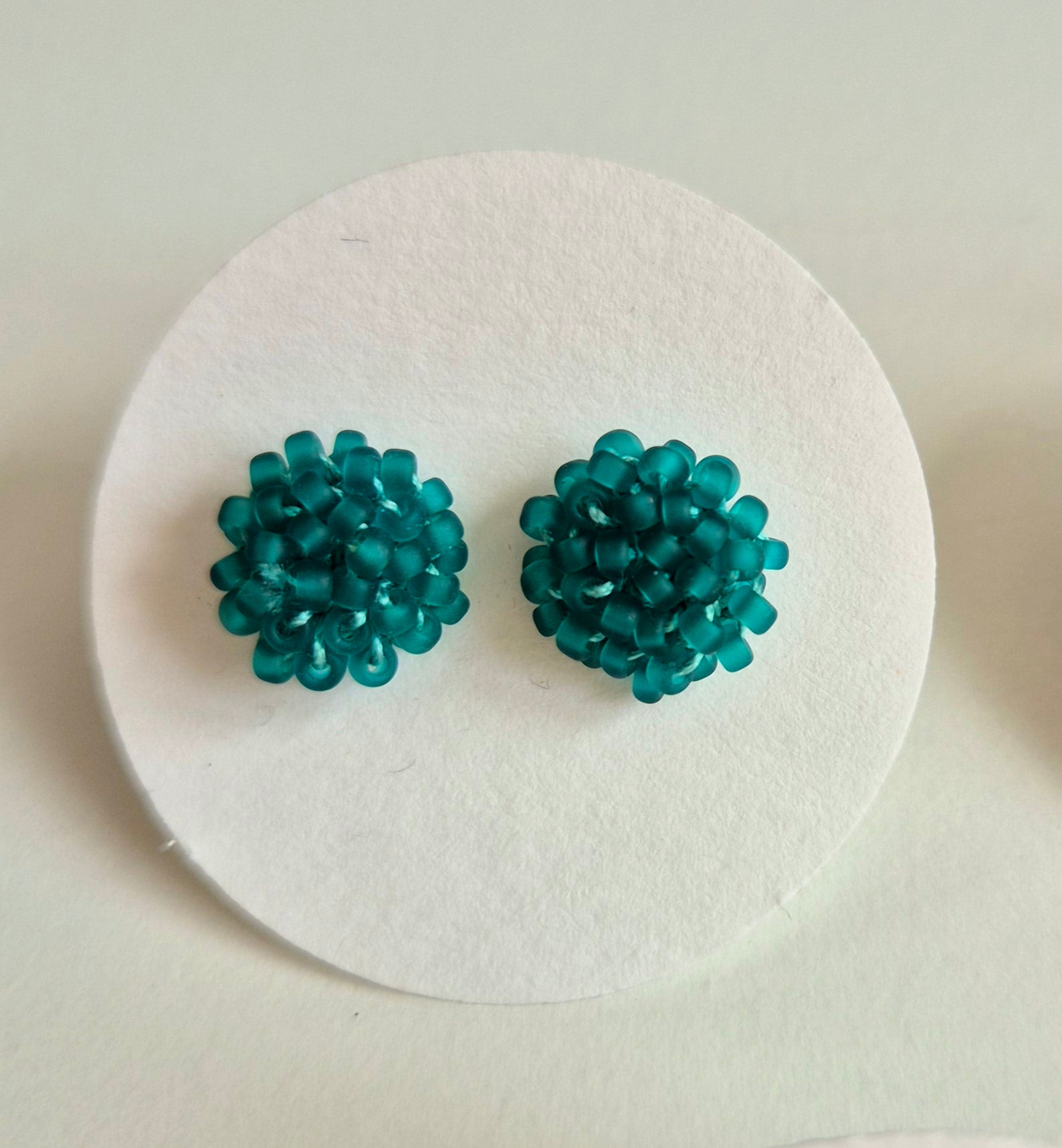 Einzigartige Ohrstecker LINNSI. Auf Baumwollgarn aufgezogene 2mm große Rocailles Glasperlen, in aufwändiger Häkeltechnik von Hand hergestellt. Die Stecker sind in Form einer Linse gehäkelt und vernäht. Der Schmuck kommt komplett ohne Kleber aus.