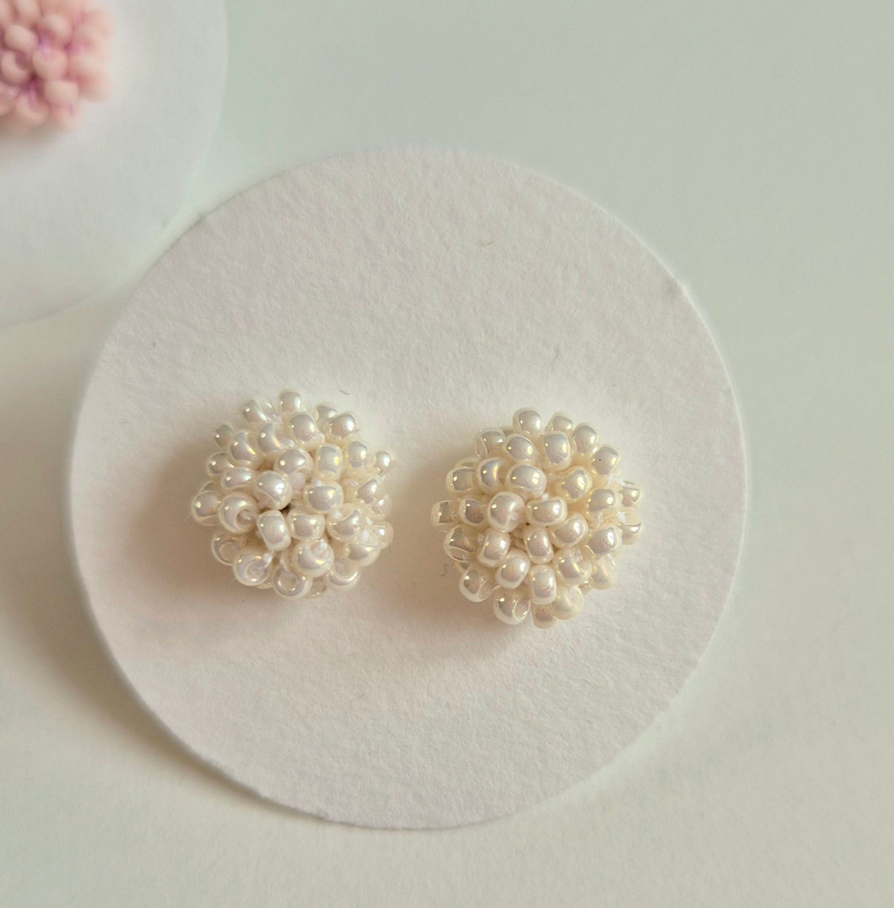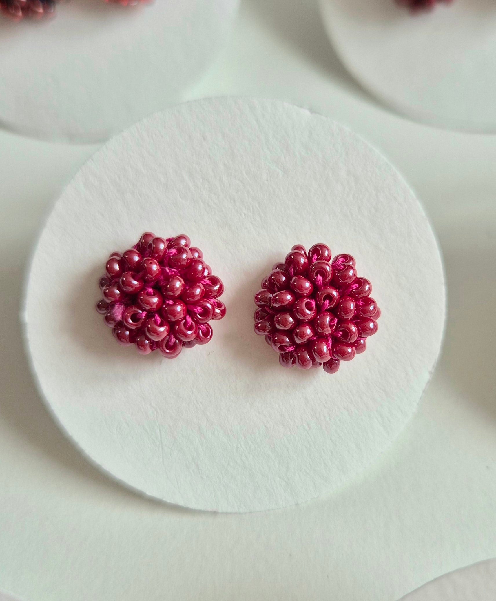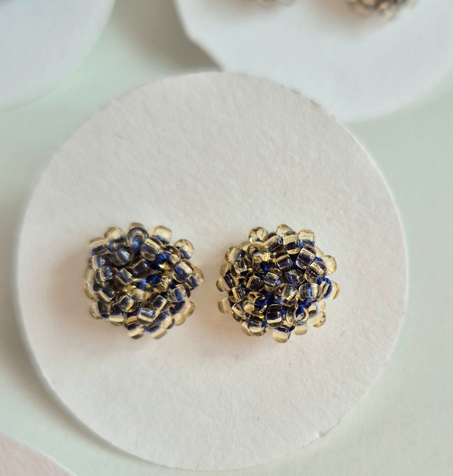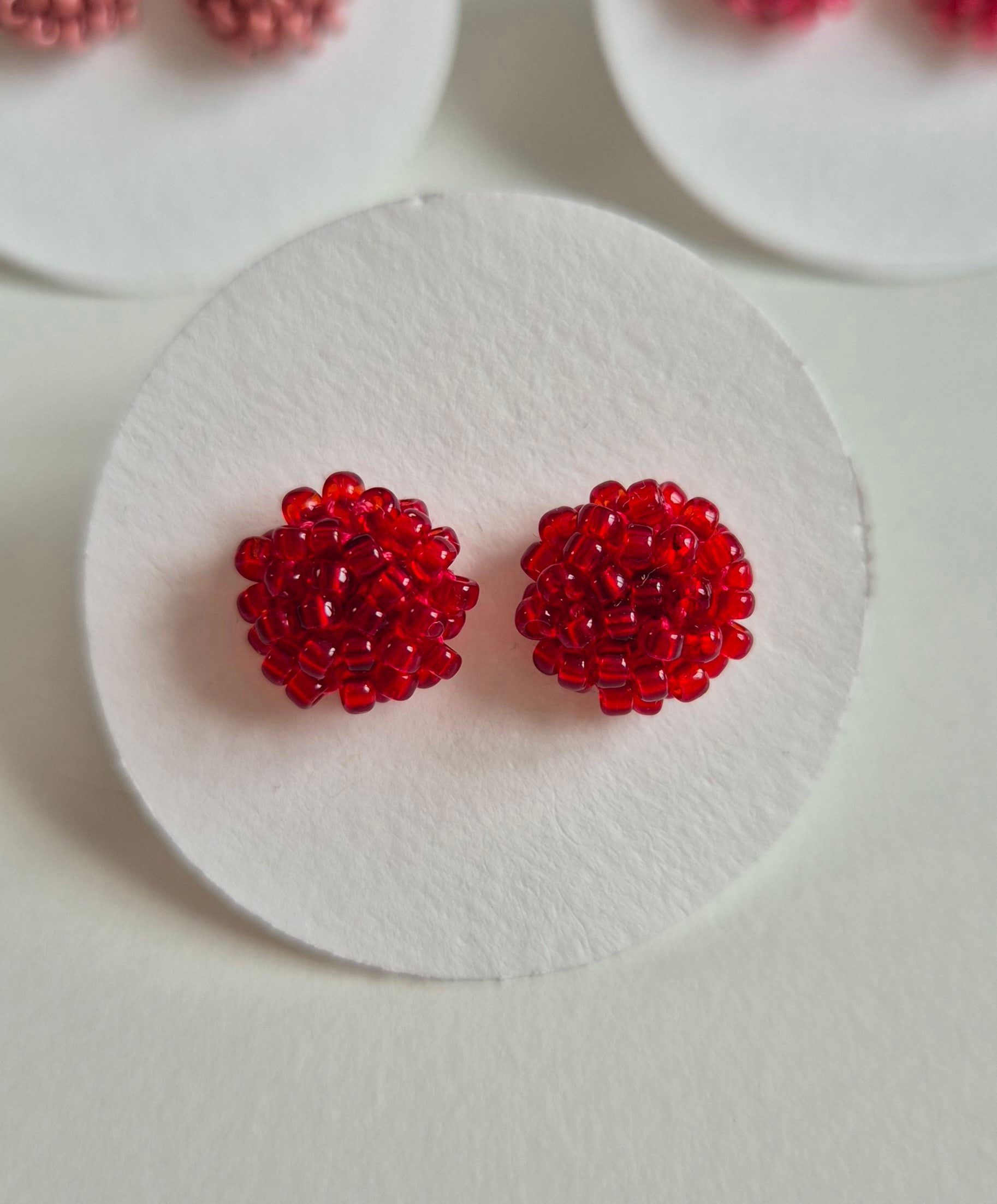 Einzigartige Ohrstecker LINNSI. Auf Baumwollgarn aufgezogene 2mm große Rocailles Glasperlen, in aufwändiger Häkeltechnik von Hand hergestellt. Die Stecker sind in Form einer Linse gehäkelt und vernäht. Der Schmuck kommt komplett ohne Kleber aus.