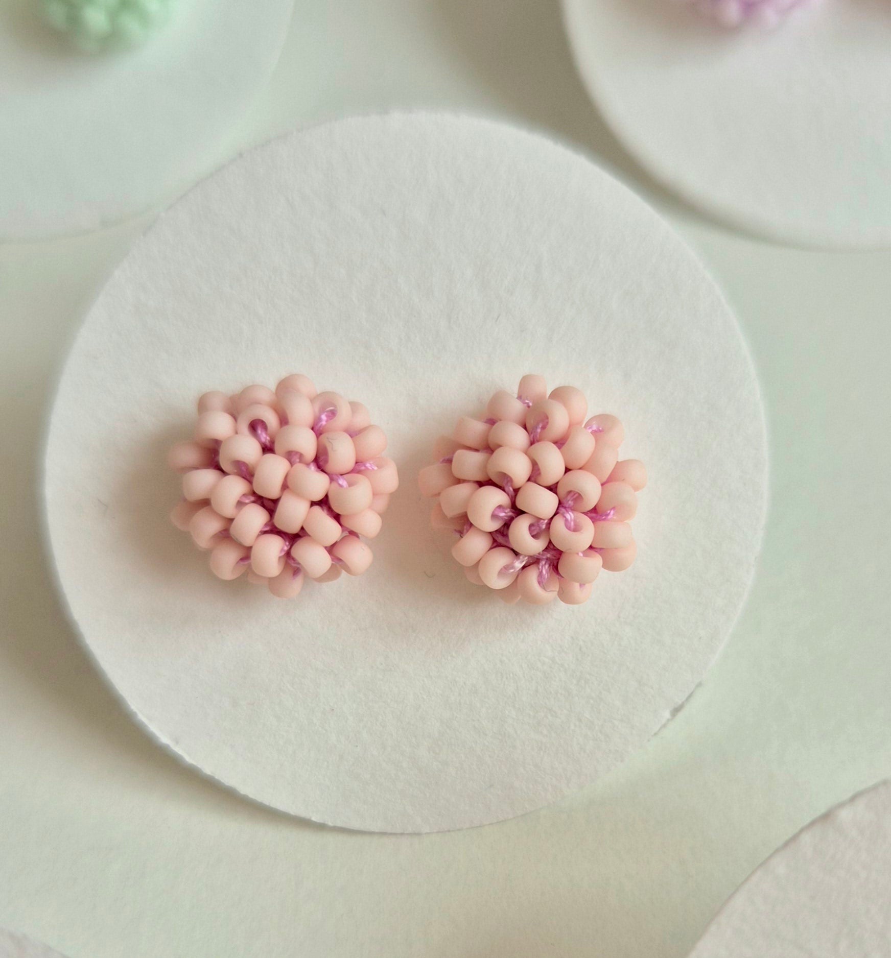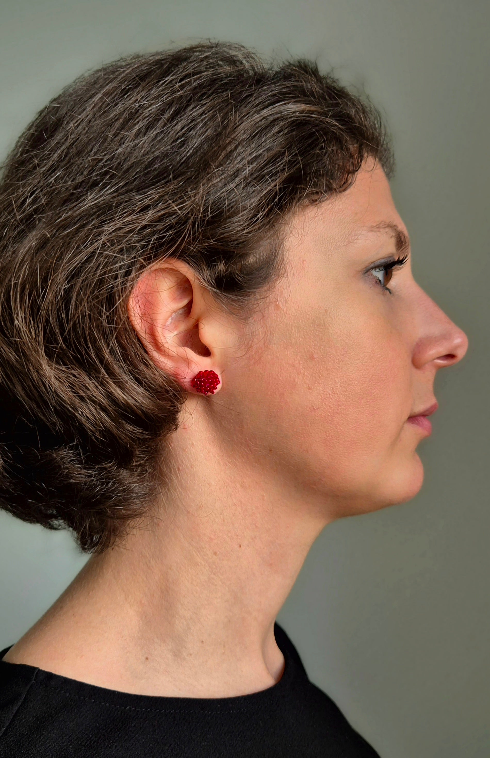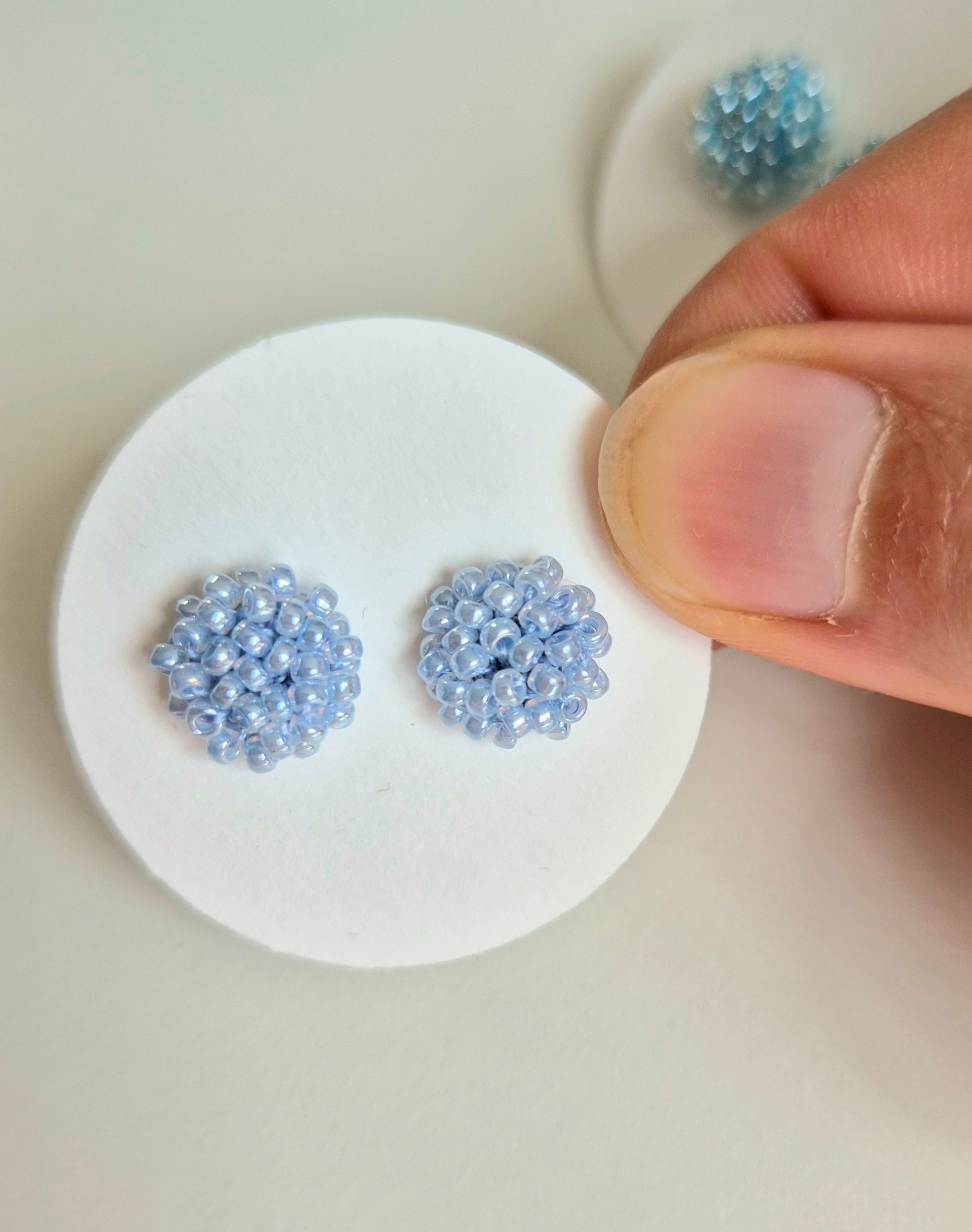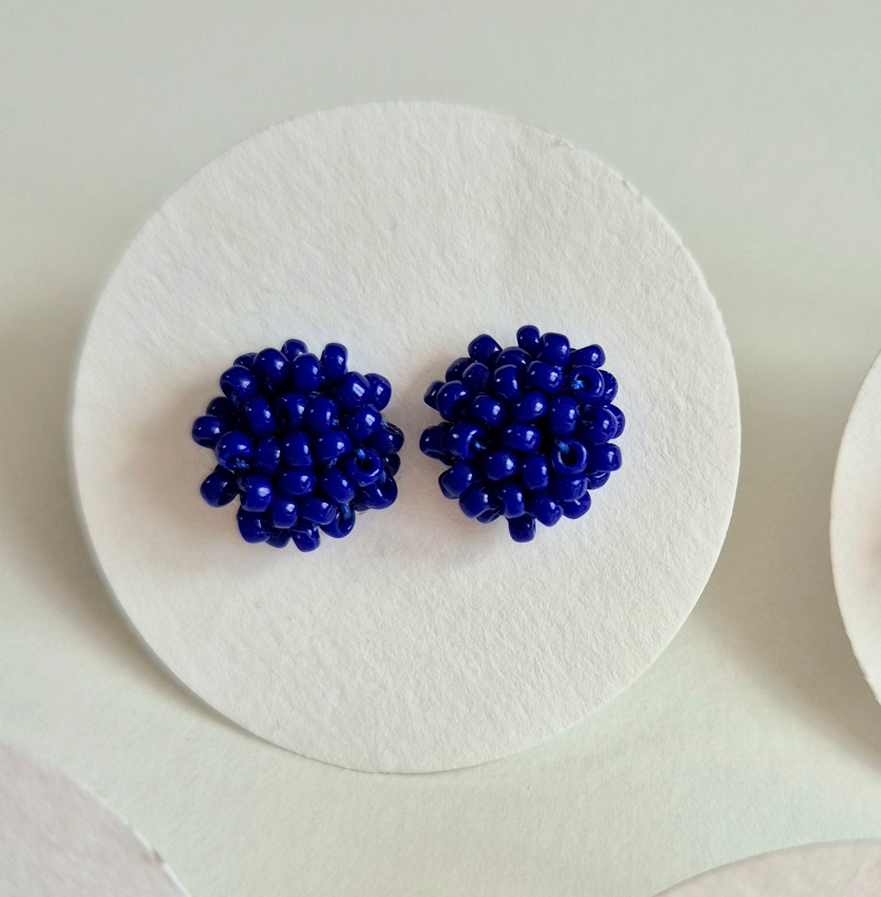 Einzigartige Ohrstecker LINNSI. Auf Baumwollgarn aufgezogene 2mm große Rocailles Glasperlen, in aufwändiger Häkeltechnik von Hand hergestellt. Die Stecker sind in Form einer Linse gehäkelt und vernäht. Der Schmuck kommt komplett ohne Kleber aus.