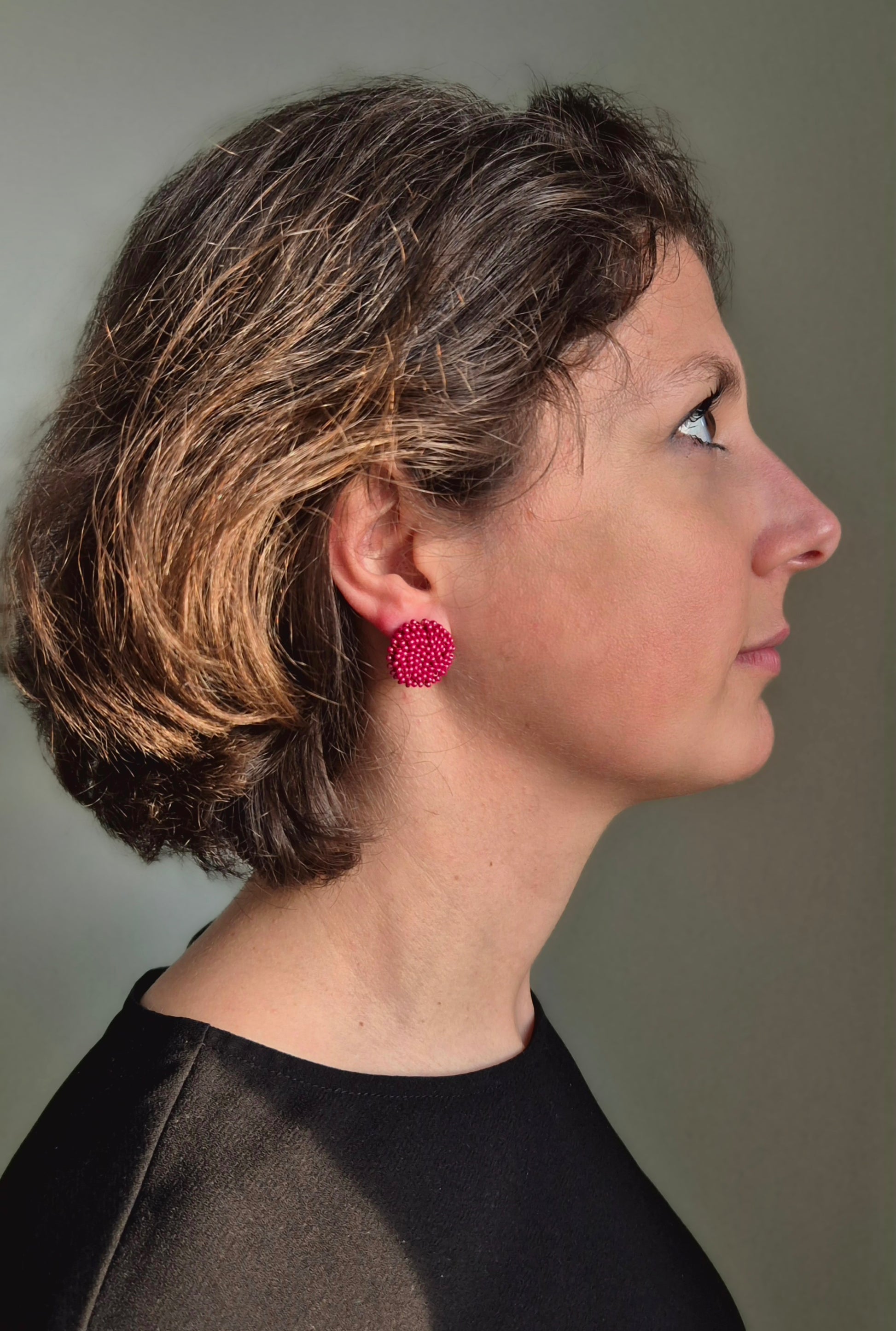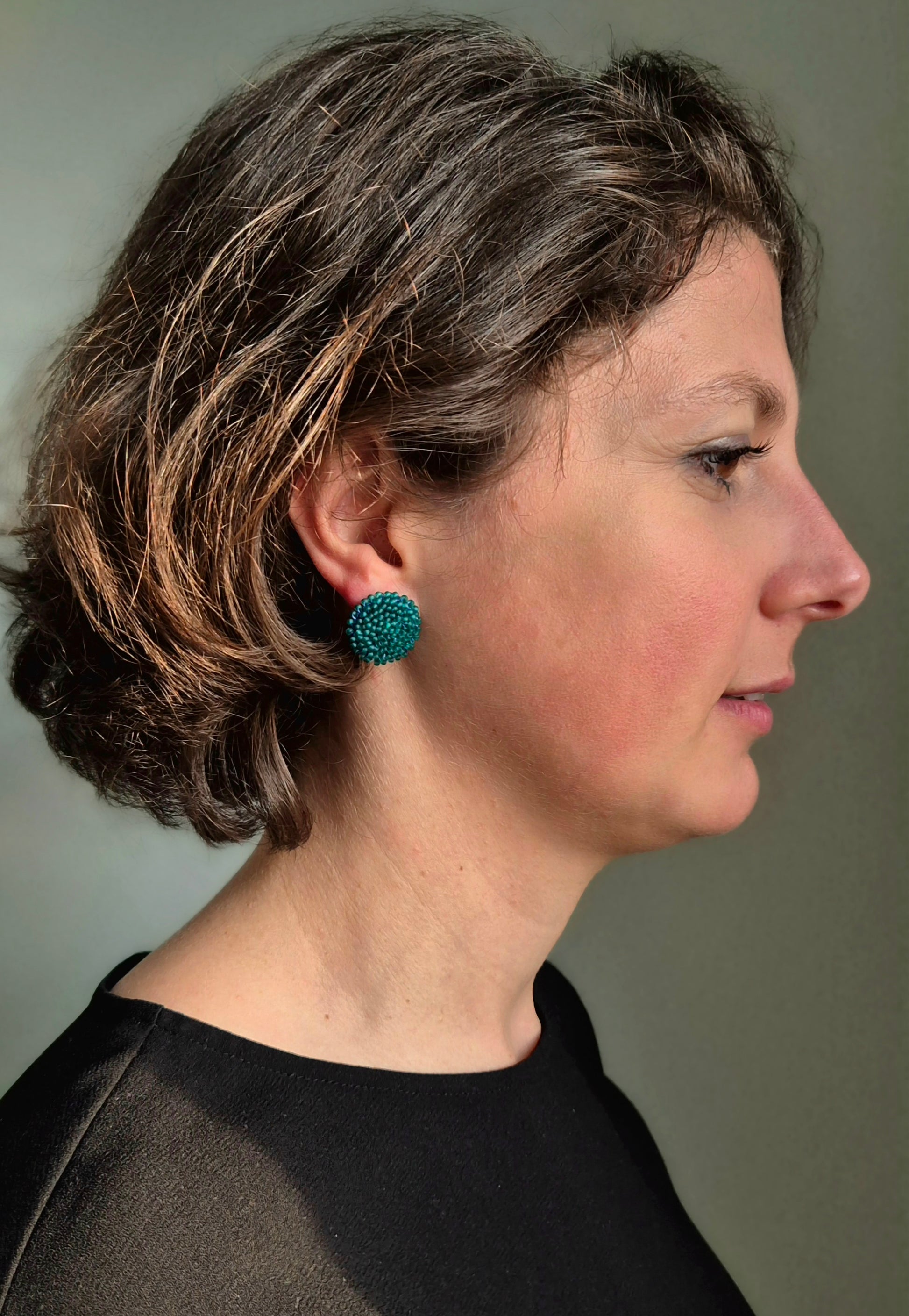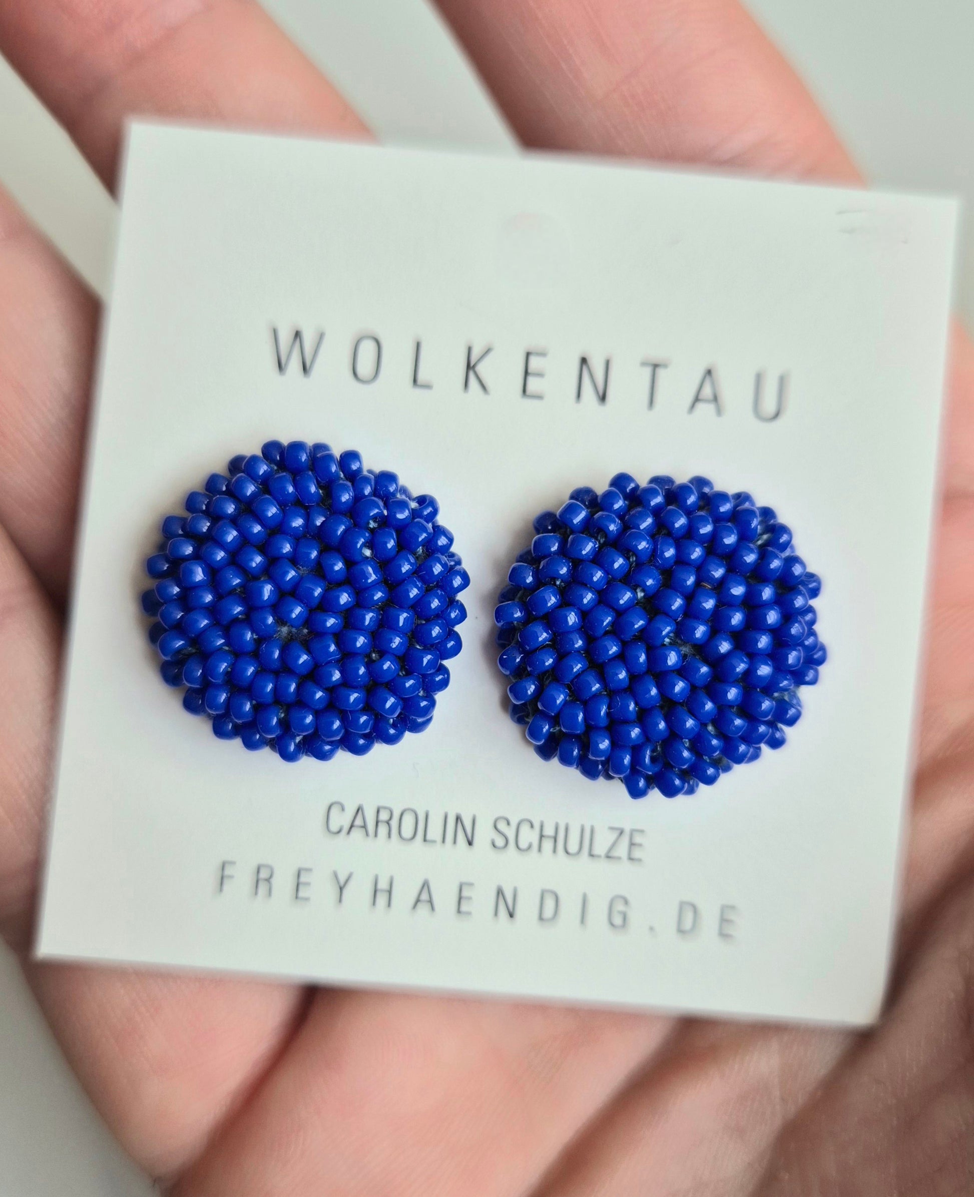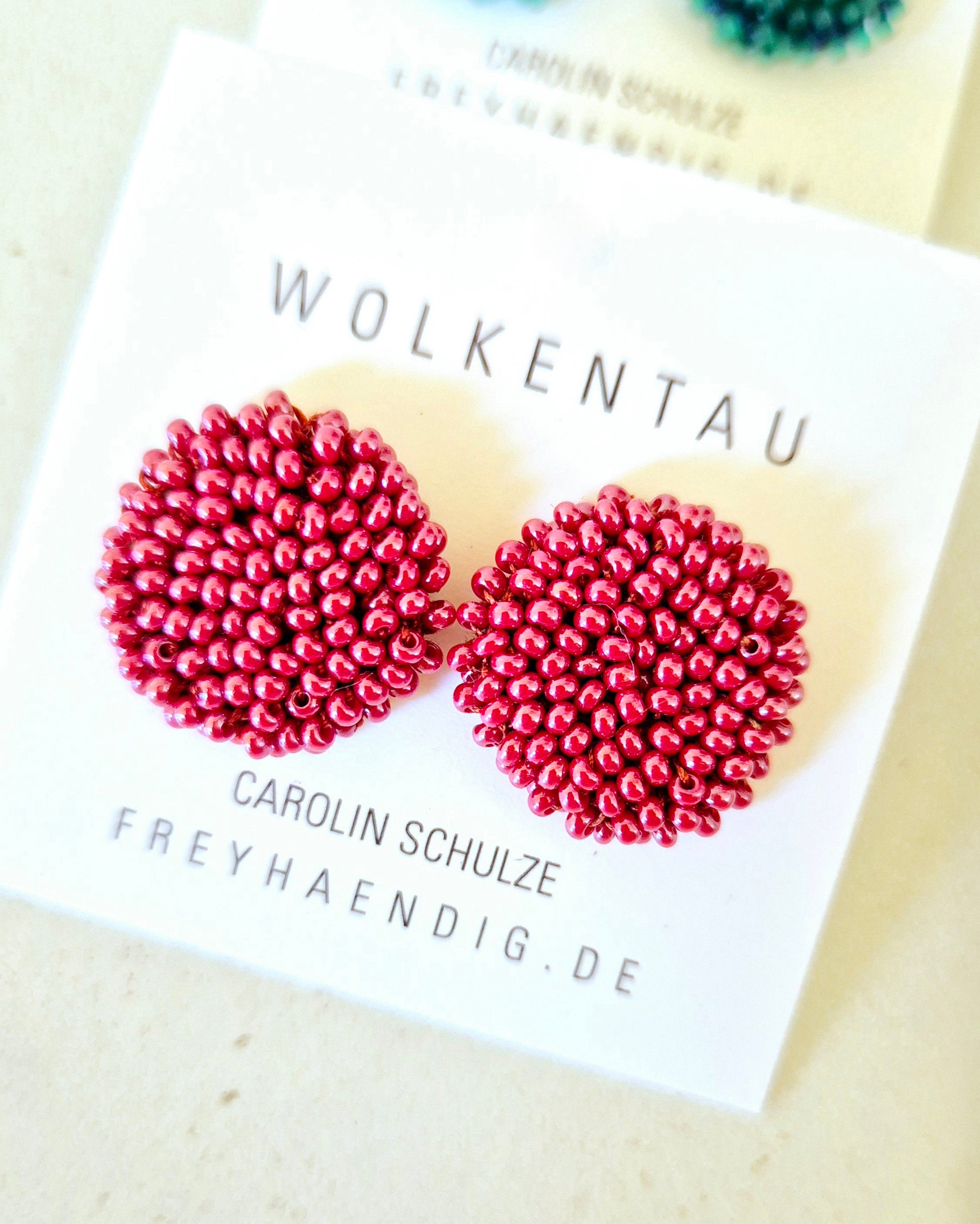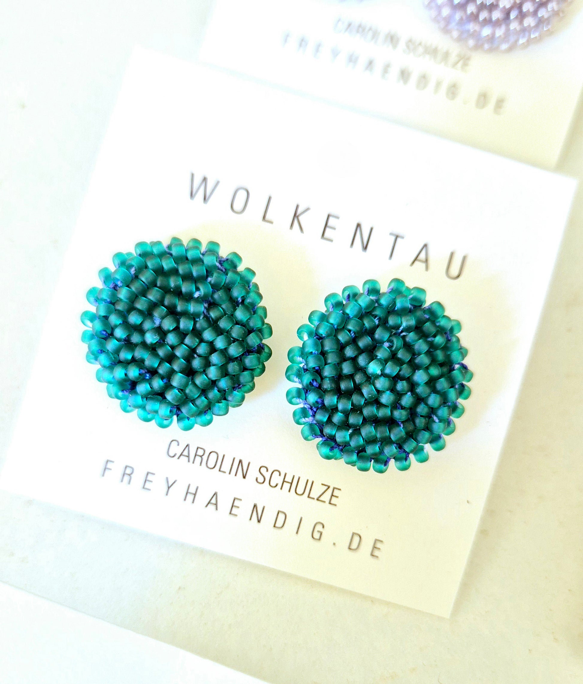 Einzigartige Ohrstecker LINNSI. Auf Baumwollgarn aufgezogene 2mm große Rocailles Glasperlen, in aufwändiger Häkeltechnik von Hand hergestellt. Die Stecker sind in Form einer Linse gehäkelt und vernäht. Der Schmuck kommt komplett ohne Kleber aus.