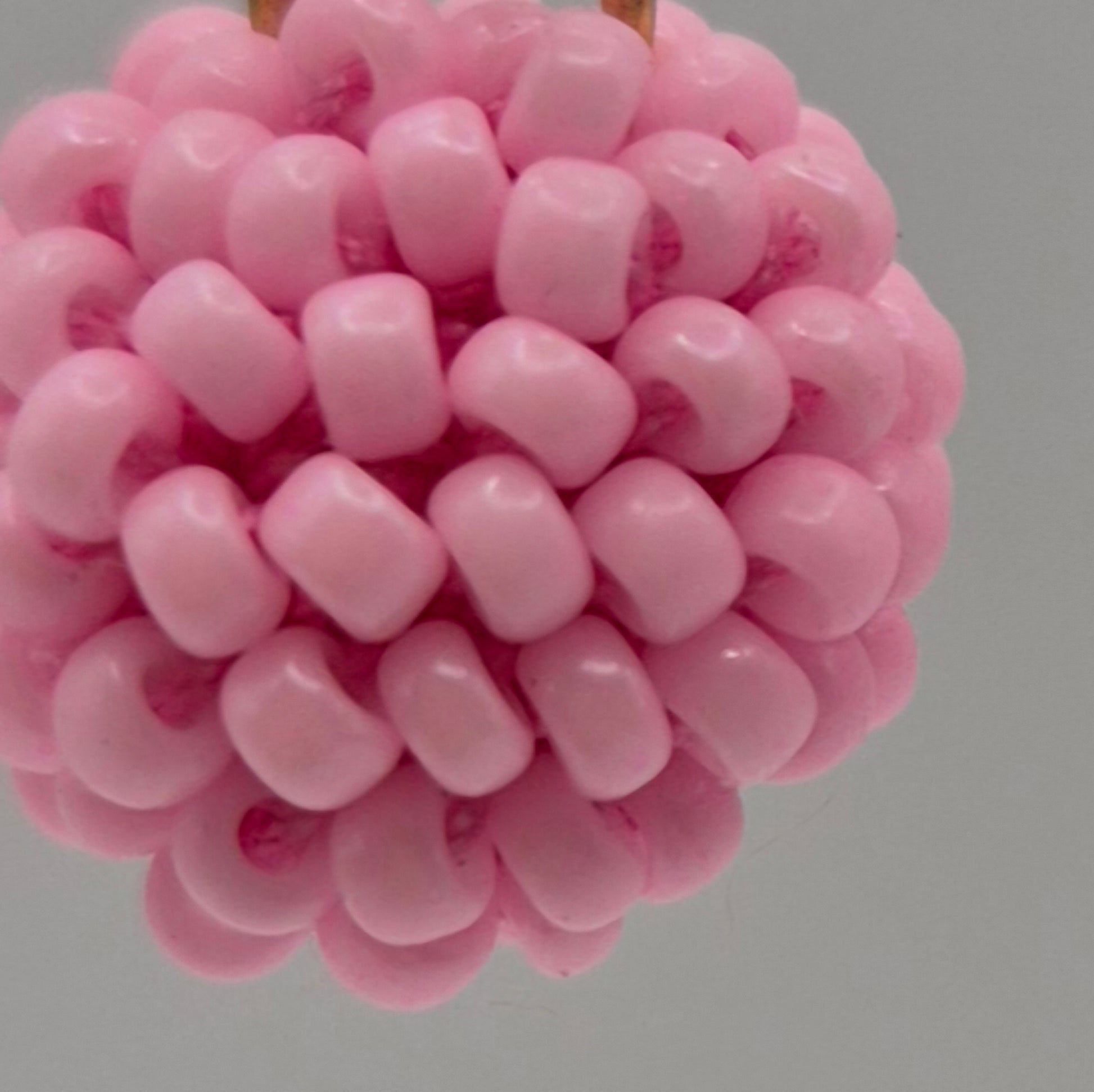 Einzigartige LINNSI Hänger für Ohrläppchen ohne Löcher. Auf Baumwollgarn aufgezogene 2mm große Rocailles Glasperlen, in aufwändiger Häkeltechnik von Hand hergestellt. Die Ohrringe haben jeweils einen Anhänger in Form einer Kugel gehäkelt und vernäht. Die Öse ist eingehäkelt und vernäht. Der Schmuck kommt komplett ohne Kleber aus.