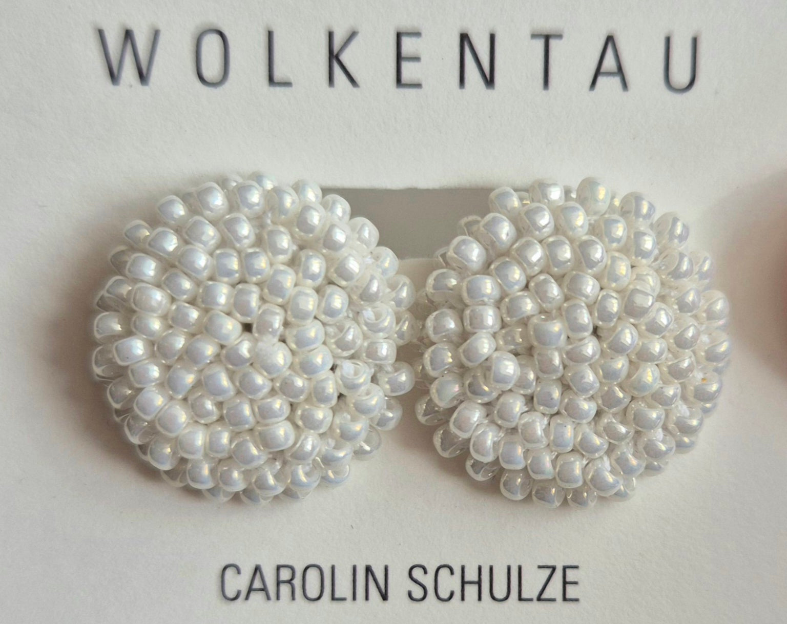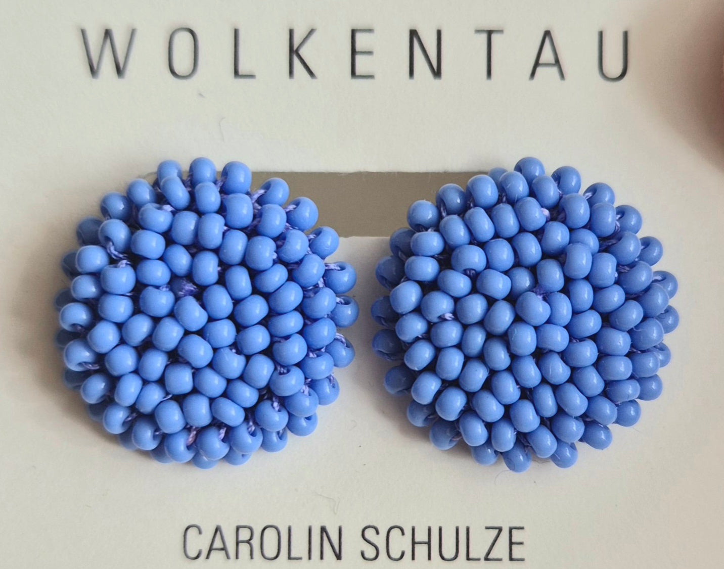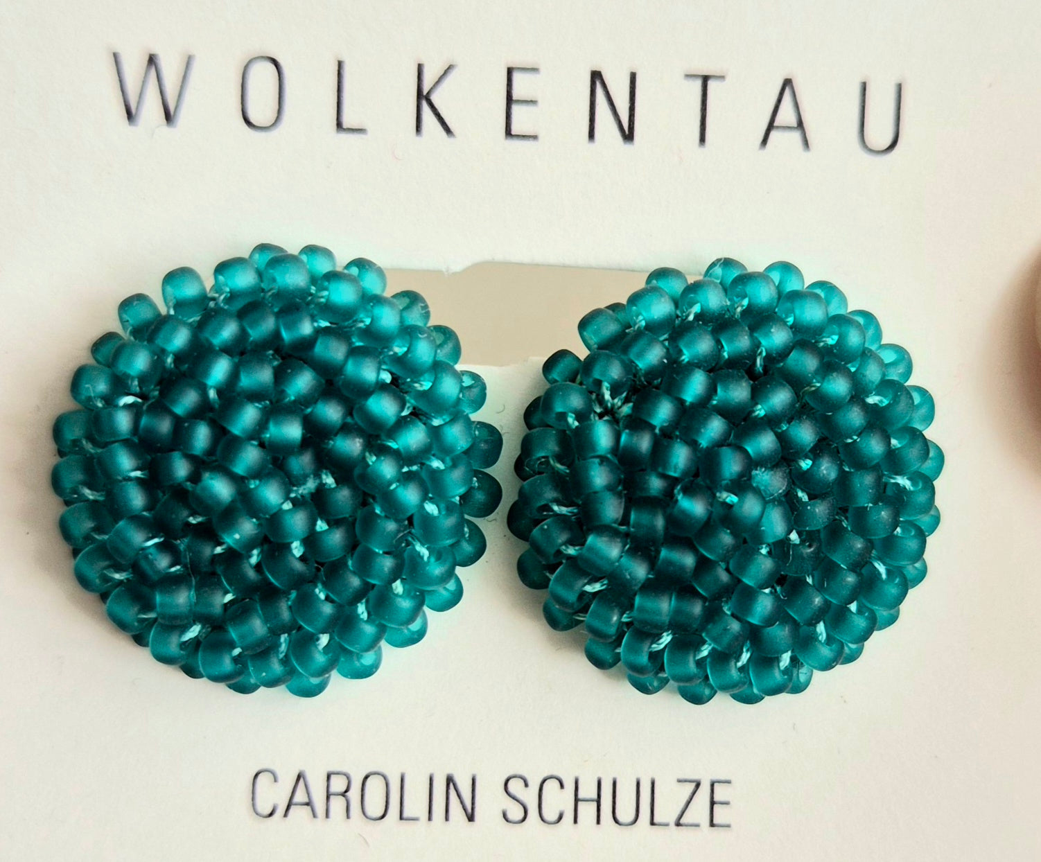 Einzigartige LINNSI Clips für Ohrläppchen ohne Löcher. Auf Baumwollgarn aufgezogene 2mm große Rocailles Glasperlen, in aufwändiger Häkeltechnik von Hand hergestellt. Die Ohrringe haben jeweils einen Anhänger in Form einer Kugel gehäkelt und vernäht. Die Öse ist eingehäkelt und vernäht. Der Schmuck kommt komplett ohne Kleber aus.