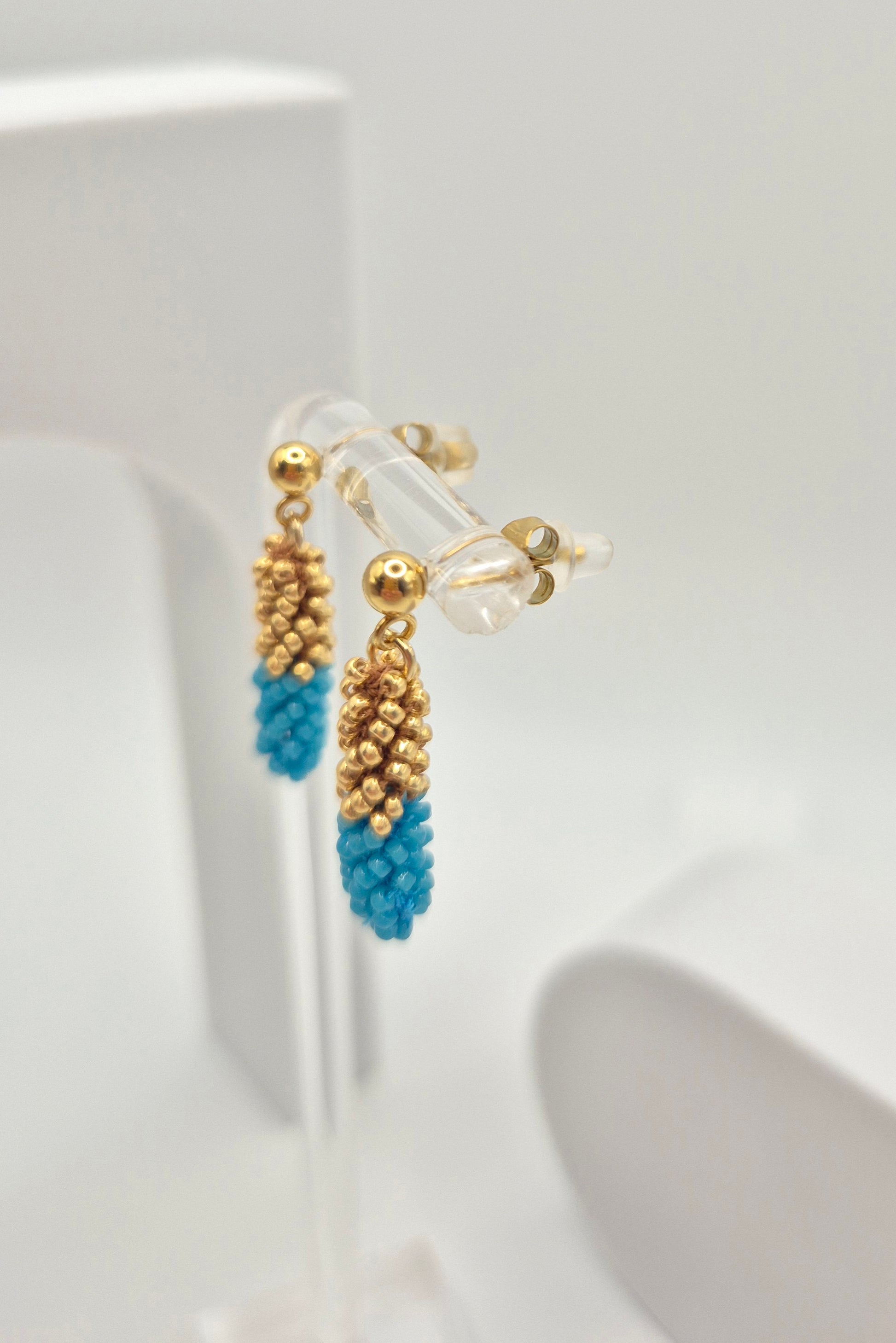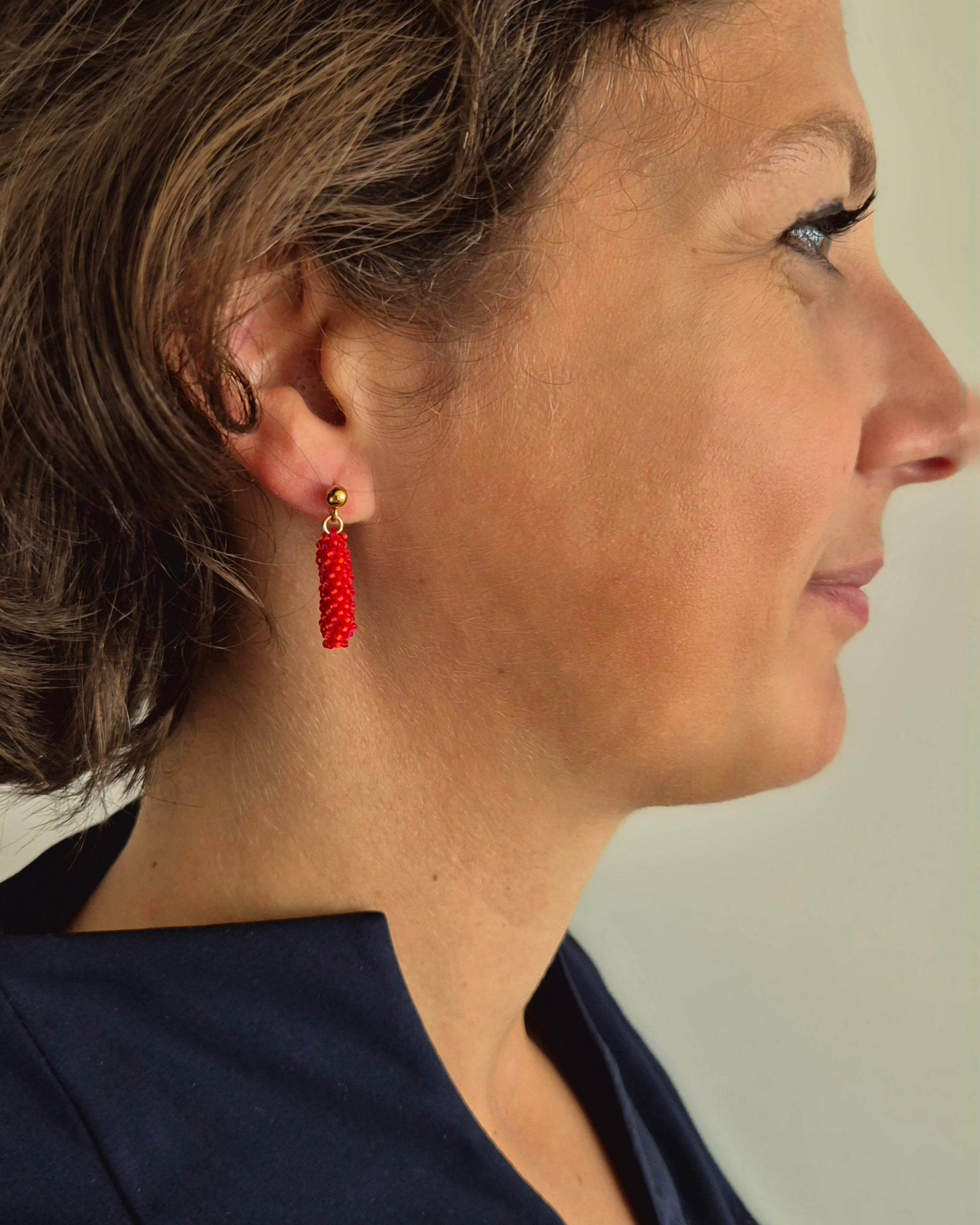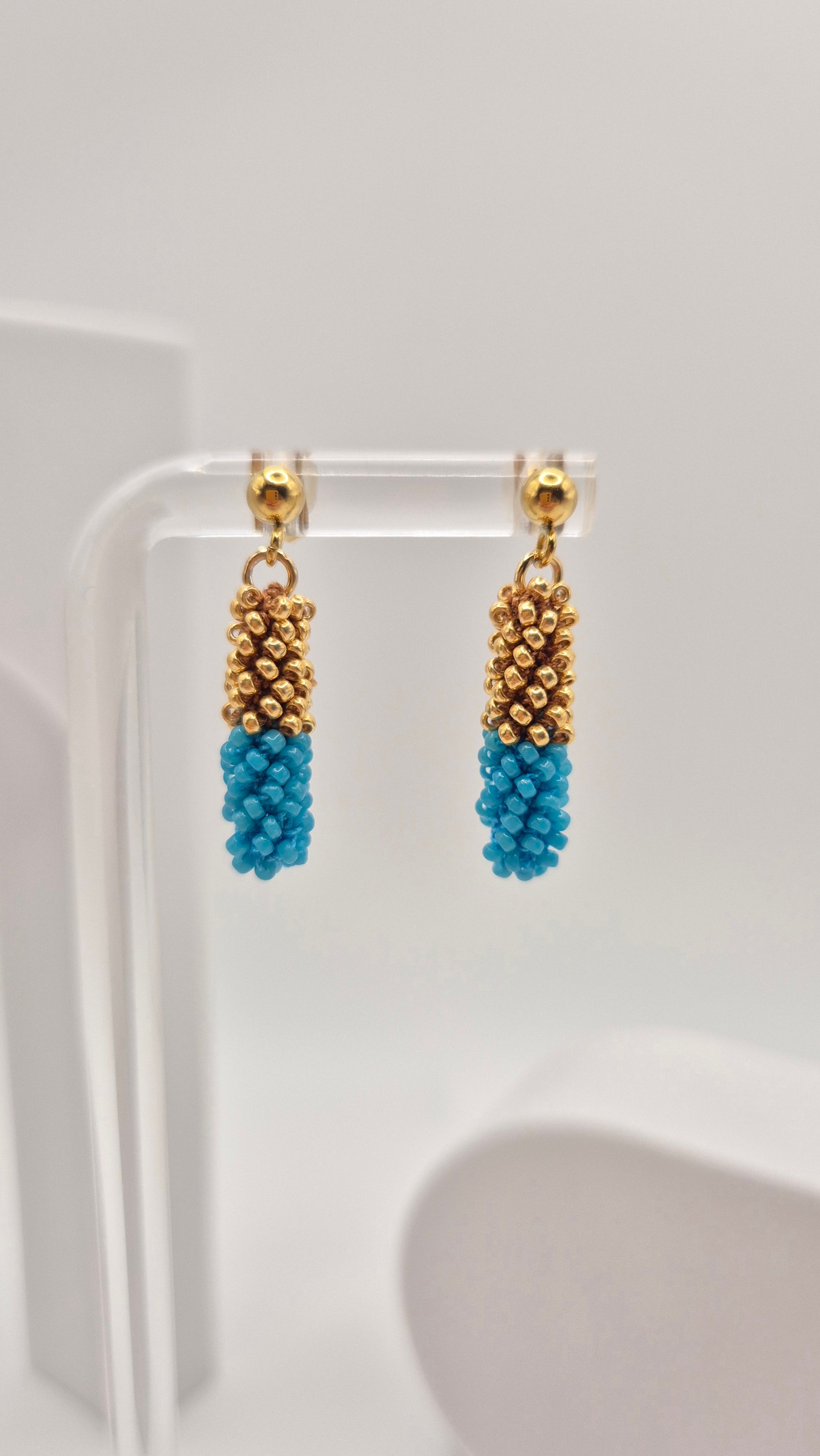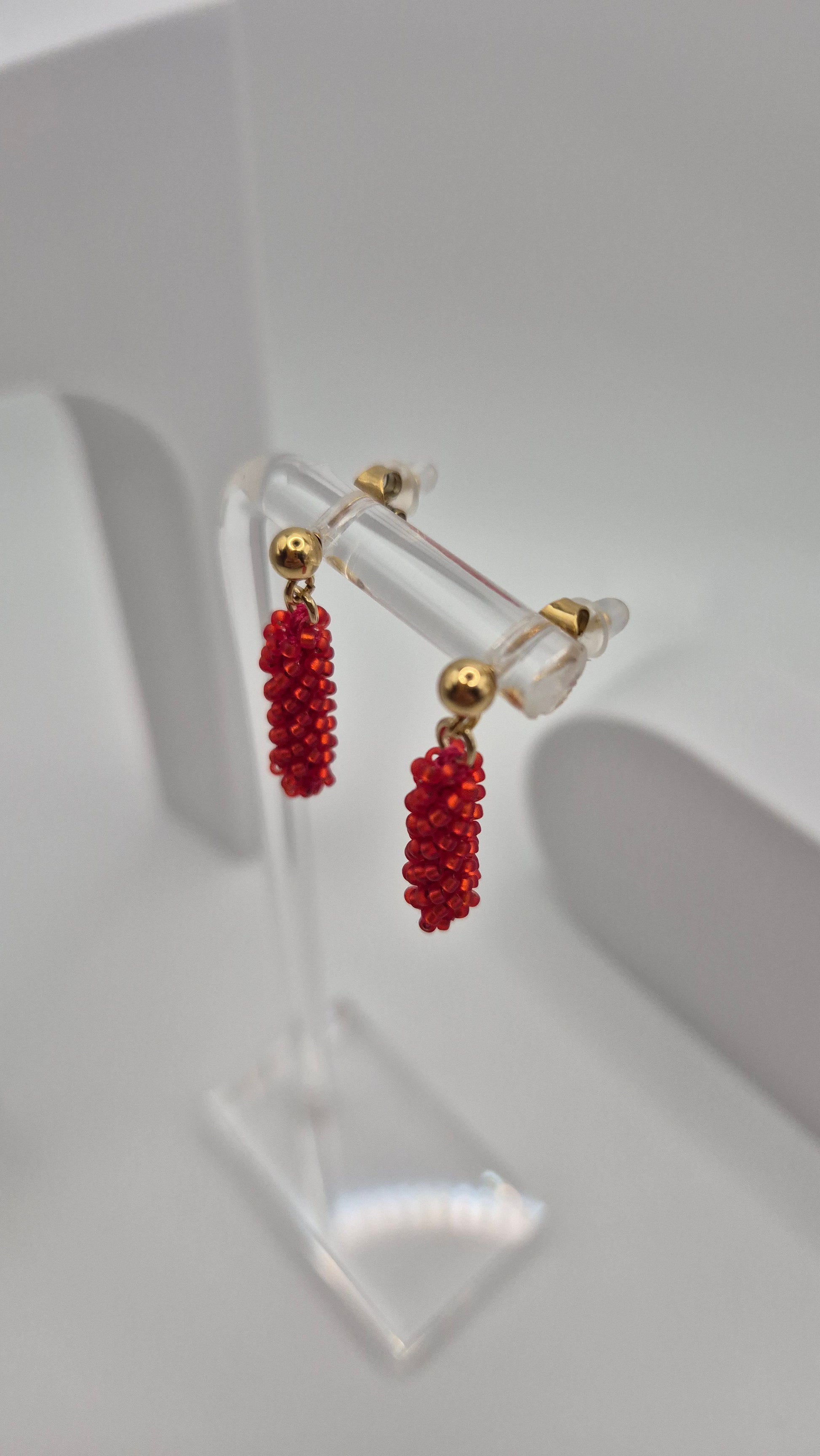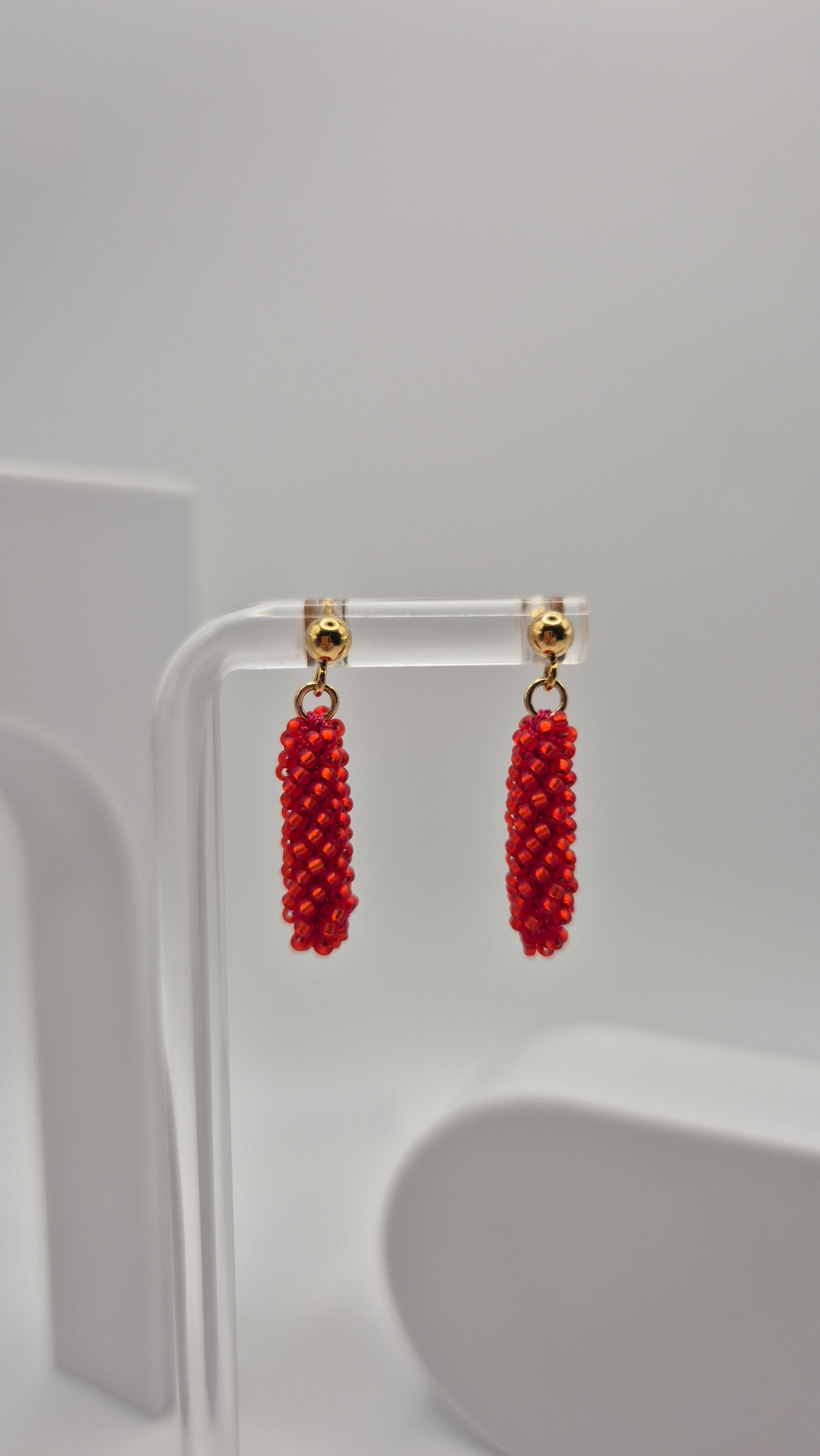 Einzigartige Ohrstecker Hänger STICK midi. Auf Baumwollgarn aufgezogene 1mm große Rocailles Glasperlen, in aufwändiger Häkeltechnik von Hand hergestellt.